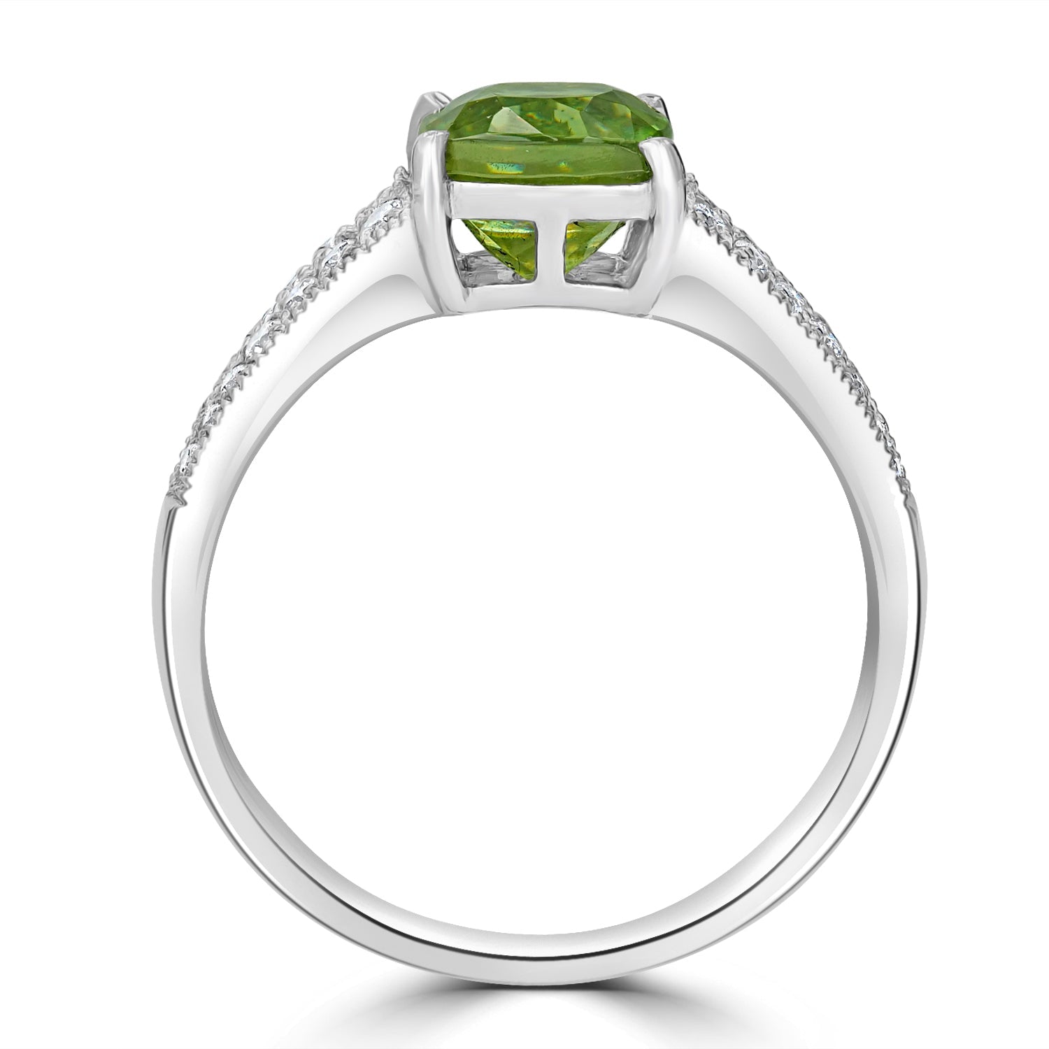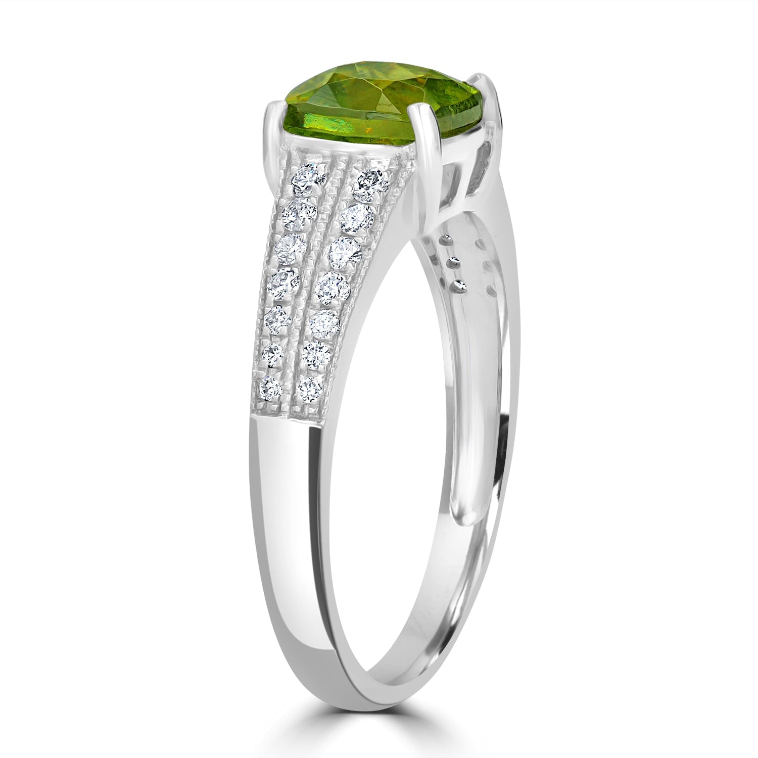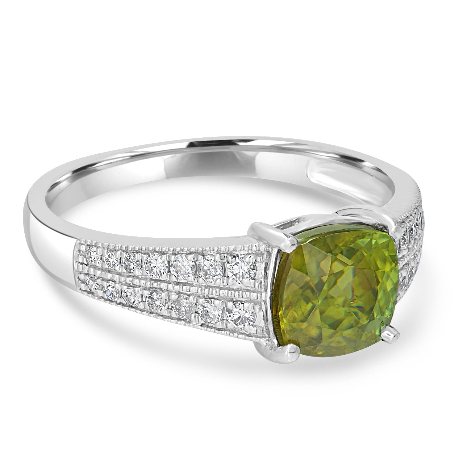 Perfect for special occasions, this 14k white gold ring is set with cushion-cut Sphene and round Diamonds, a visual delight.