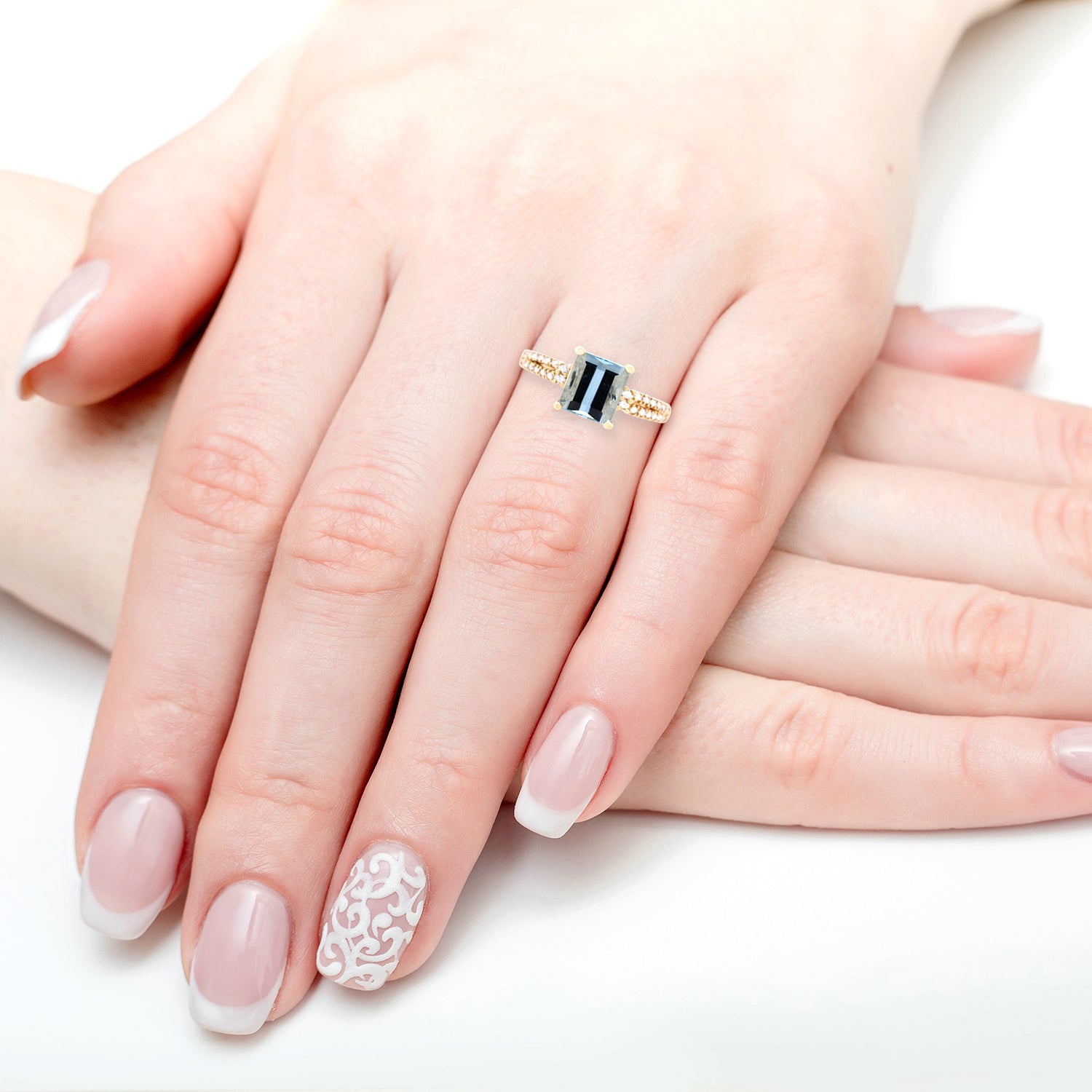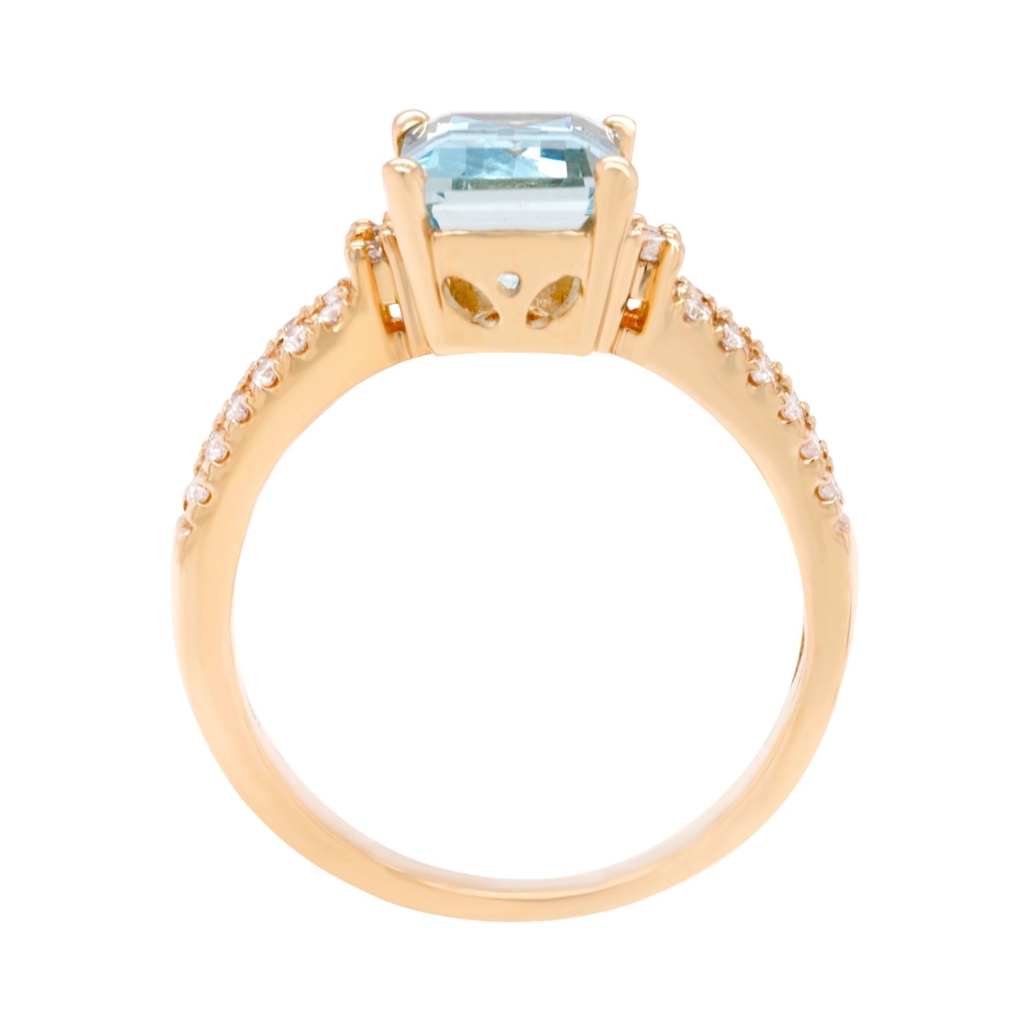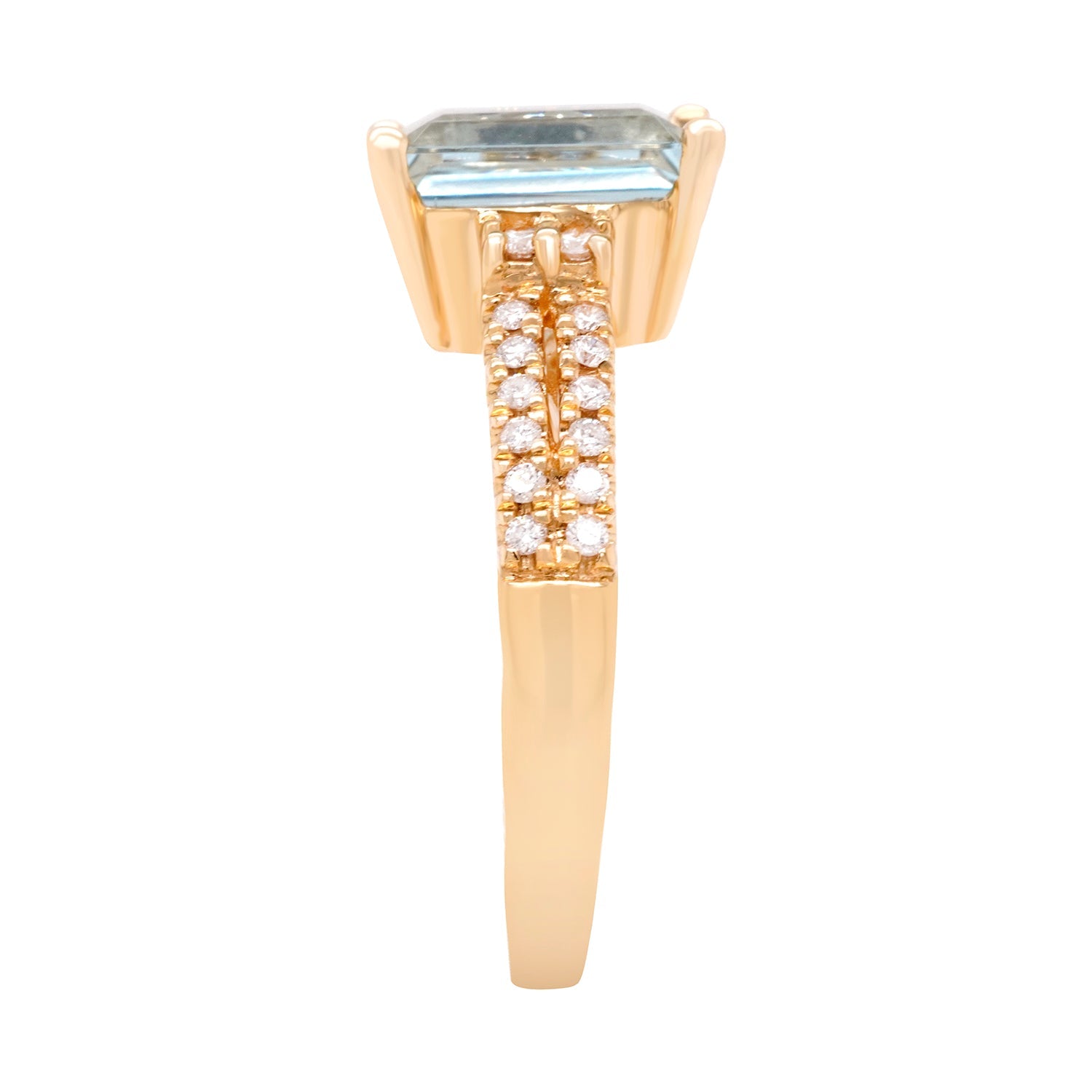 This ring is best known for its stylish design in 14k yellow gold that is highlighted with an emerald cut Aquamarine and round Diamonds. This jewelry is all you need to unwind your uniqueness.