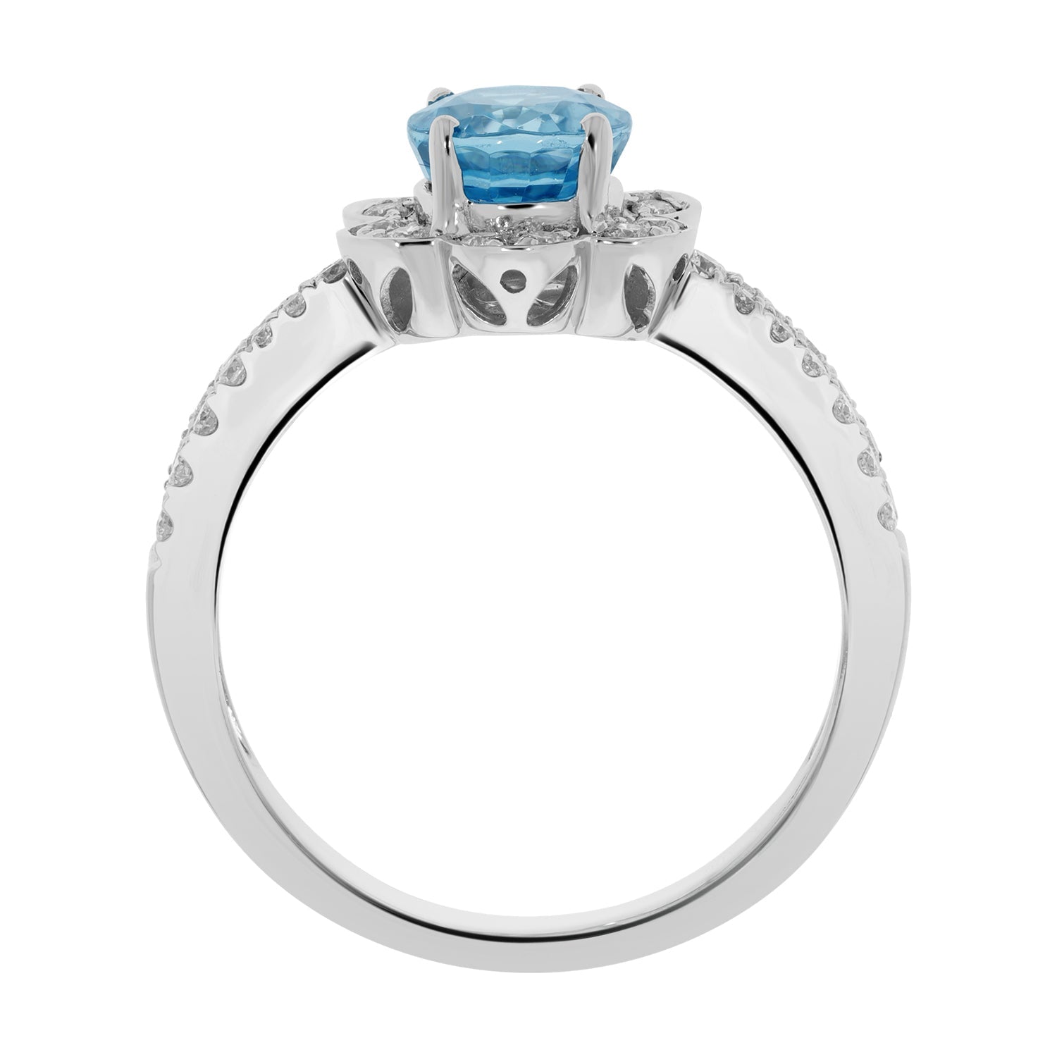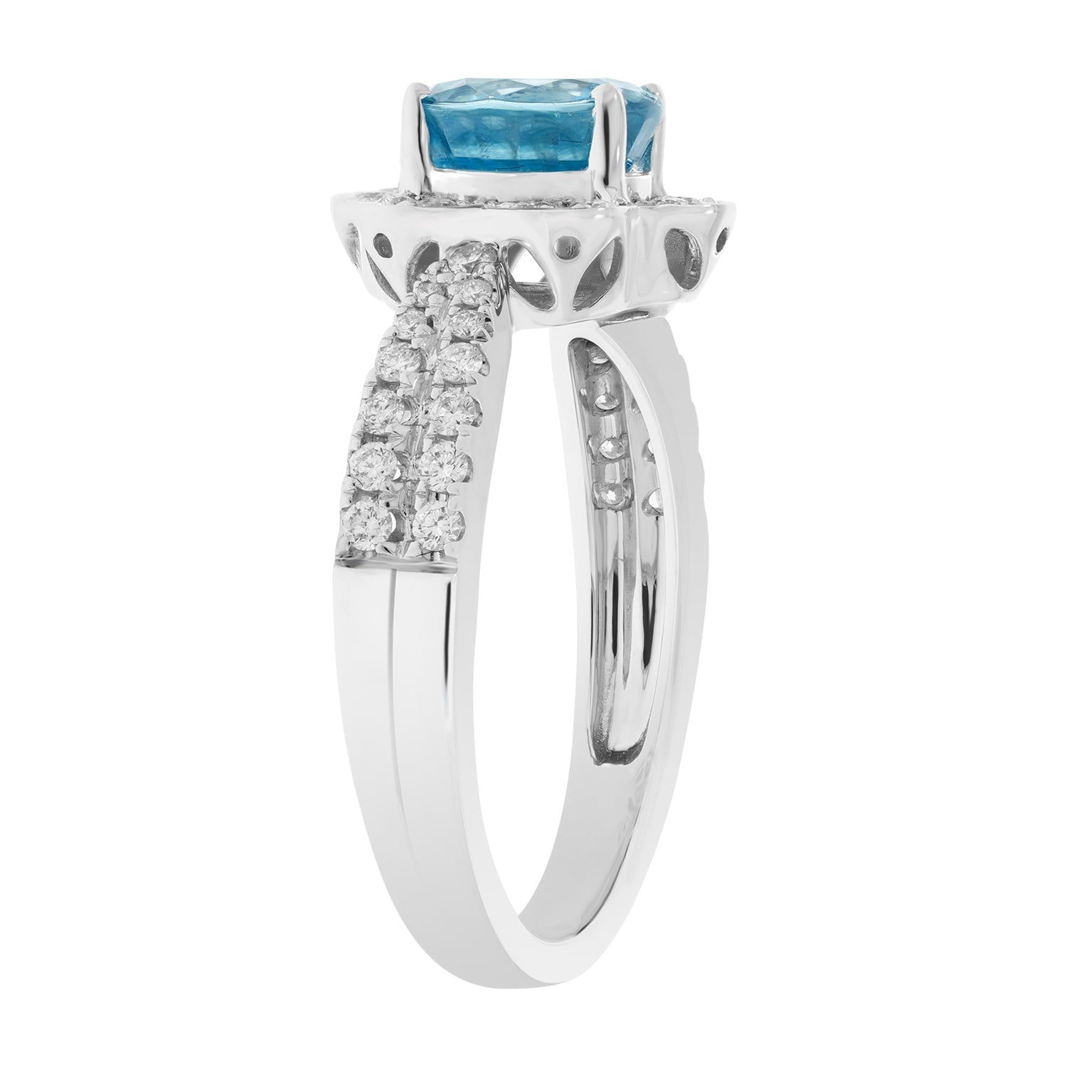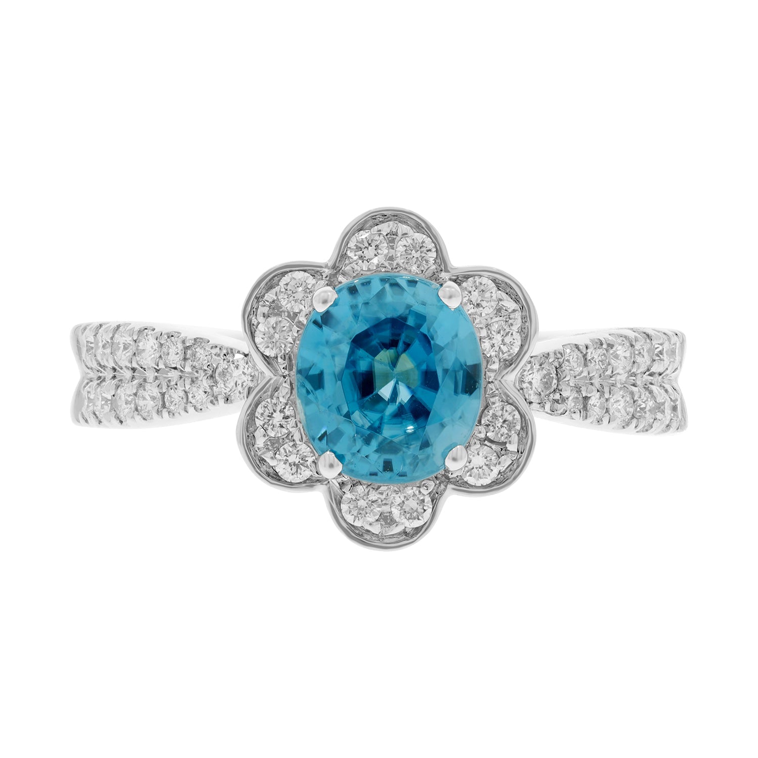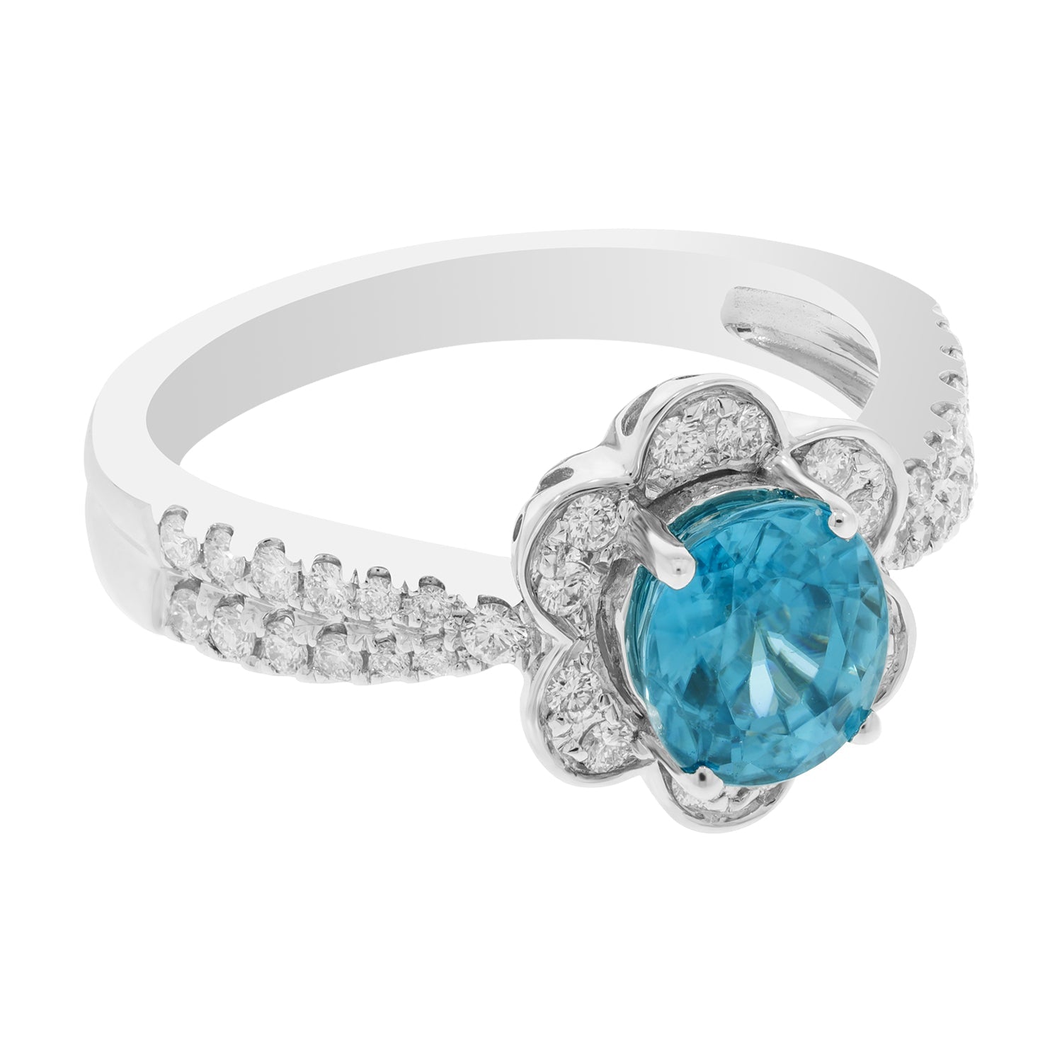 Crafted in 14kt white gold, this ring is a perfect style pick that gels well with both classic and modern outfits. The glamorous ring is finely crafted of 14kt white gold and adorned with oval-cut blue Zircon and round Diamonds that lend a luxurious look to the piece.