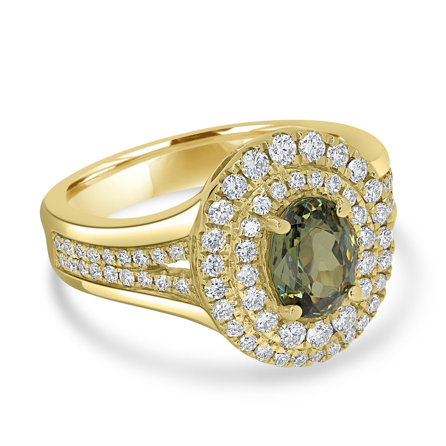 This timeless 14K yellow gold ring is set with an oval-cut Demantoid Garnet and round Diamonds that will mesmerize the people around you.