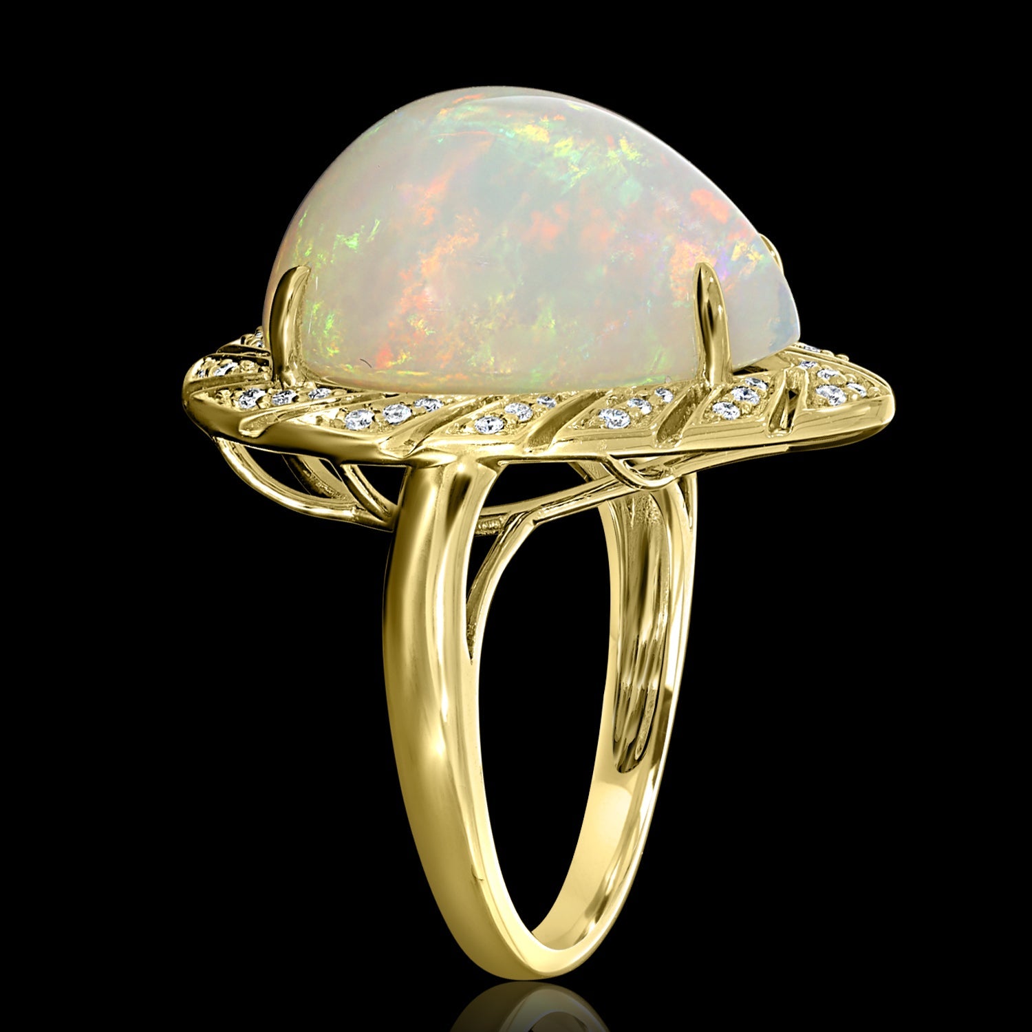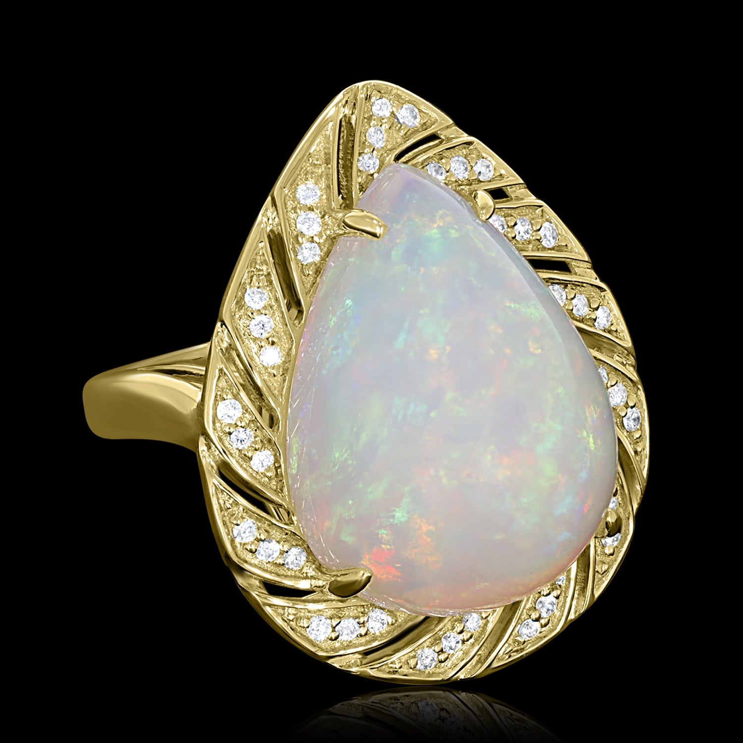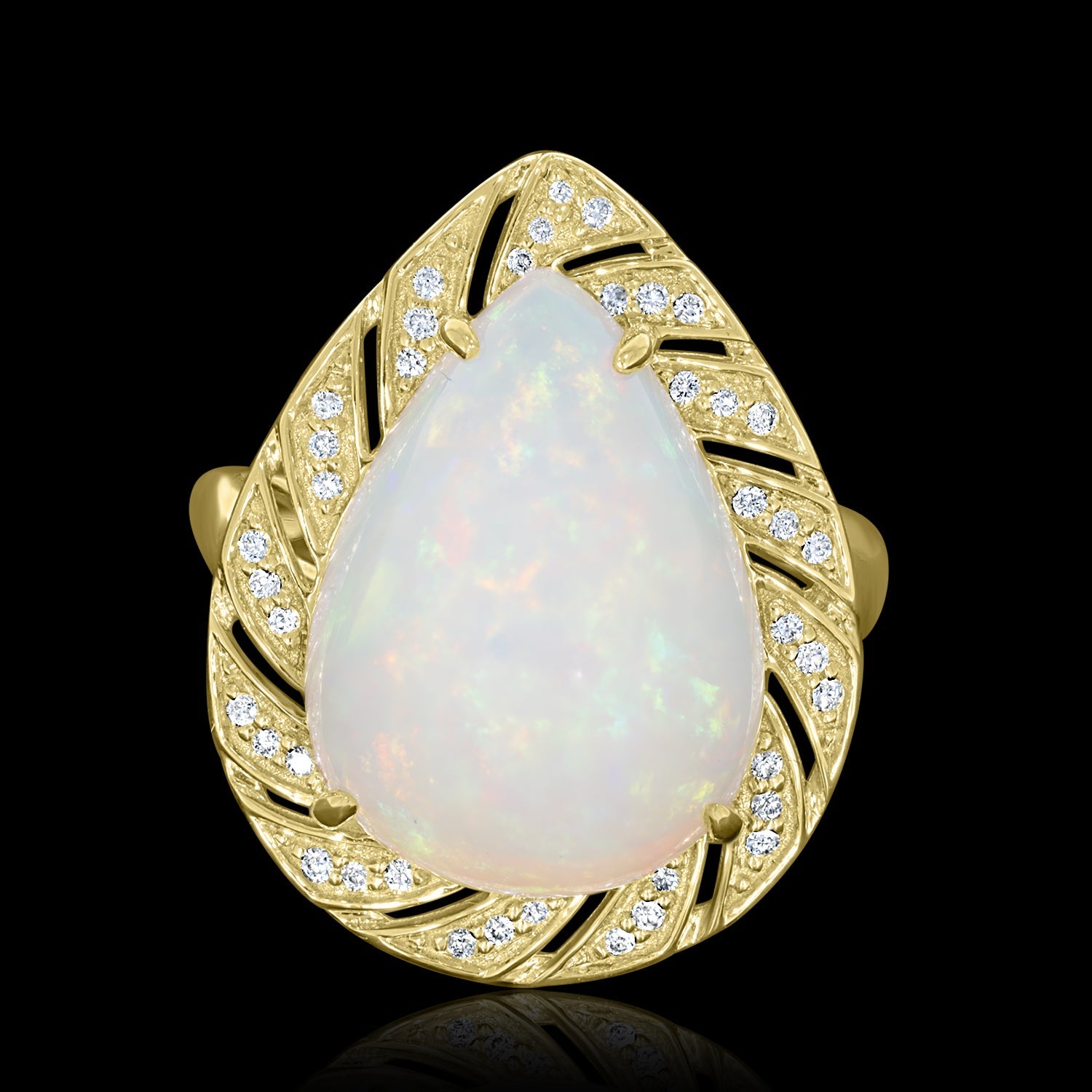 This beautiful ring is crafted from 14k yellow gold and set with a pear-cut Opal and round Diamonds.