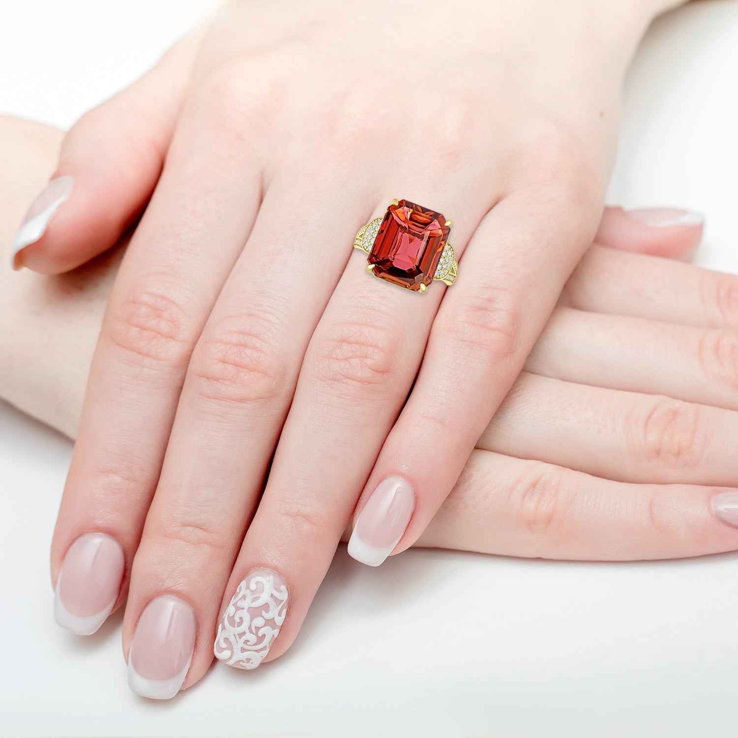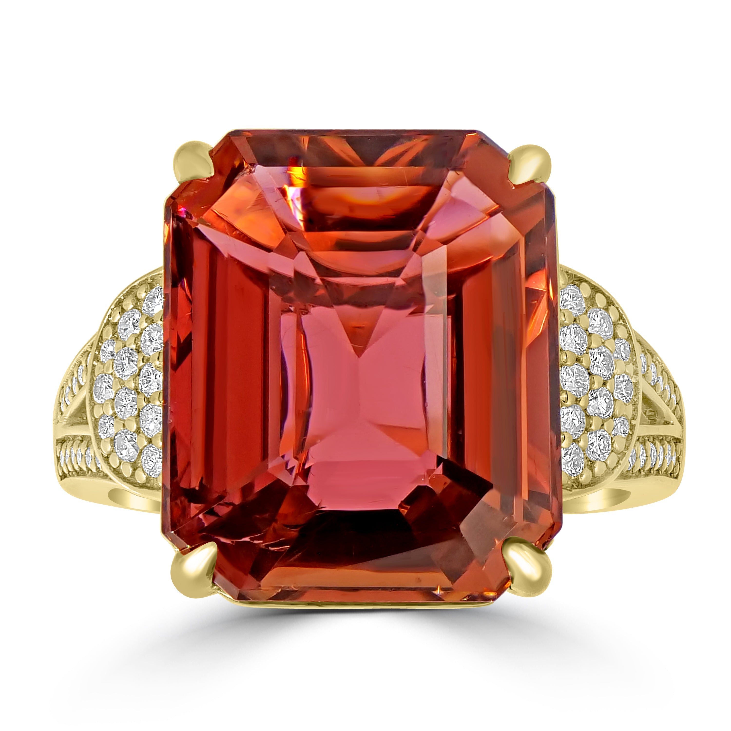 Designed of 18k rose gold with attention to fine detailing for added charm, this beautiful ring is the perfect jewelry for any occasion. Glorious cushion-cut Tourmaline and Diamonds embellished in the ring add drama and lends that incredible uniqueness.