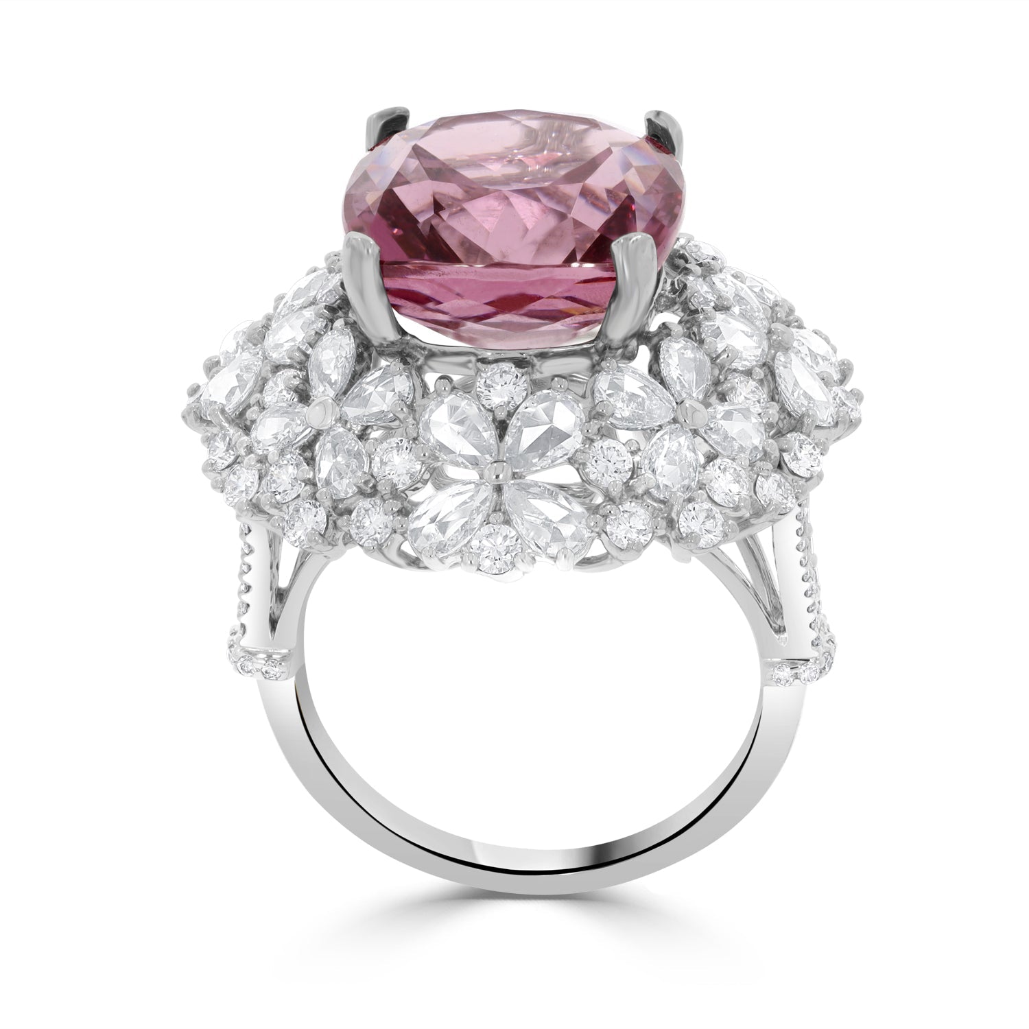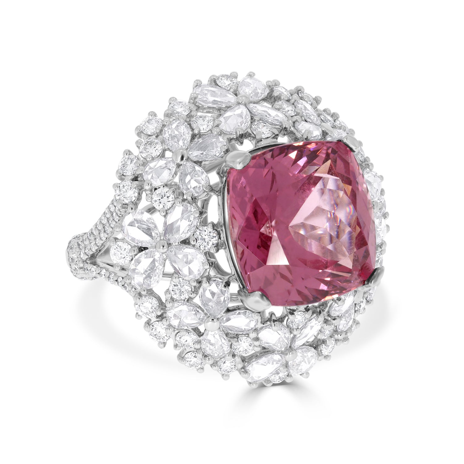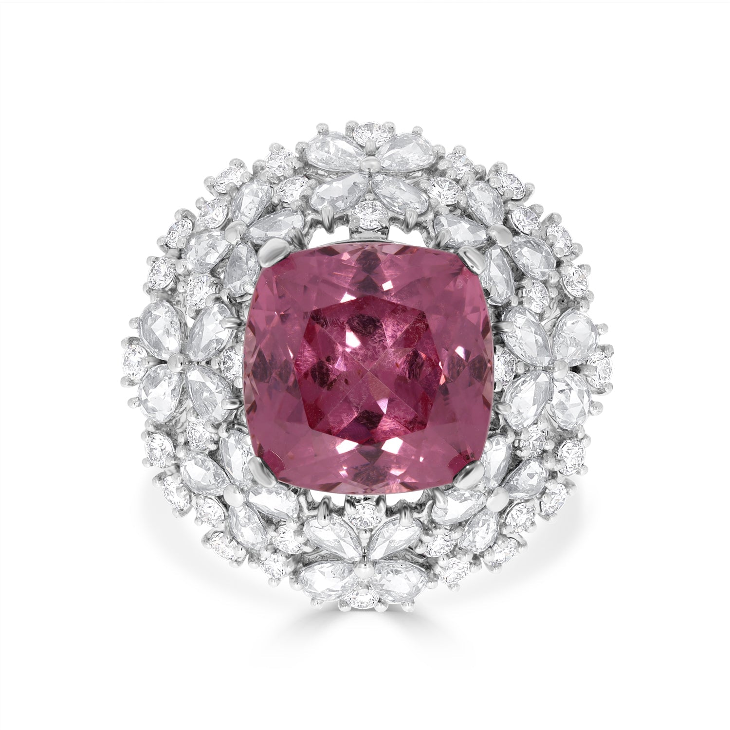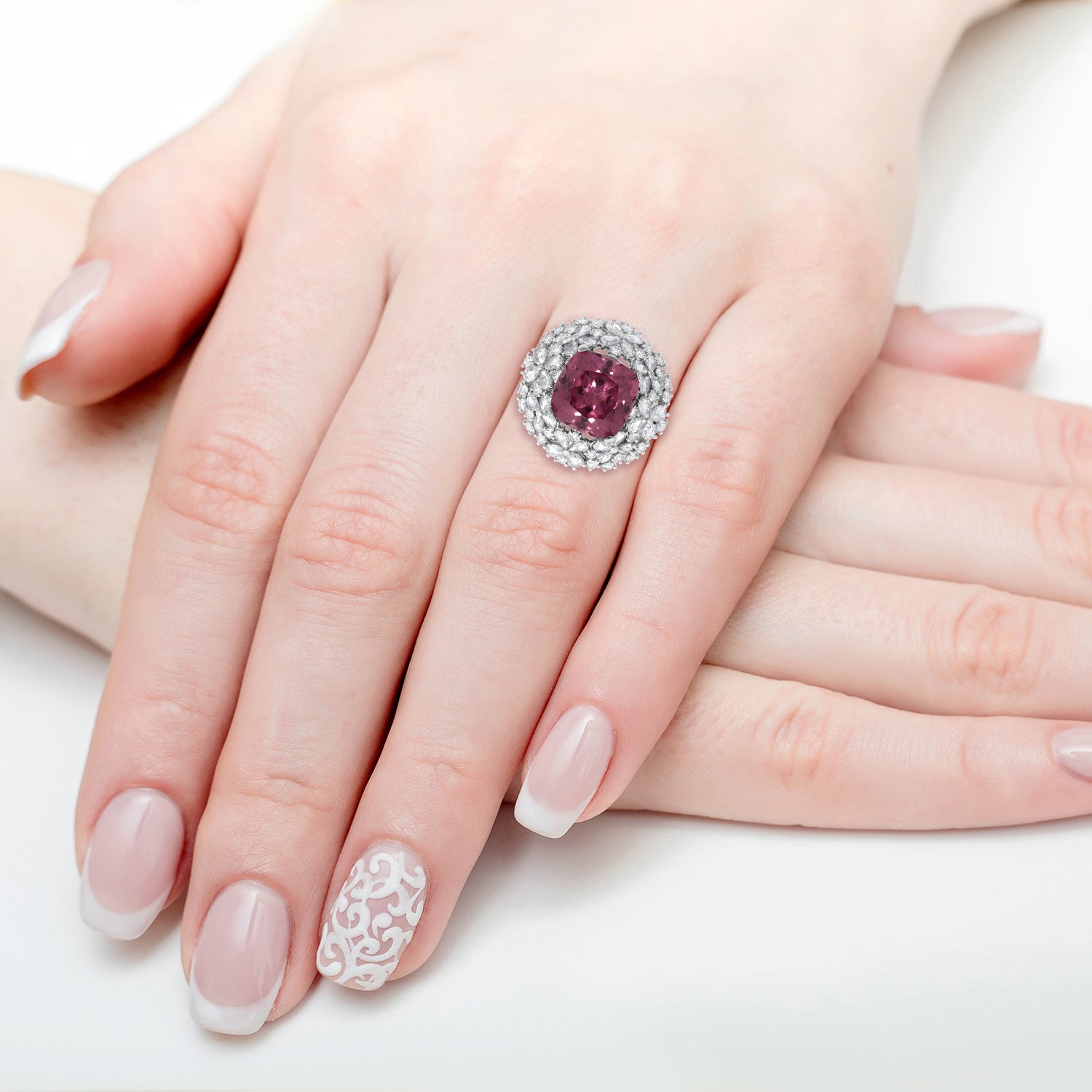 Set with an eye-catching square cushion cut Pyrope Spessartite Garnet, this radiant ring is designed with luminous 18K white gold. Surrounded by glittering mix cut Diamonds, this beautiful piece is the perfect for every occasion.