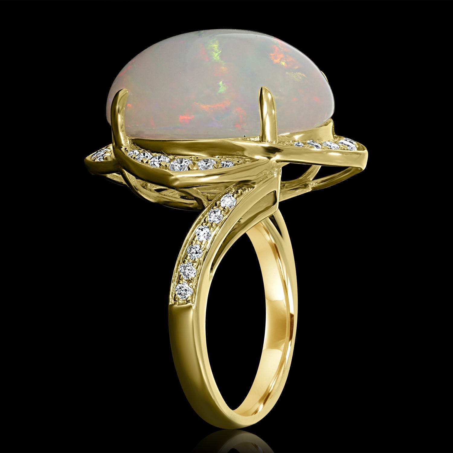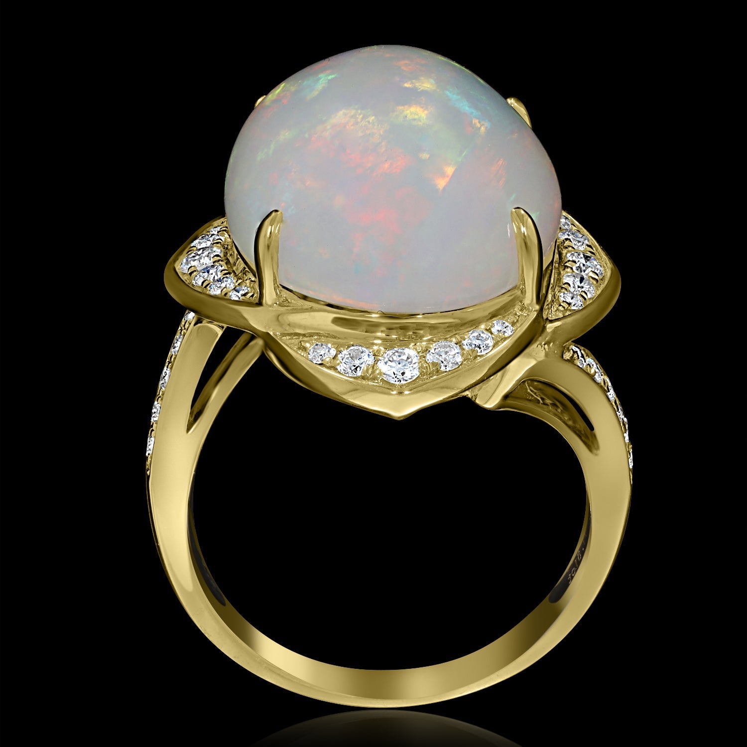 This shimmering ring that is crafted from 14k yellow gold. The oval-cut Opal and round Diamonds make a lasting impression.