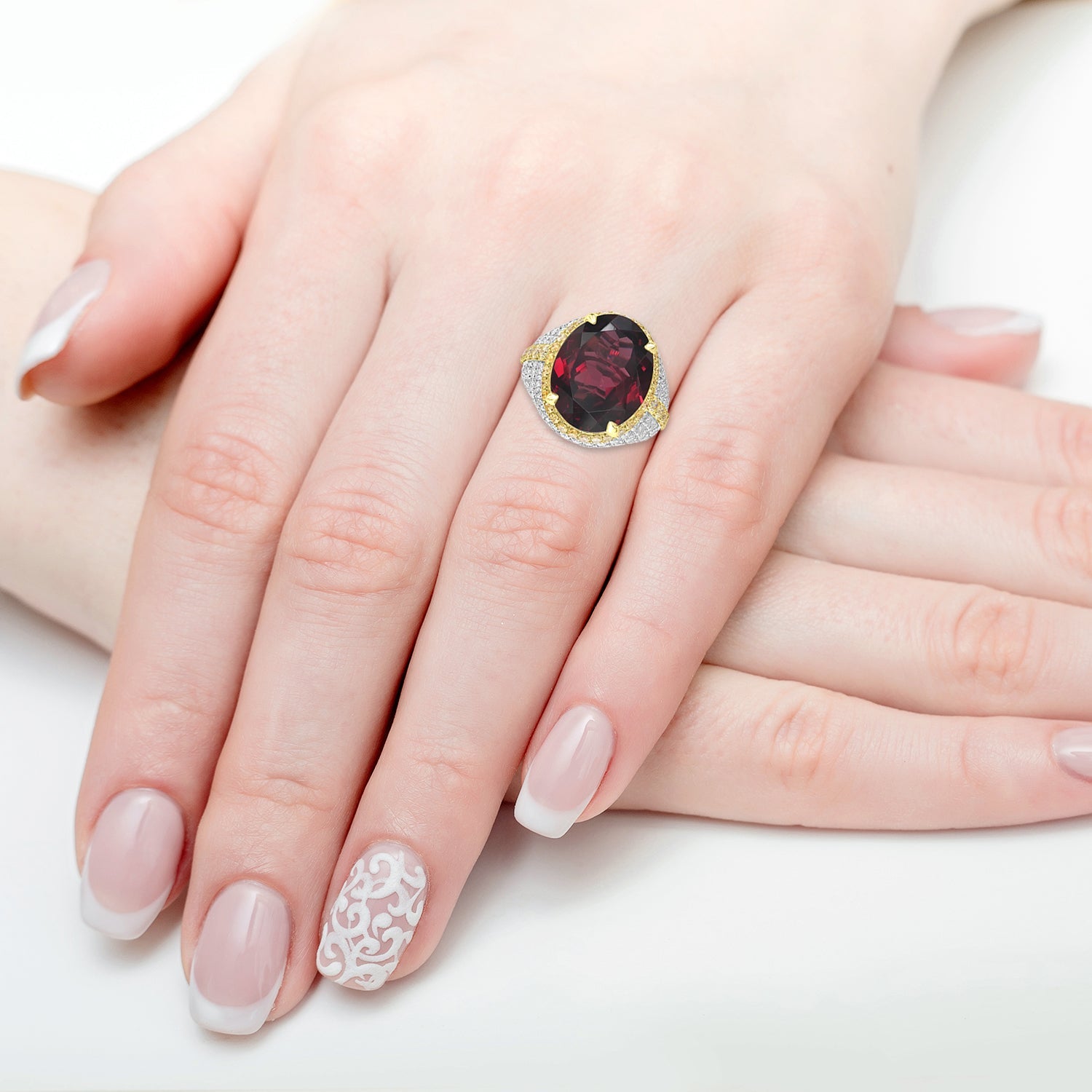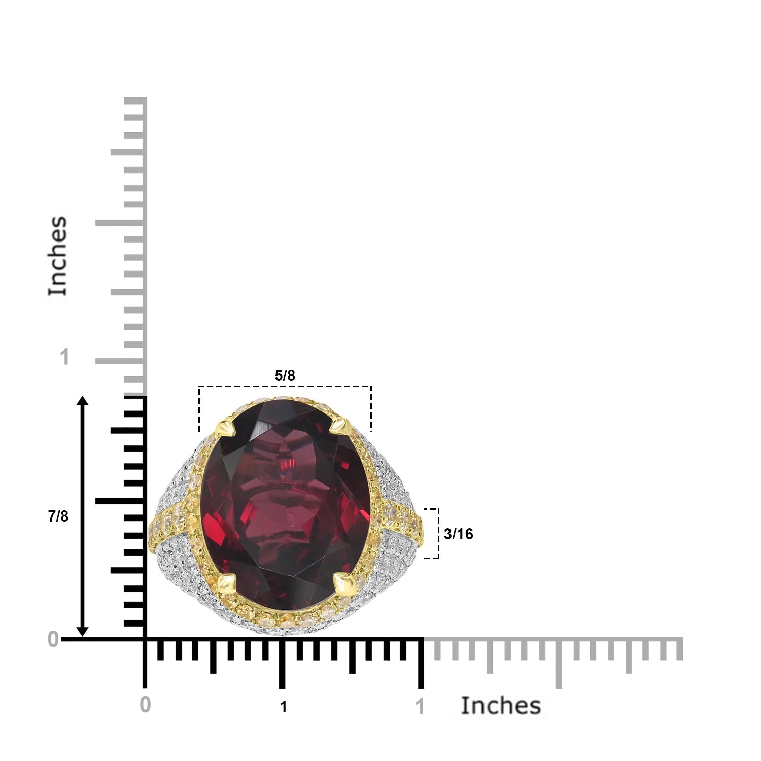 Crafted of 18k two-tone gold, this ring is sure to offer an eye-catchy appeal. The opulent oval-cut Rhodolite Garnet and round Diamonds are a statement of grandeur.