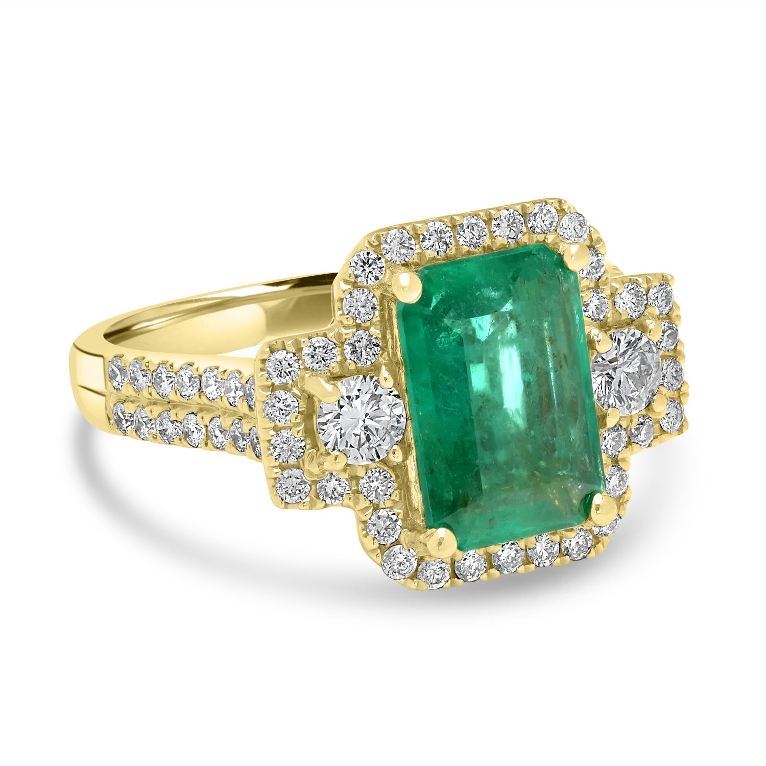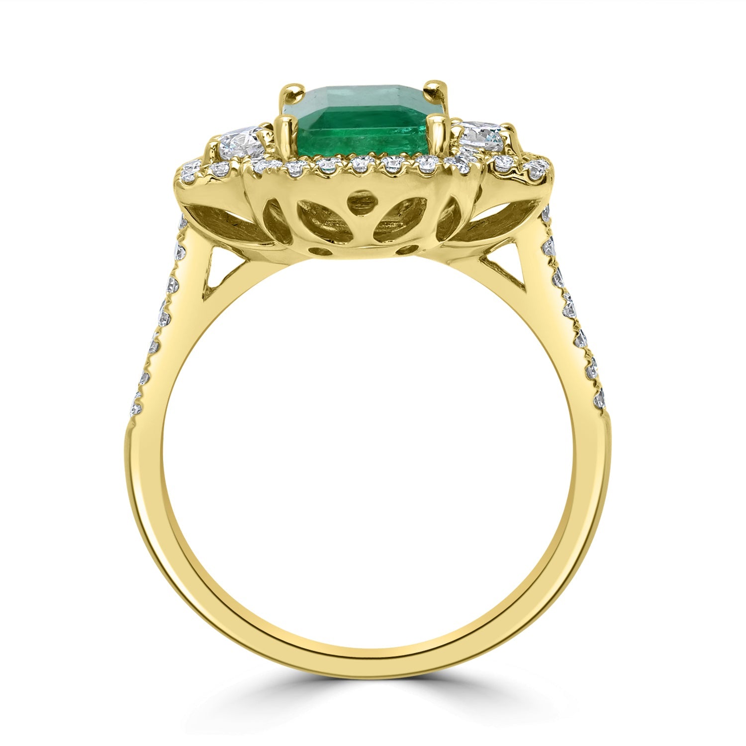Designed with 14k yellow gold, this timeless ring is set with an emerald-cut Emerald and round Diamonds that are sure to mesmerize.