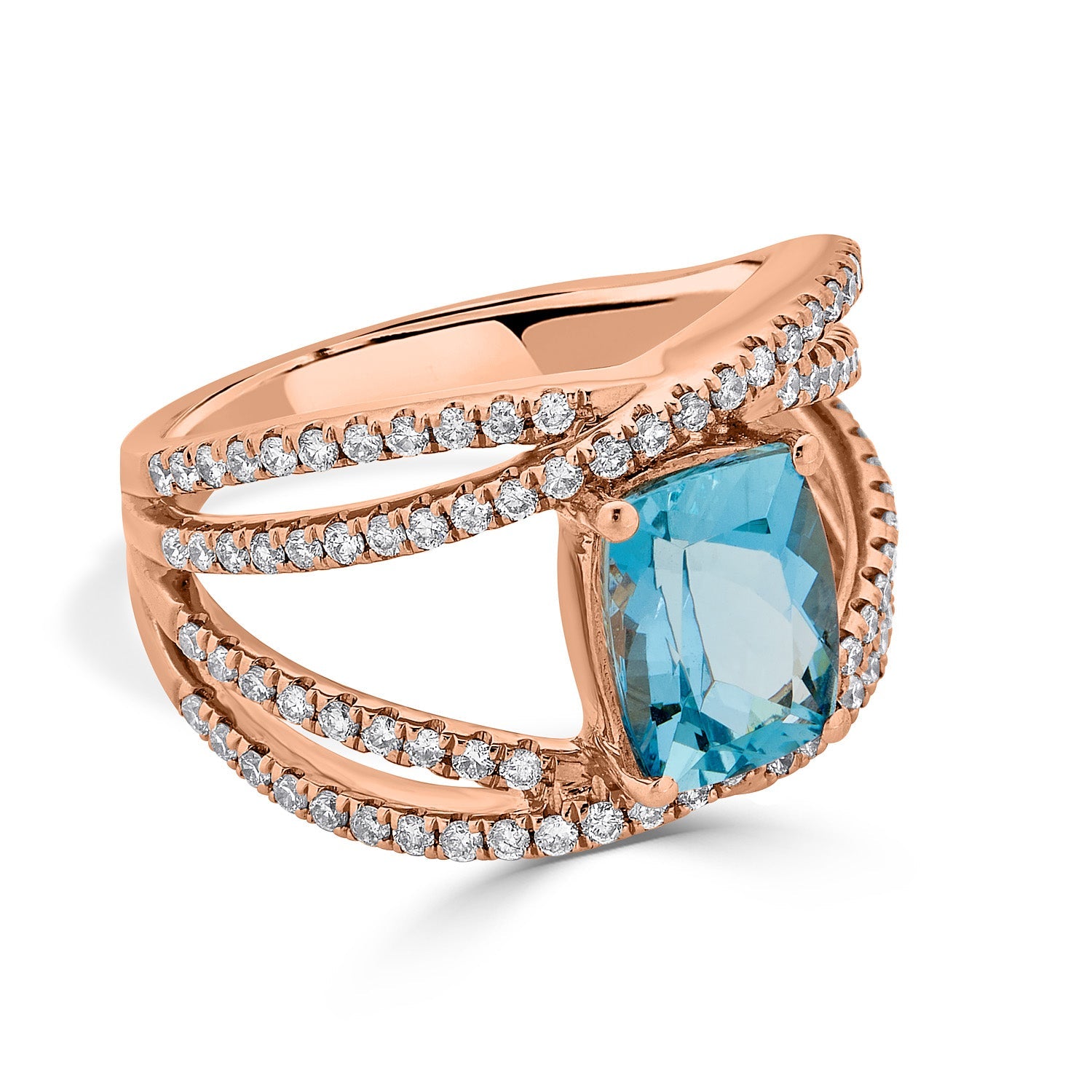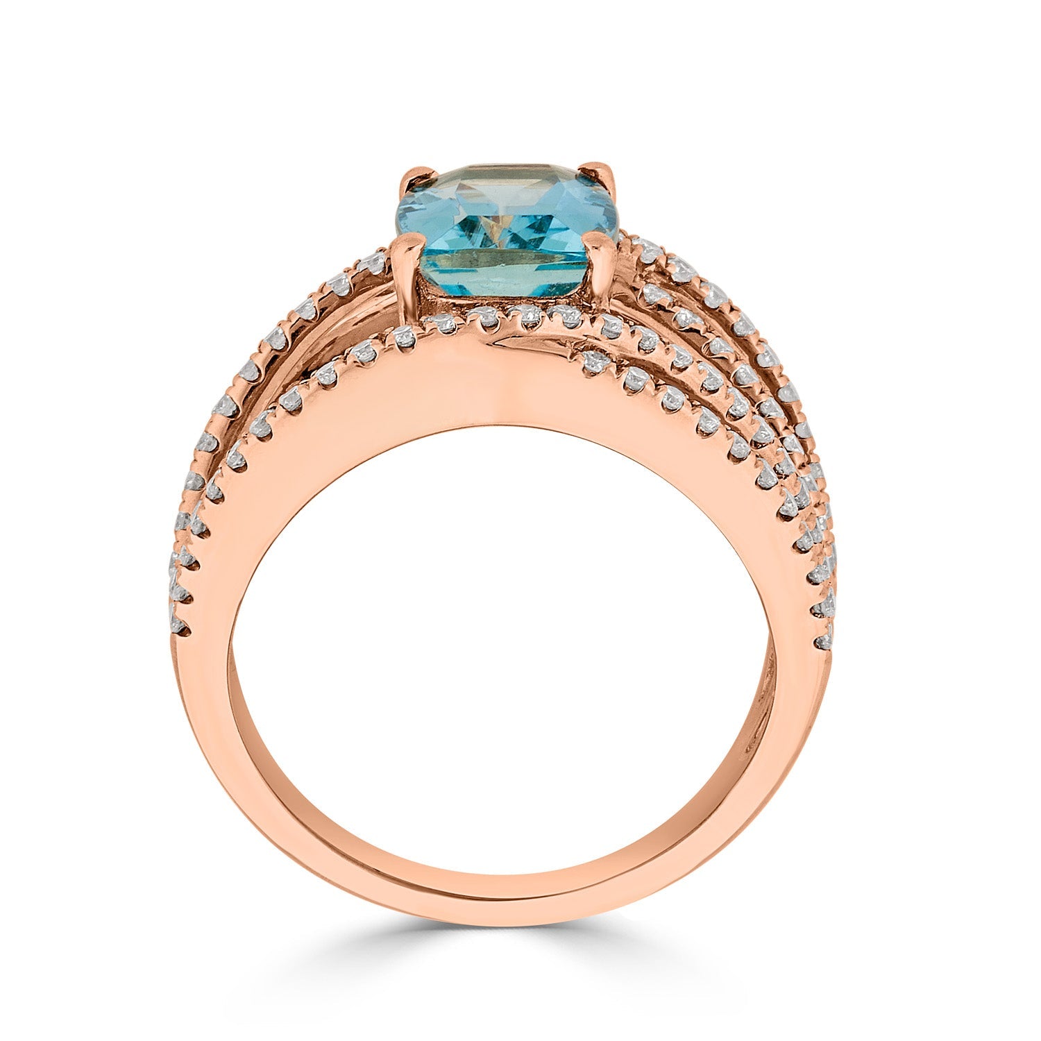 A dazzling blend of color and design, this gorgeous ring is Designed with a stunning cushion cut Aquamarine, which is encircled by shimmering round cut Diamonds. Crafted of 14K rose gold, this marvelous jewelry complements your elegance perfectly.
