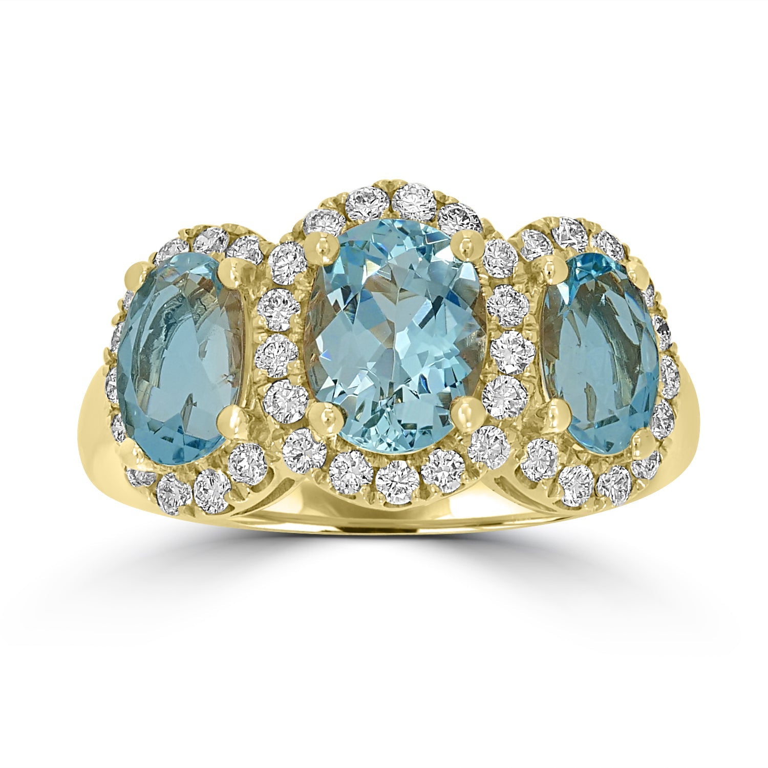 This grandiose 14K yellow gold ring is a great accessory when the occasion calls for a special bit of sparkle. The enchanting ring is set with oval-cut Aquamarine and round Diamonds to give it a sophisticated look. A high-class design to make your outfit a charming ensemble!