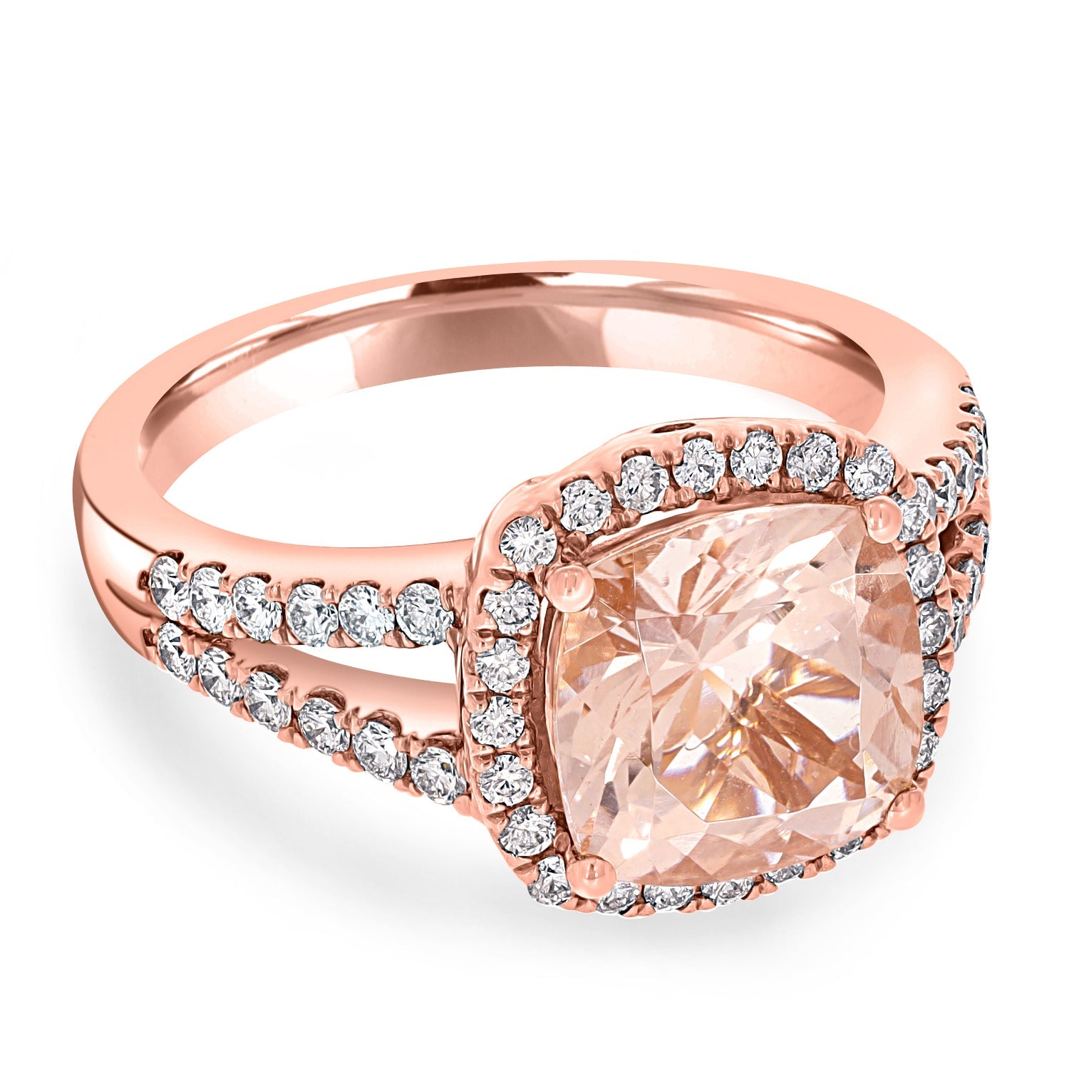 Set with cushion cut Morganite and round cut Diamonds, this magnificent ring is a must-have for fashionistas. Artistically designed of 14K rose gold, this stunning ring is treasured for its natural beauty and radiance that gives you a mesmerizing look.