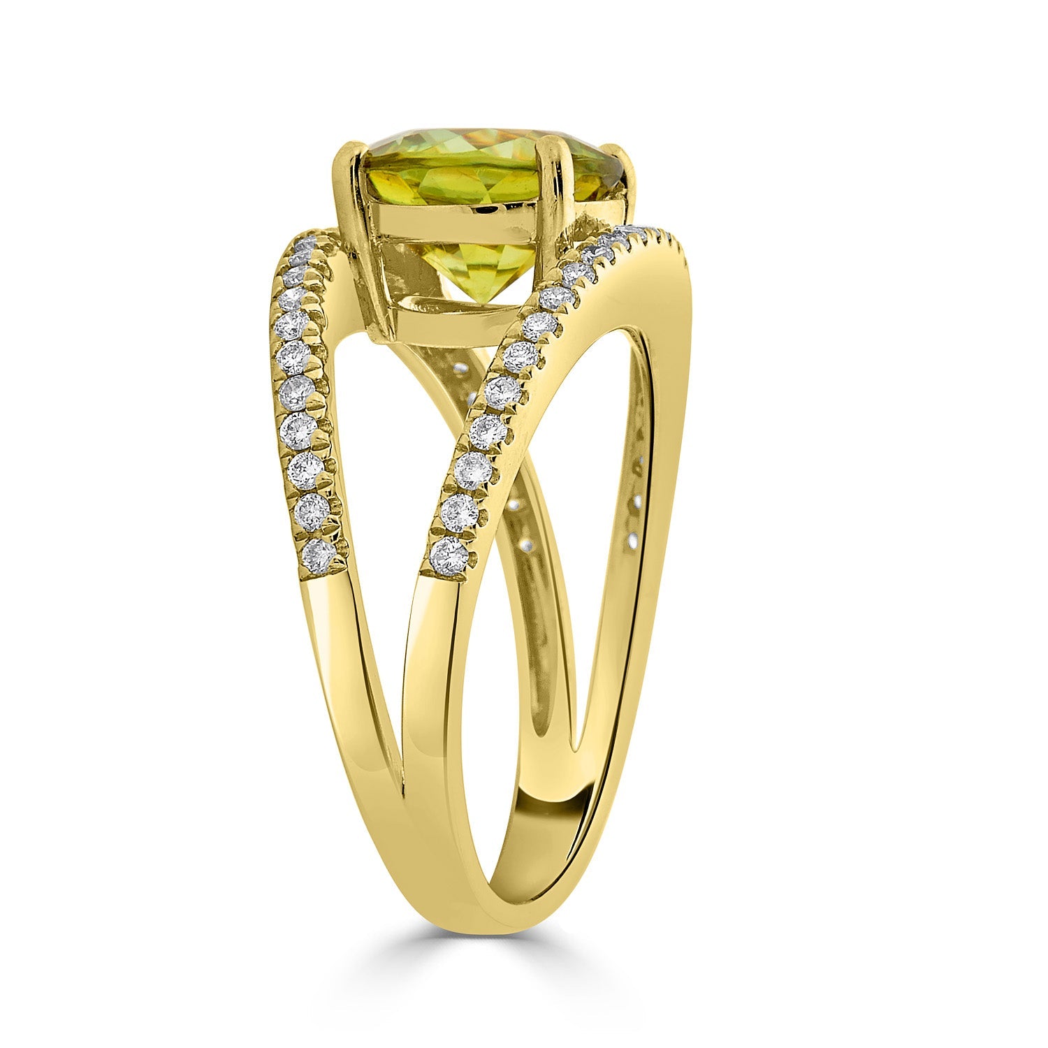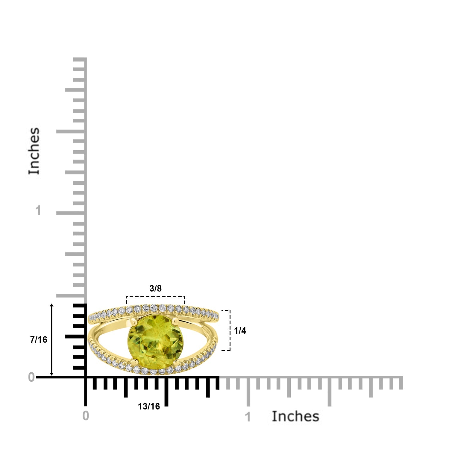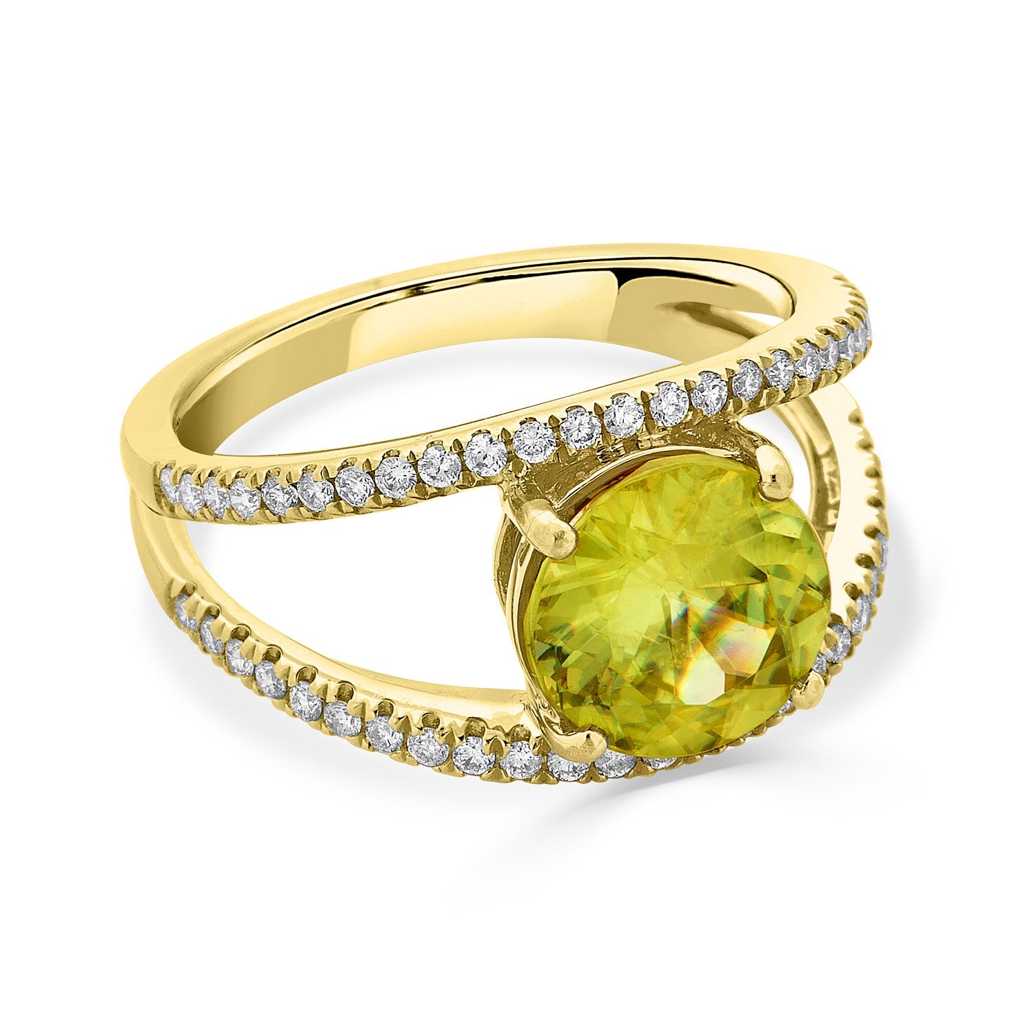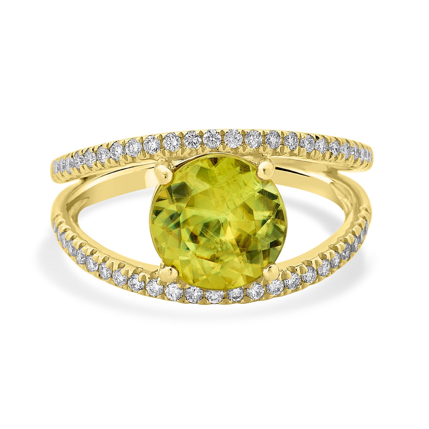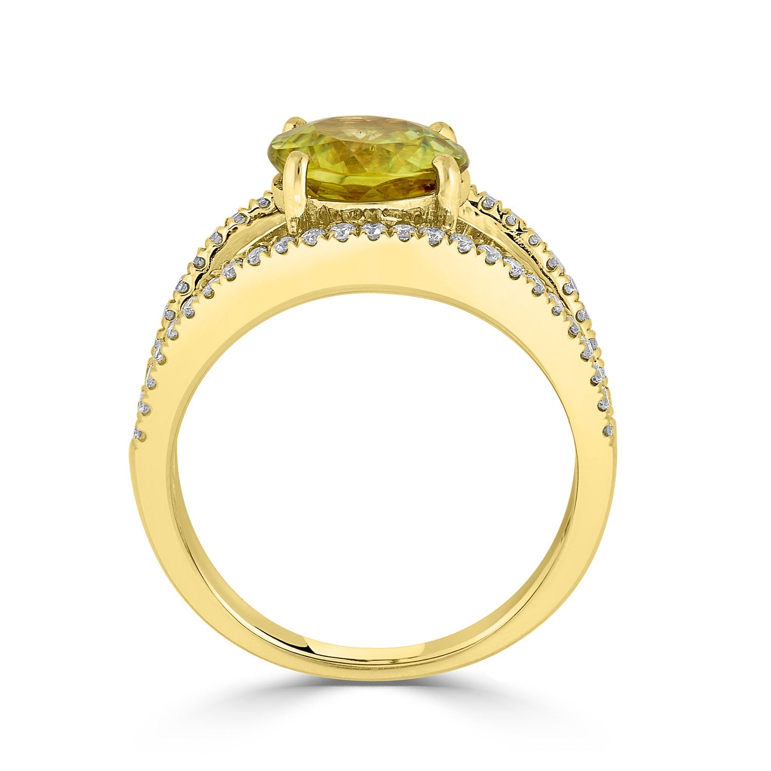 Crafted of gleaming 14K yellow gold, the richness of this spectacular ring is elevated by the gorgeous round cut Sphene. Encircled by the shimmer and shine of round cut Diamonds, this fine jewelry is perfect for any event.
