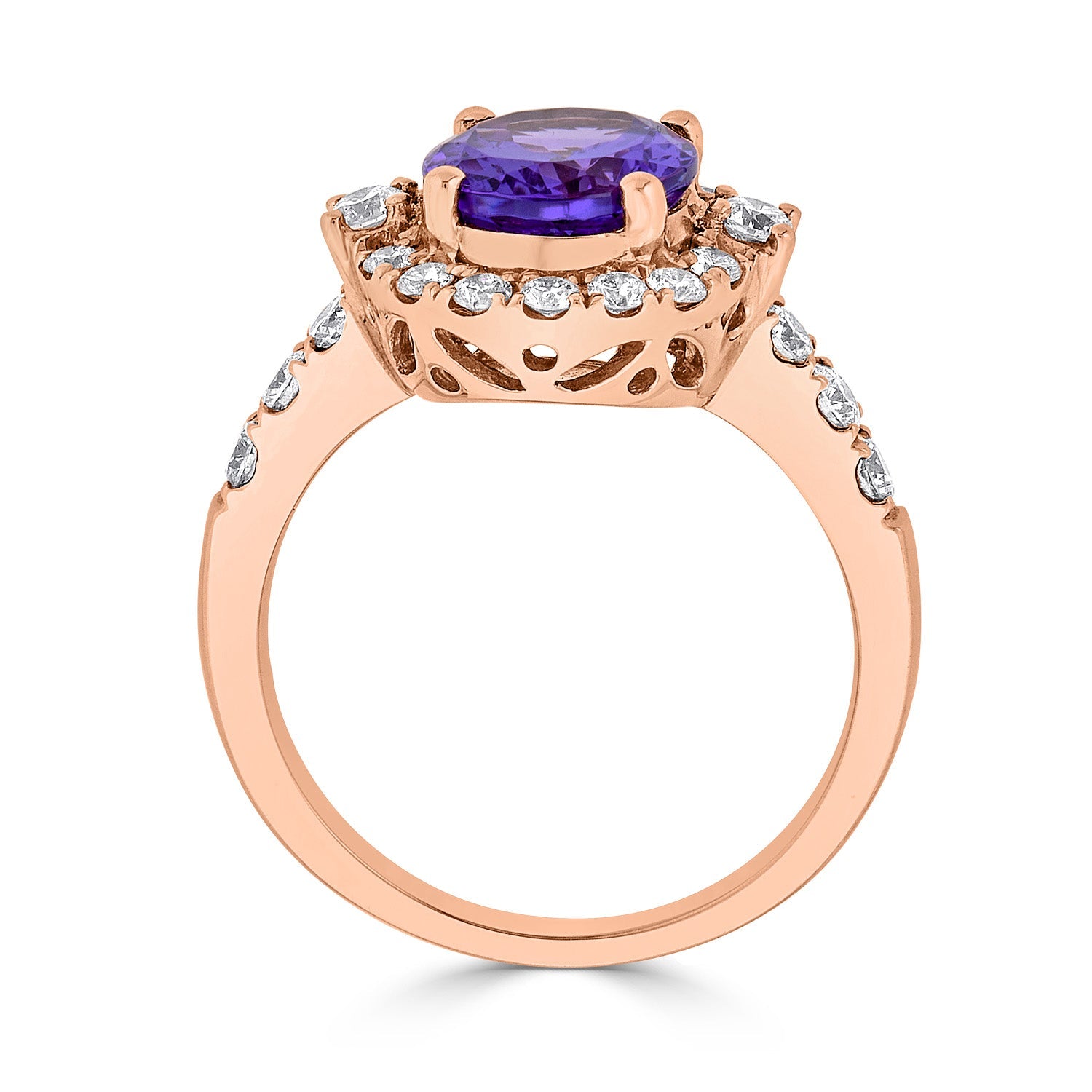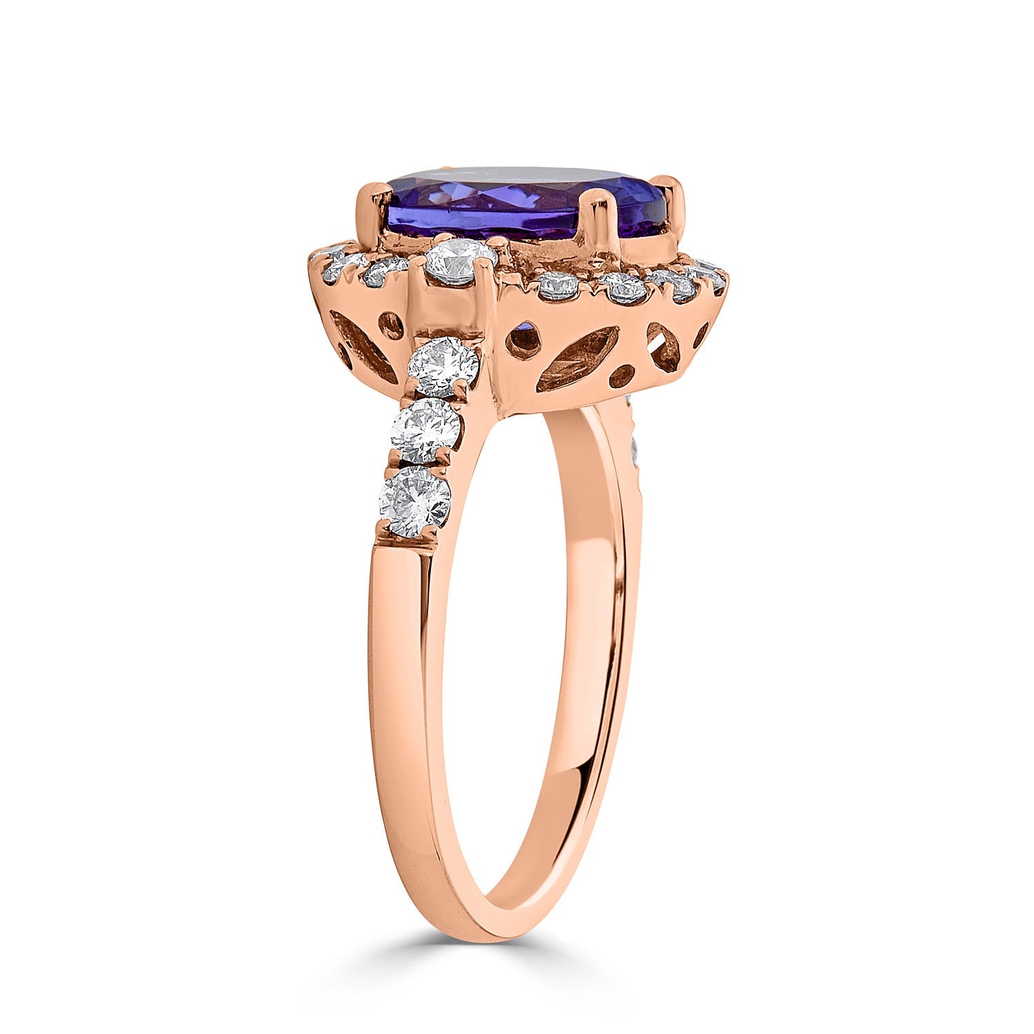 Set With A Brilliant Oval Cut Tanzanite, This Marvelous Ring Is Crafted Of 14k Rose Gold. Highlighting The Glorious Shade Of The Gemstone Are The Lustrous Round Cut Diamonds Around It.