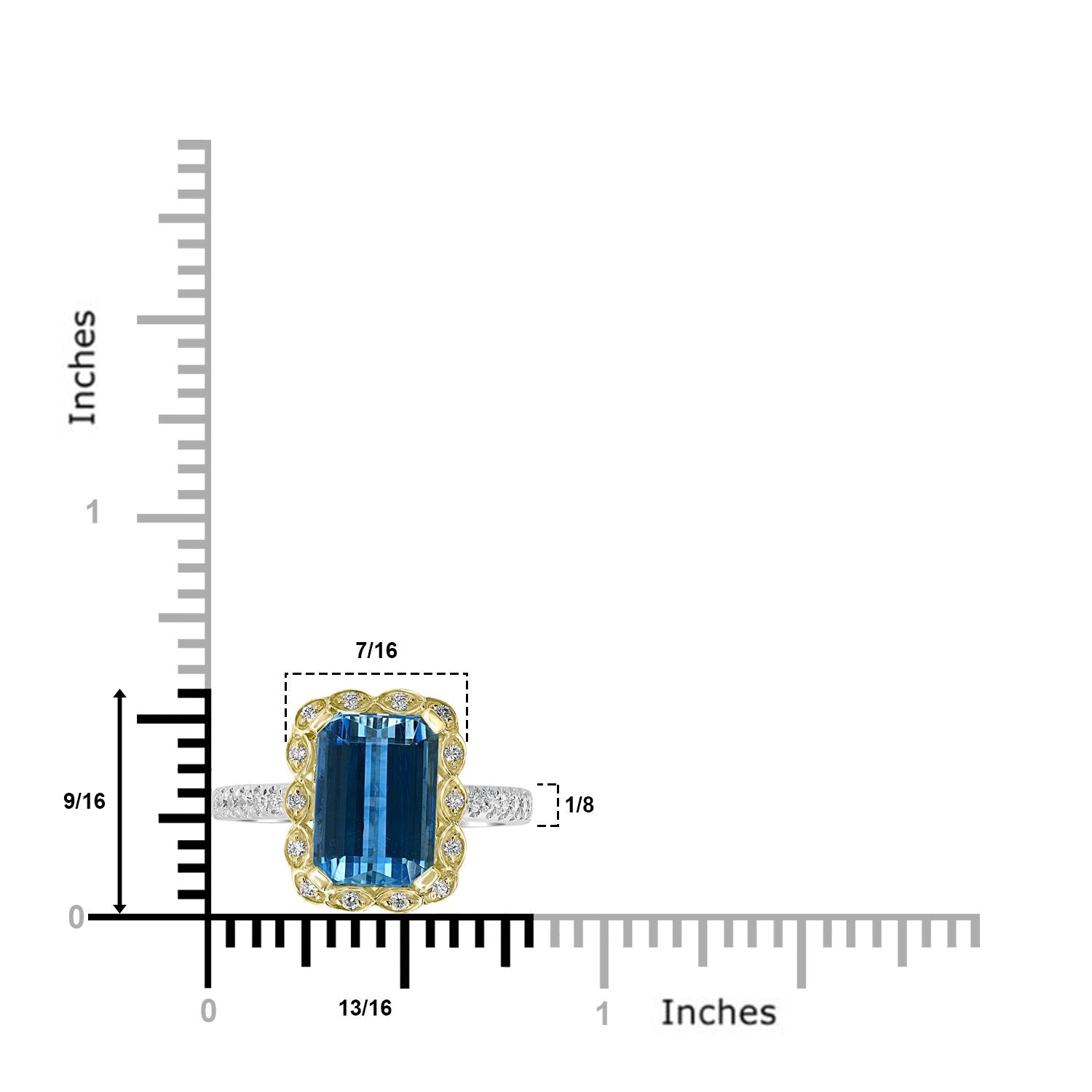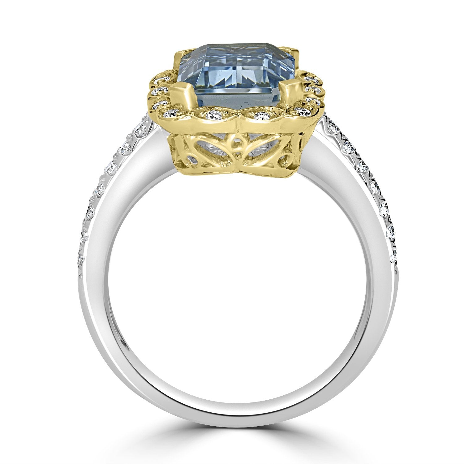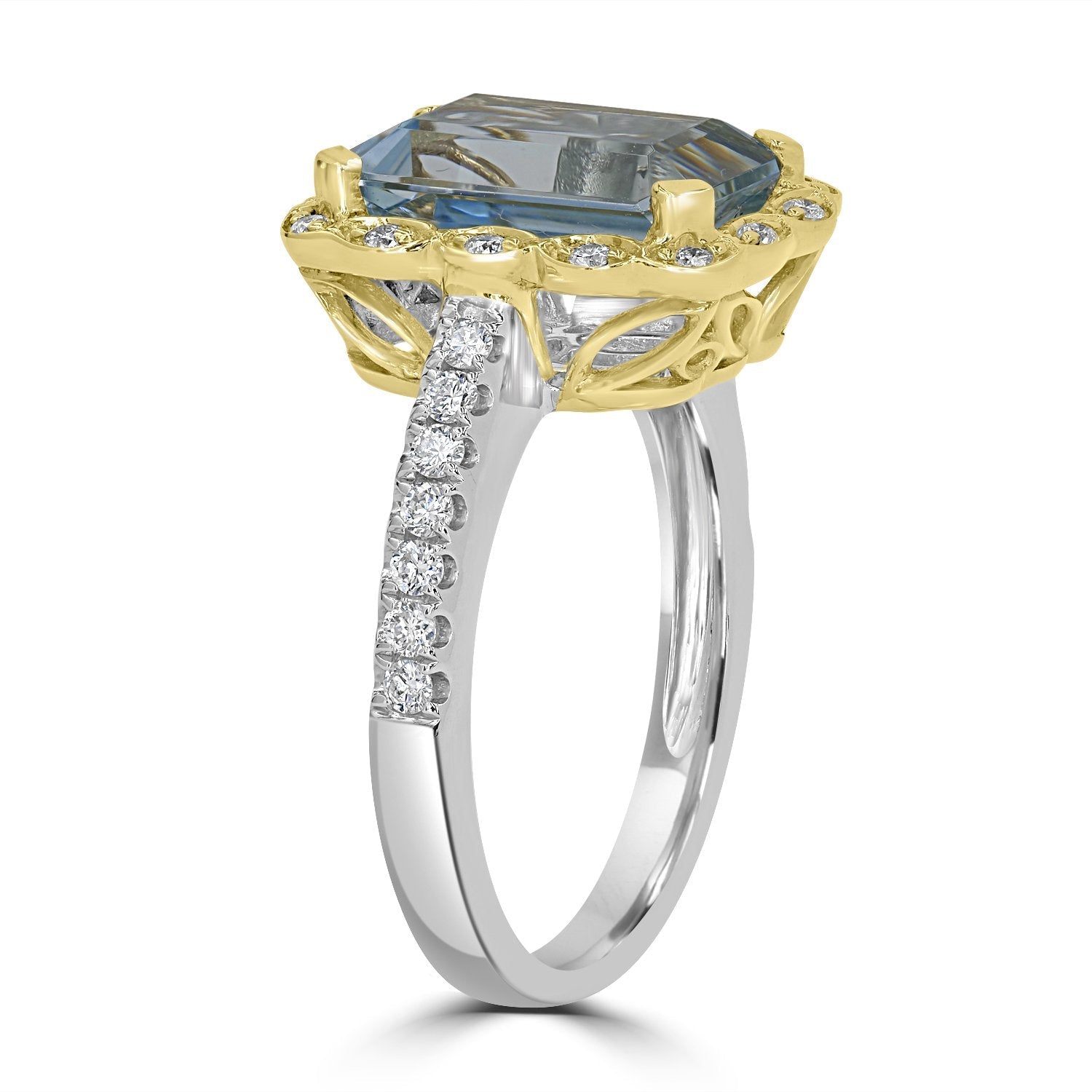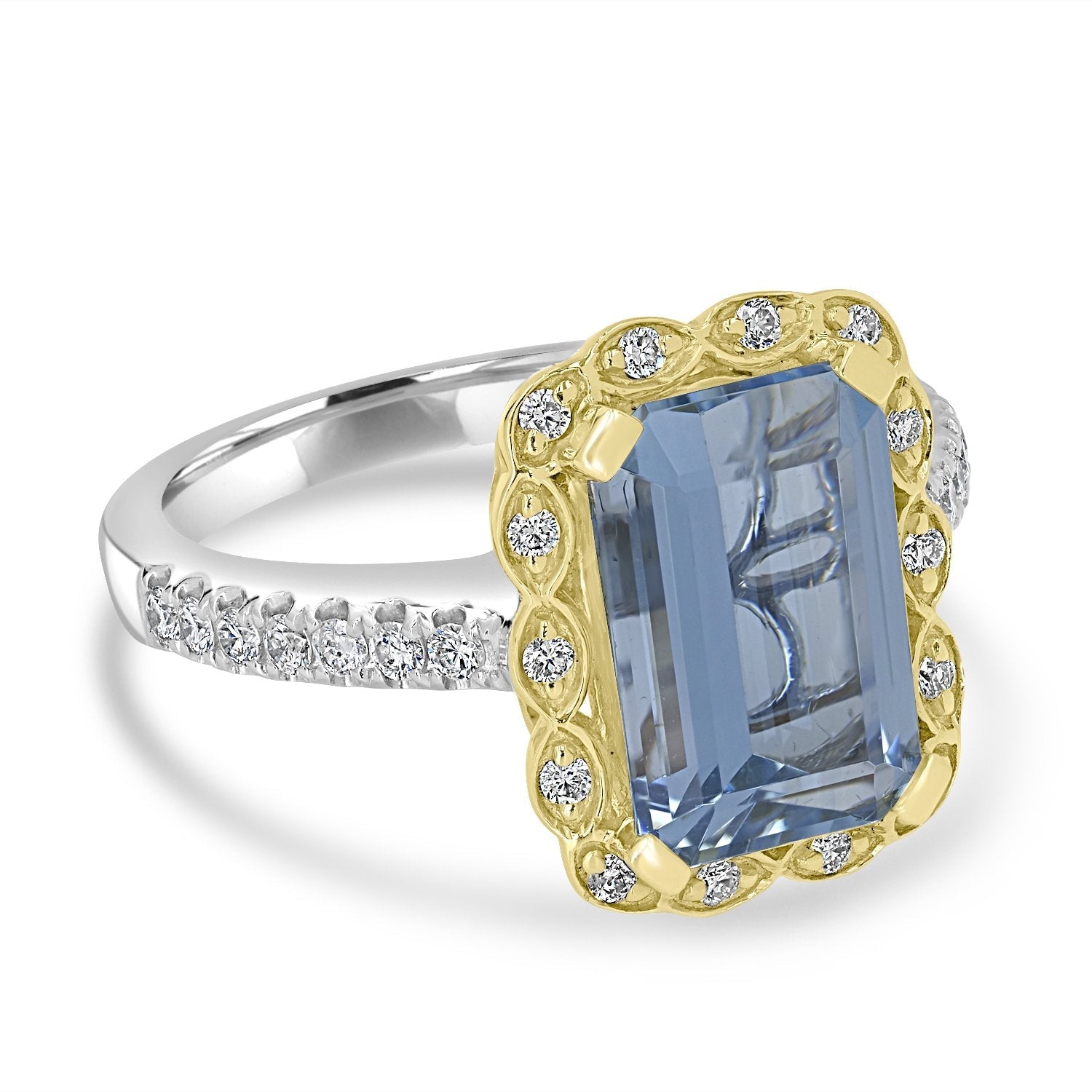 The charming ring is all you need to add the finishing touch to your outfit. The emerald-cut Aquamarine and round Diamonds are perfectly studded in 14k two-tone gold in perfect harmony.