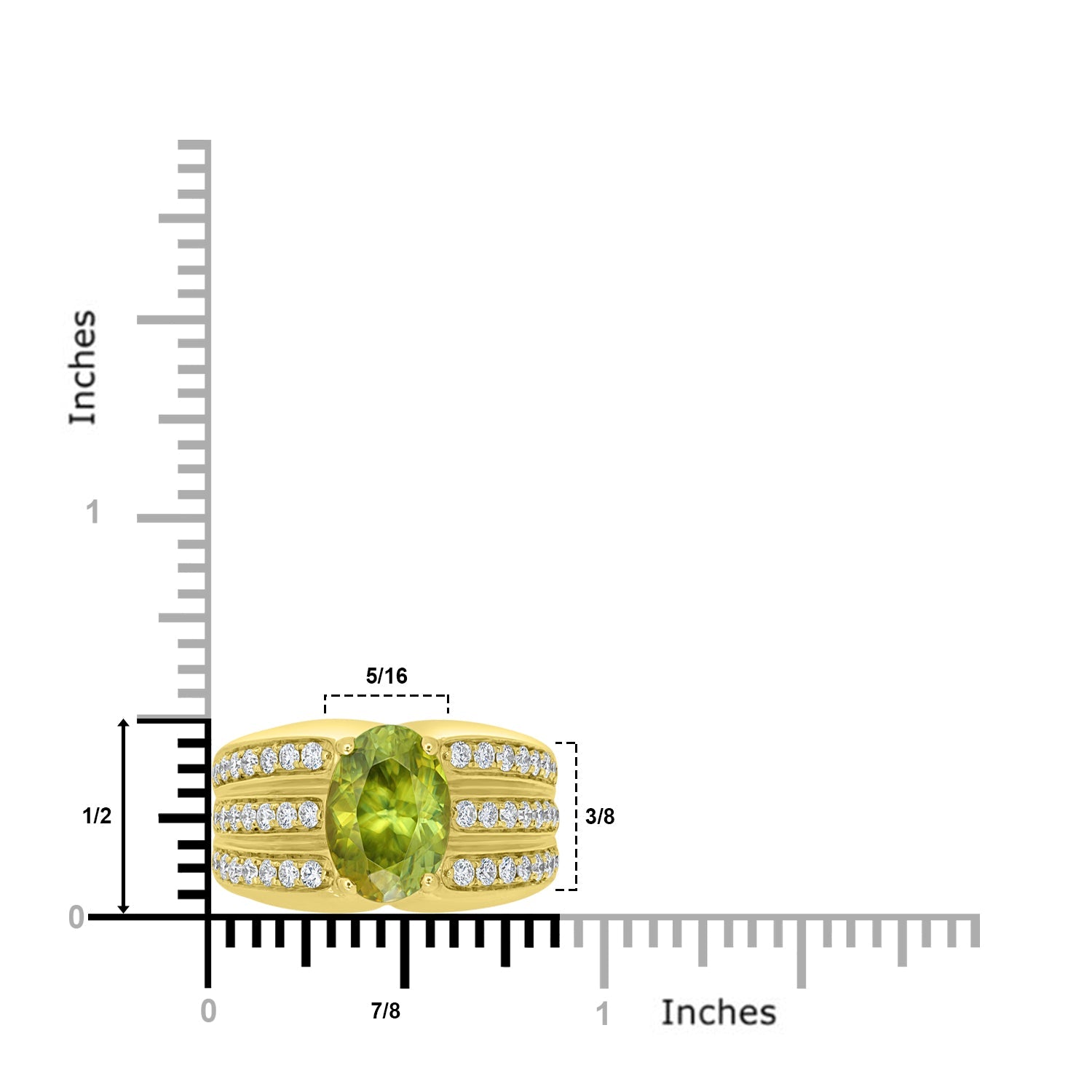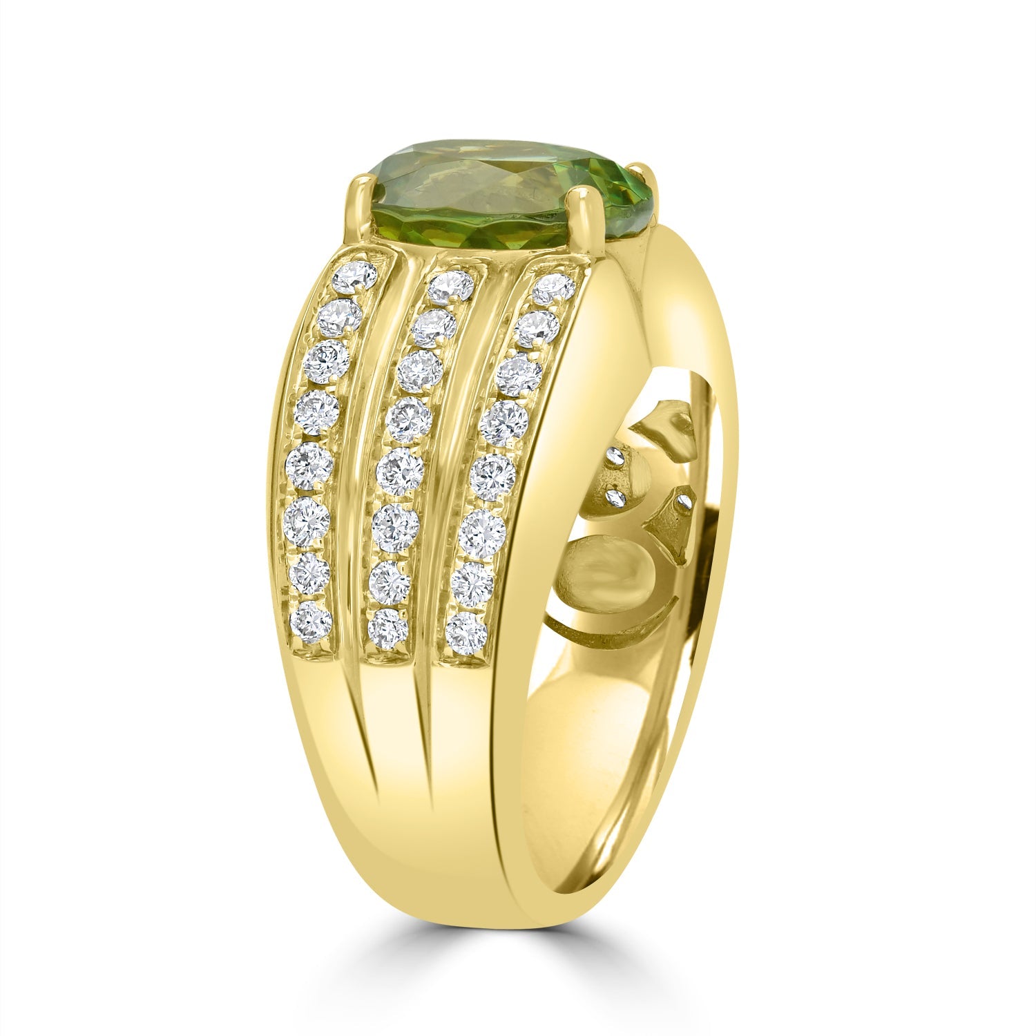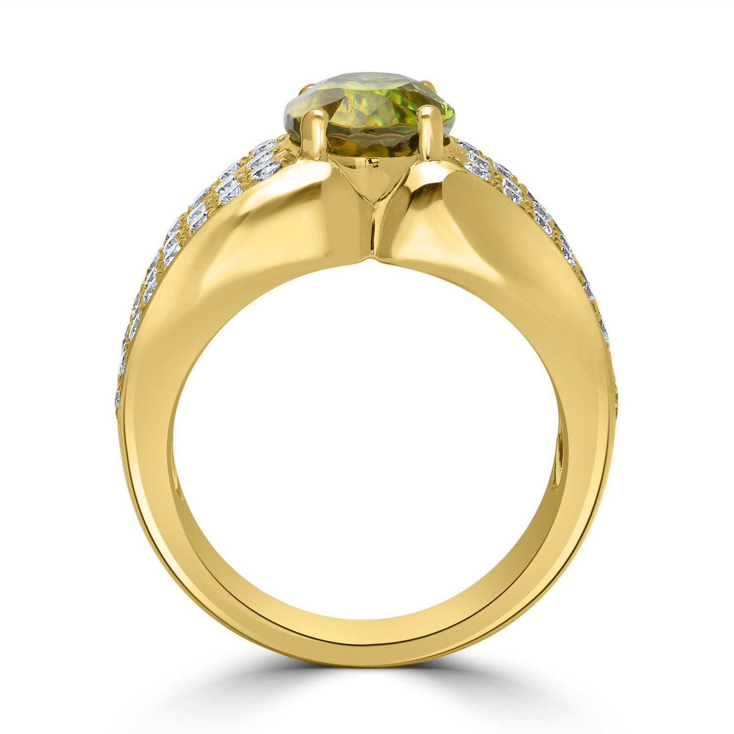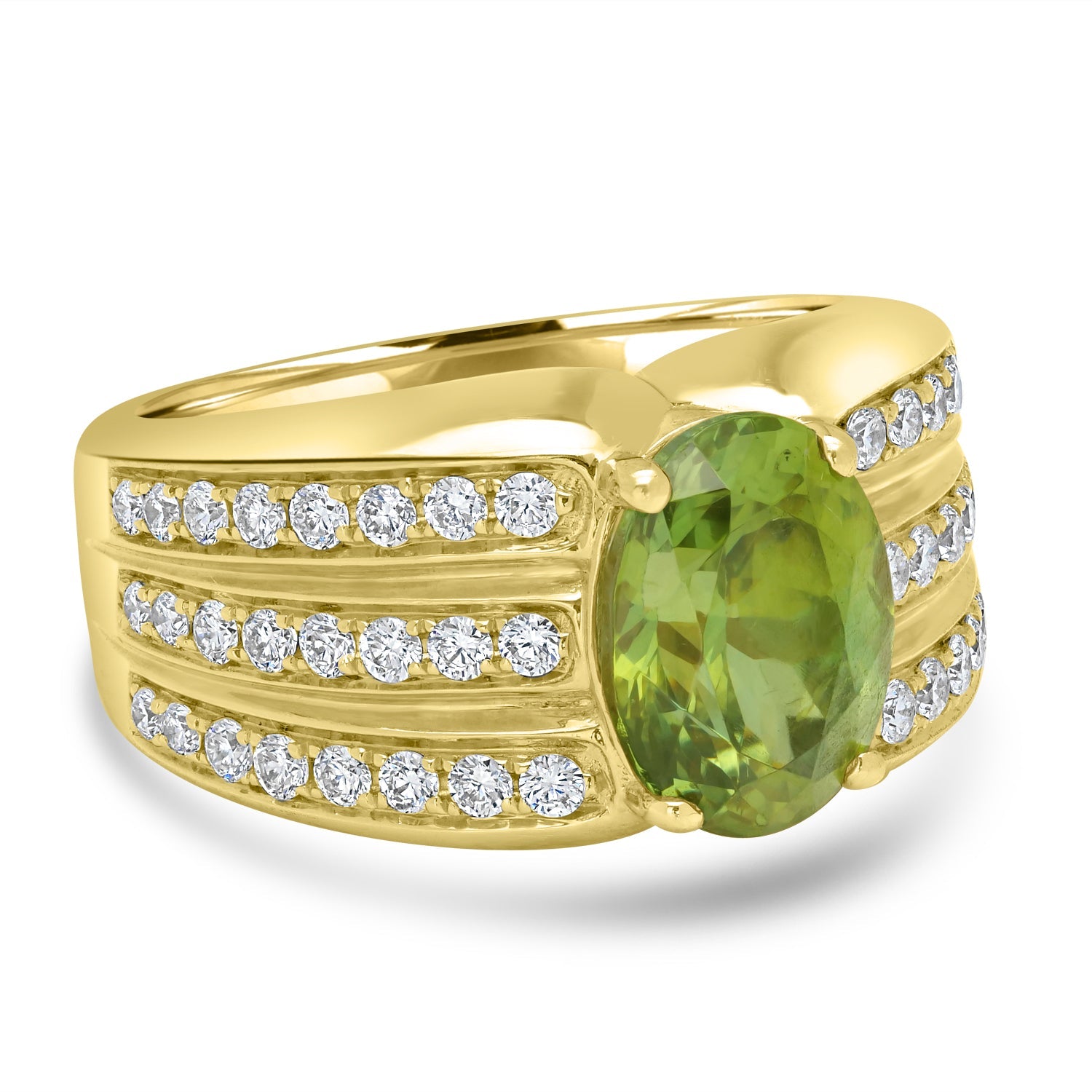 Crafted with 14k yellow gold, this striking ring is set with an exquisite oval-cut Sphene and round Diamonds that will leave everyone breathless!