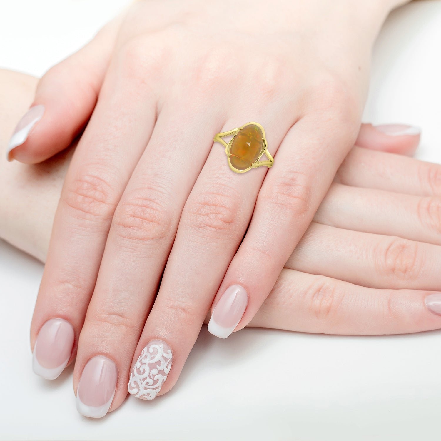 This exquisite 14K yellow gold ring showcases a stunning oval-cut Opal that radiates a rich and captivating hue. Its artistic design and luxurious appearance make it a striking piece that adds a touch of unique magic to your look.