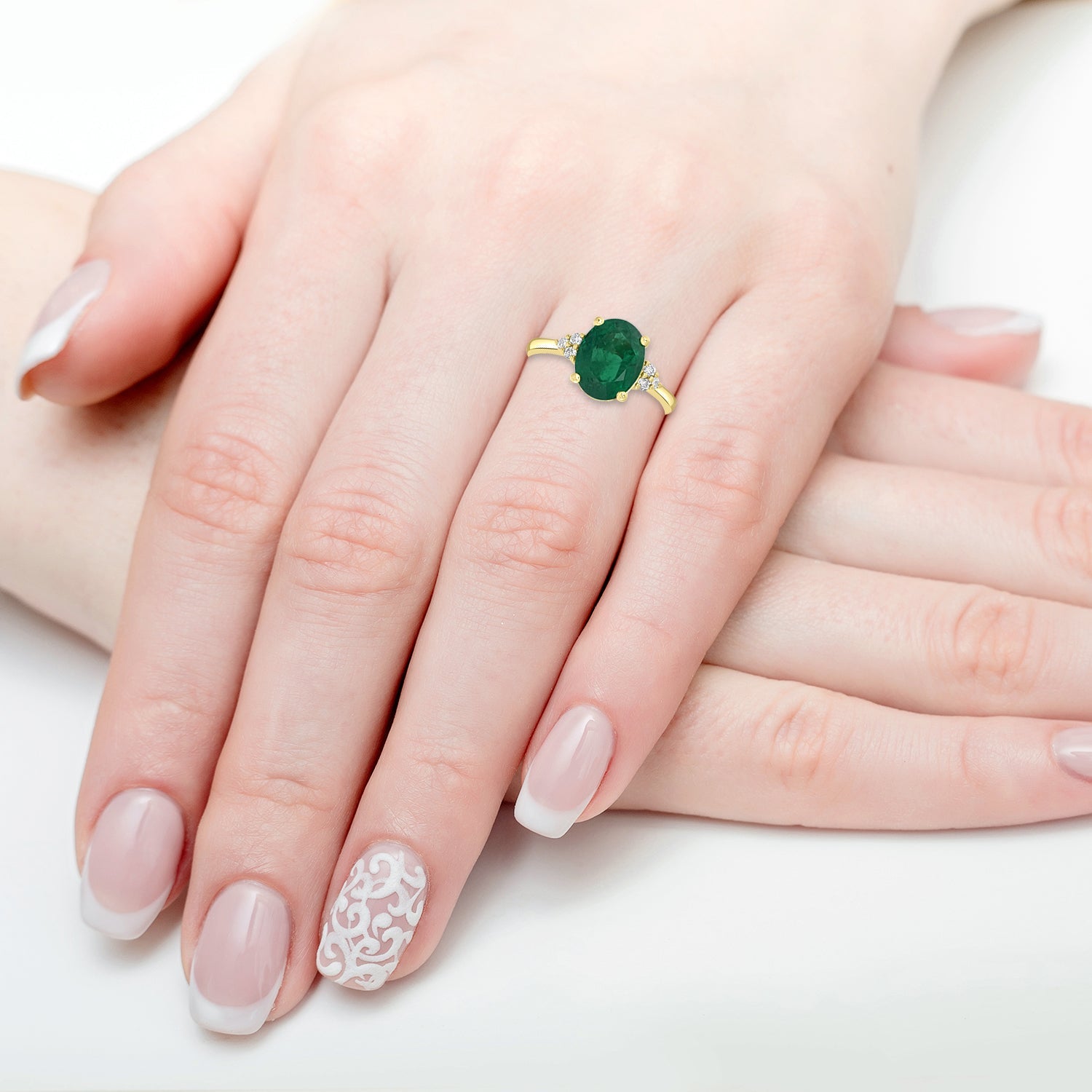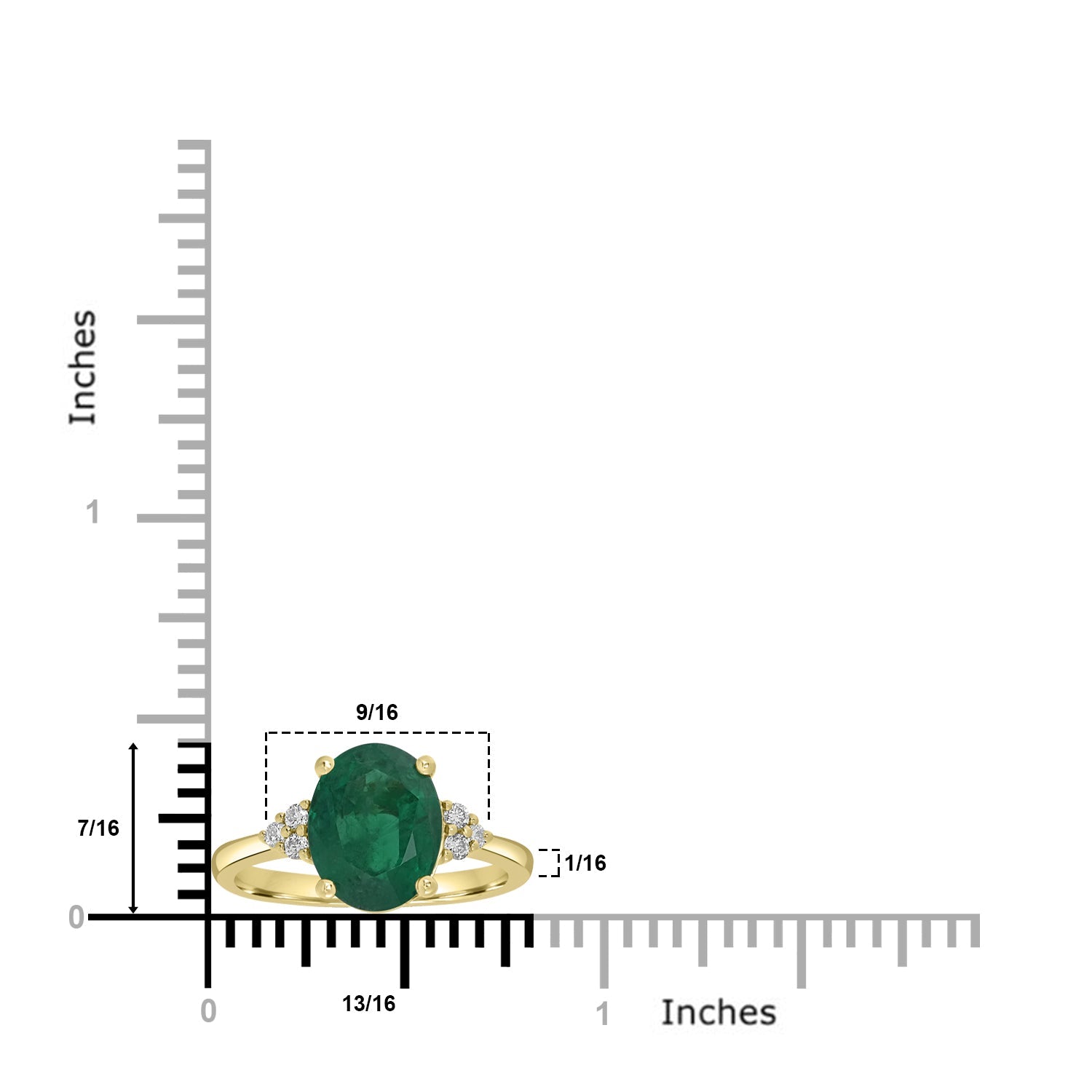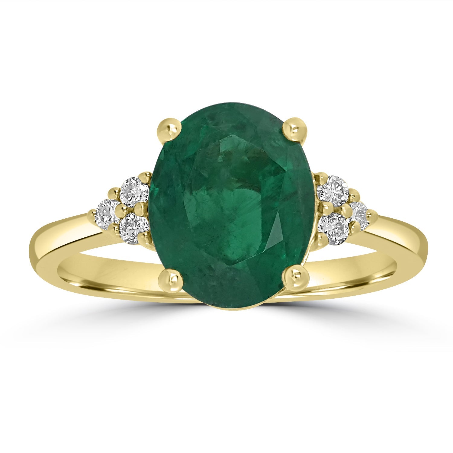 This gorgeous 14K yellow gold ring is set with a dazzling oval-cut Emerald and round Diamonds that sparkle in the light.