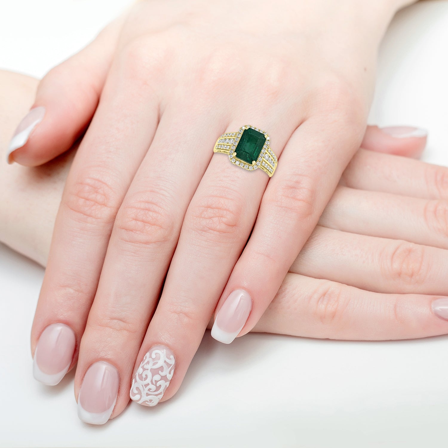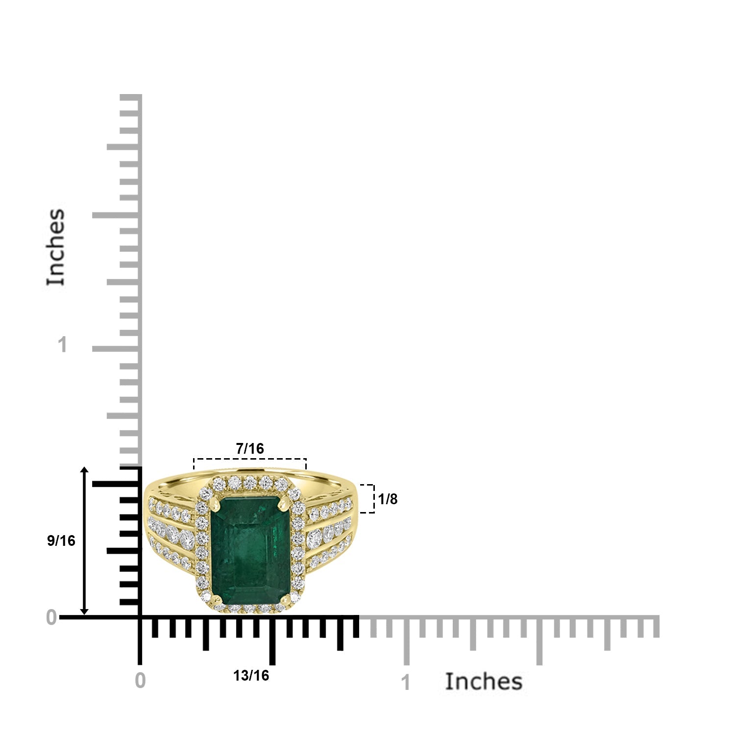 Crafted from 14K yellow gold, this beautiful ring is set with an emerald-cut Emerald and gorgeous round Diamonds. Extraordinary at its finest!