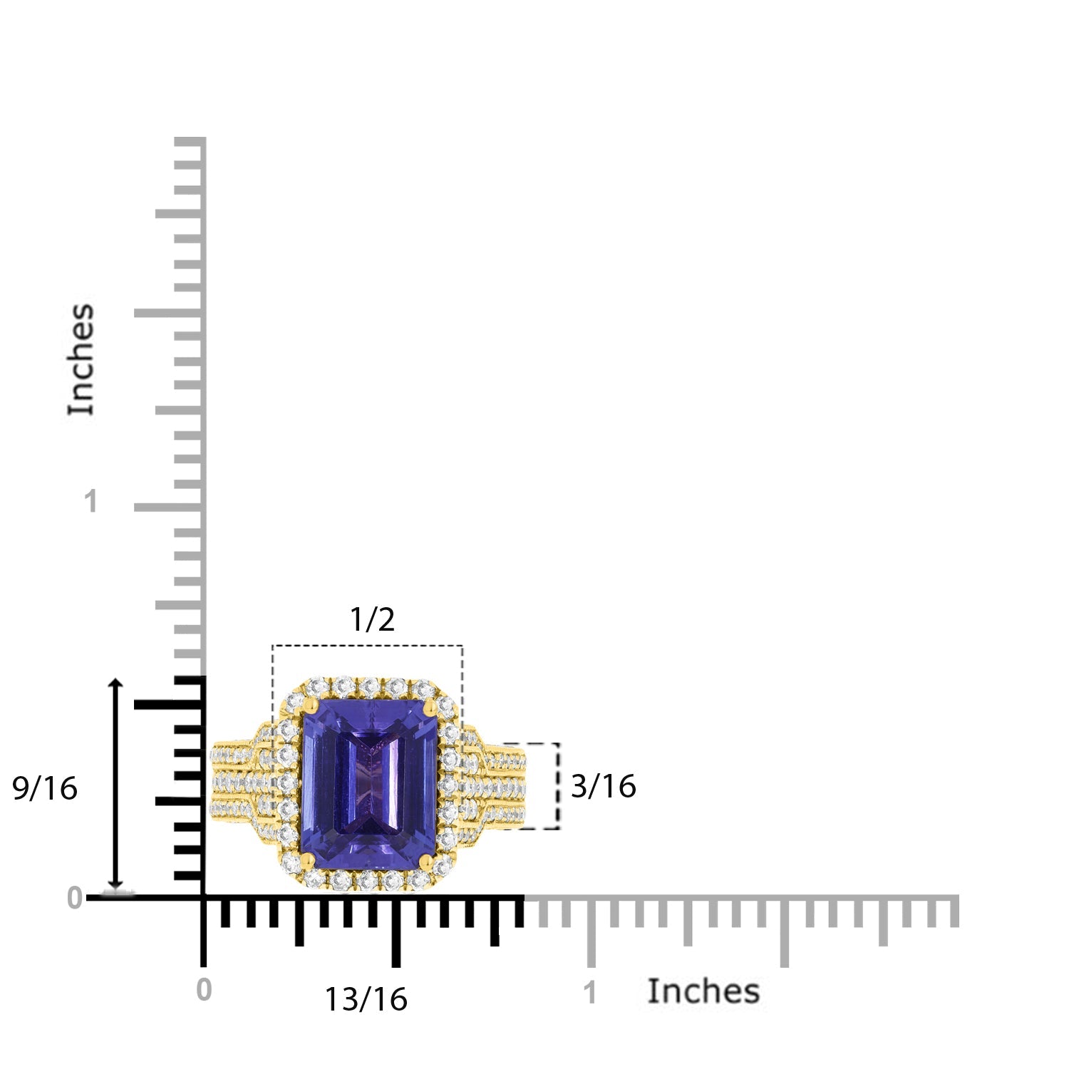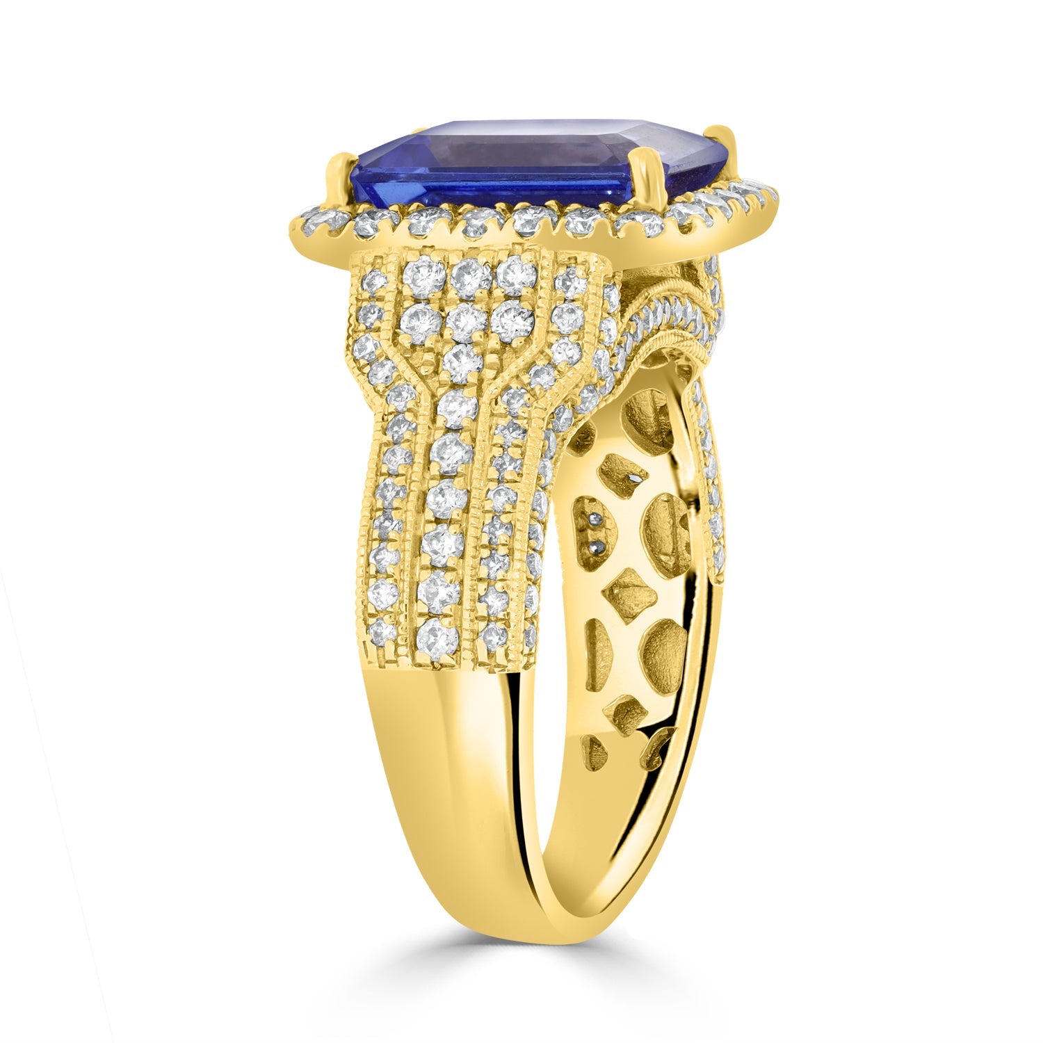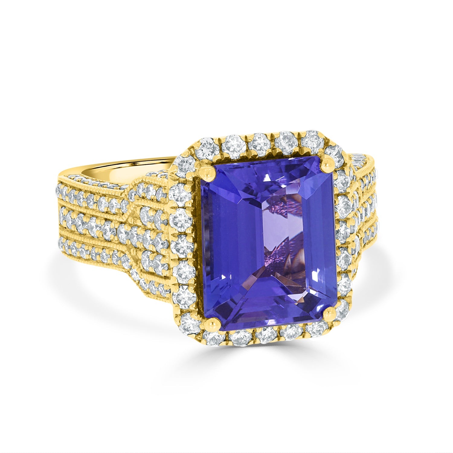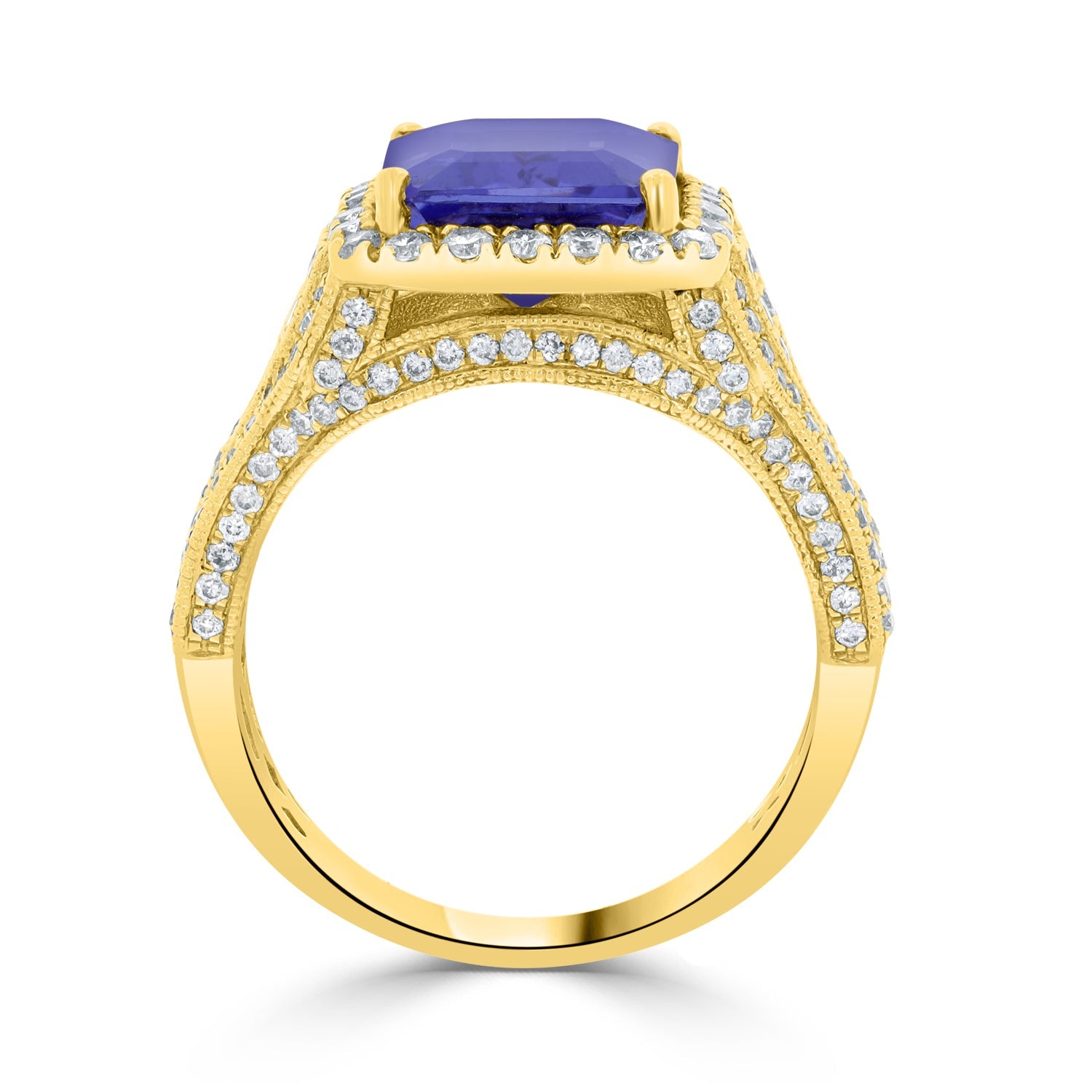 "Set with a magnificent octagon cut Tanzanite at the center, this remarkable ring is crafted from 14K yellow gold and surrounded by sparkling round cut Diamonds."