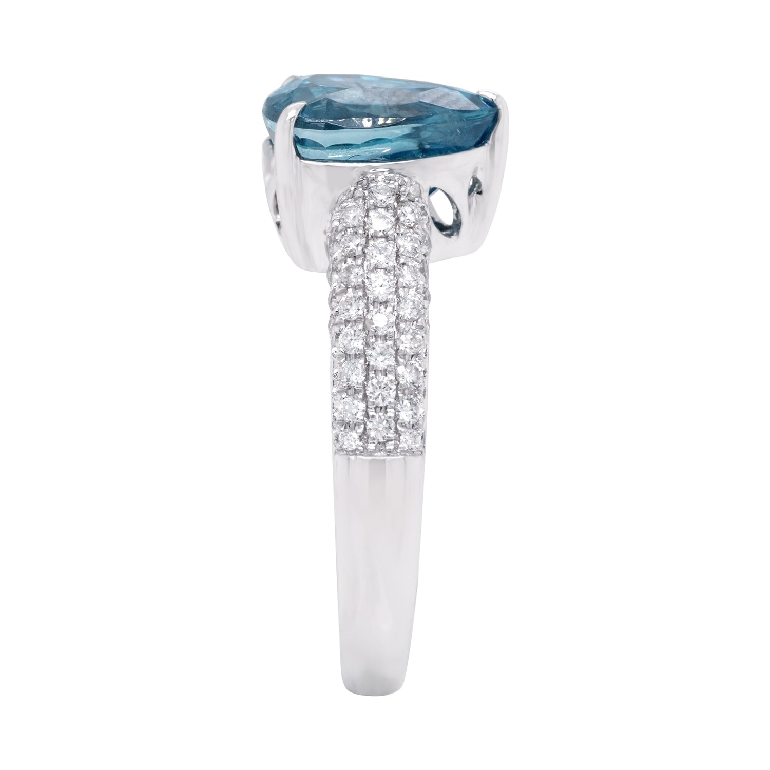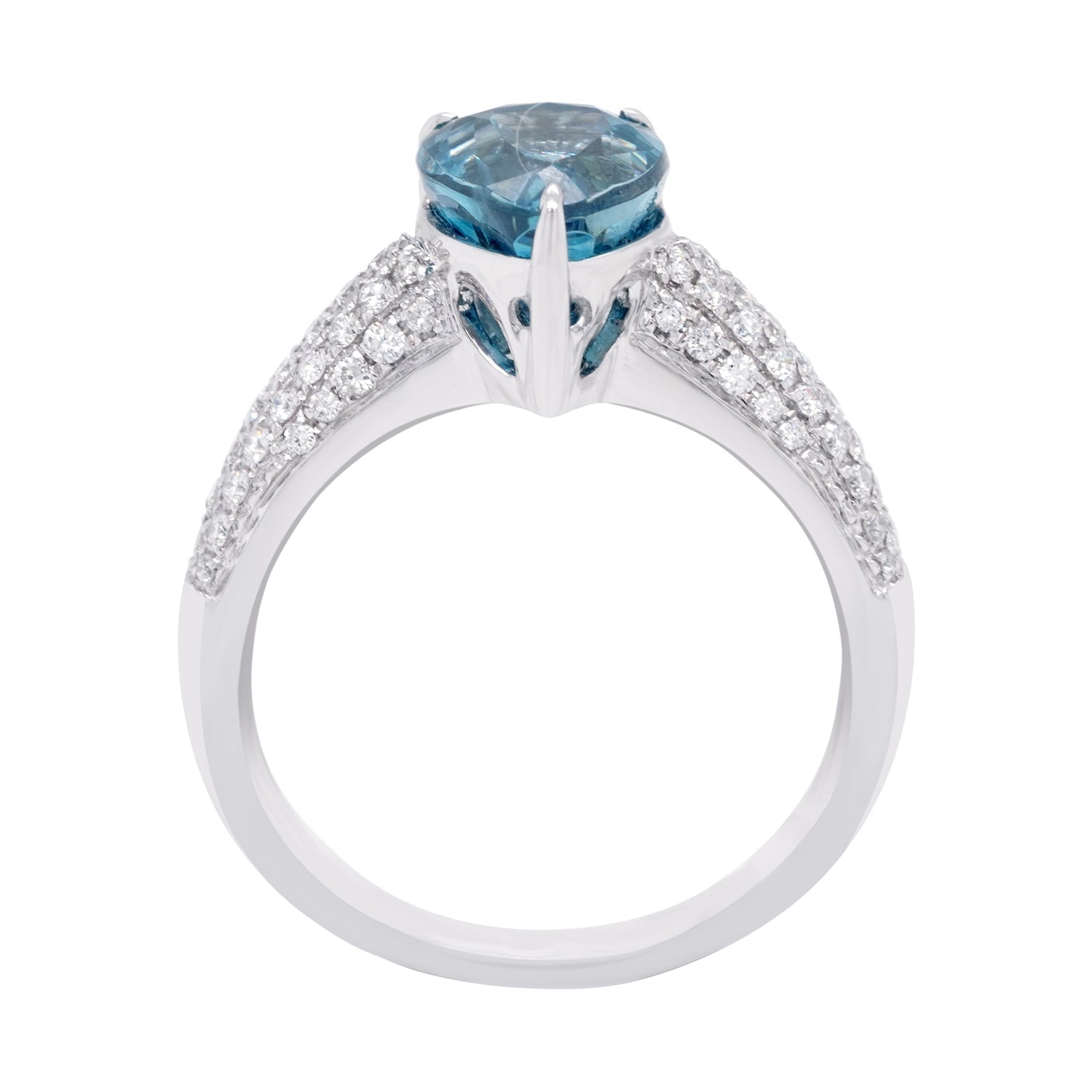 This ring is a royal way to add a luxury touch to your attire. 14k white gold and exceptional design make this ring the best option for casual outings as well as parties. Featuring a classy design that includes artistically-set pear cut blue Zircon and round Diamonds, this ring will sport an exceptional look.