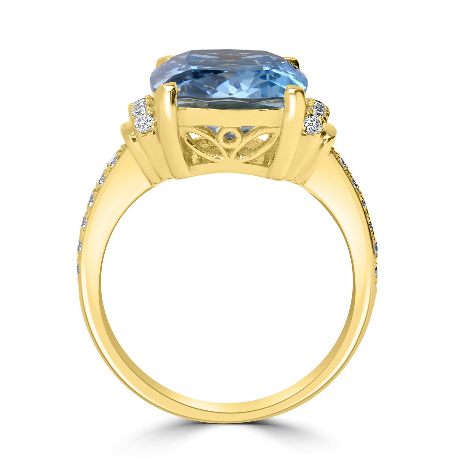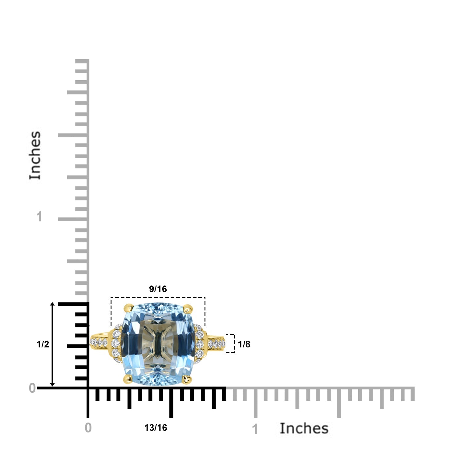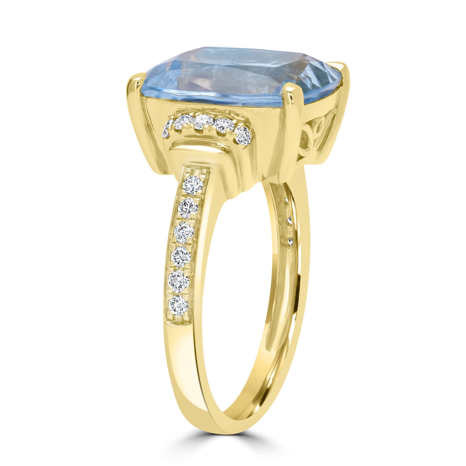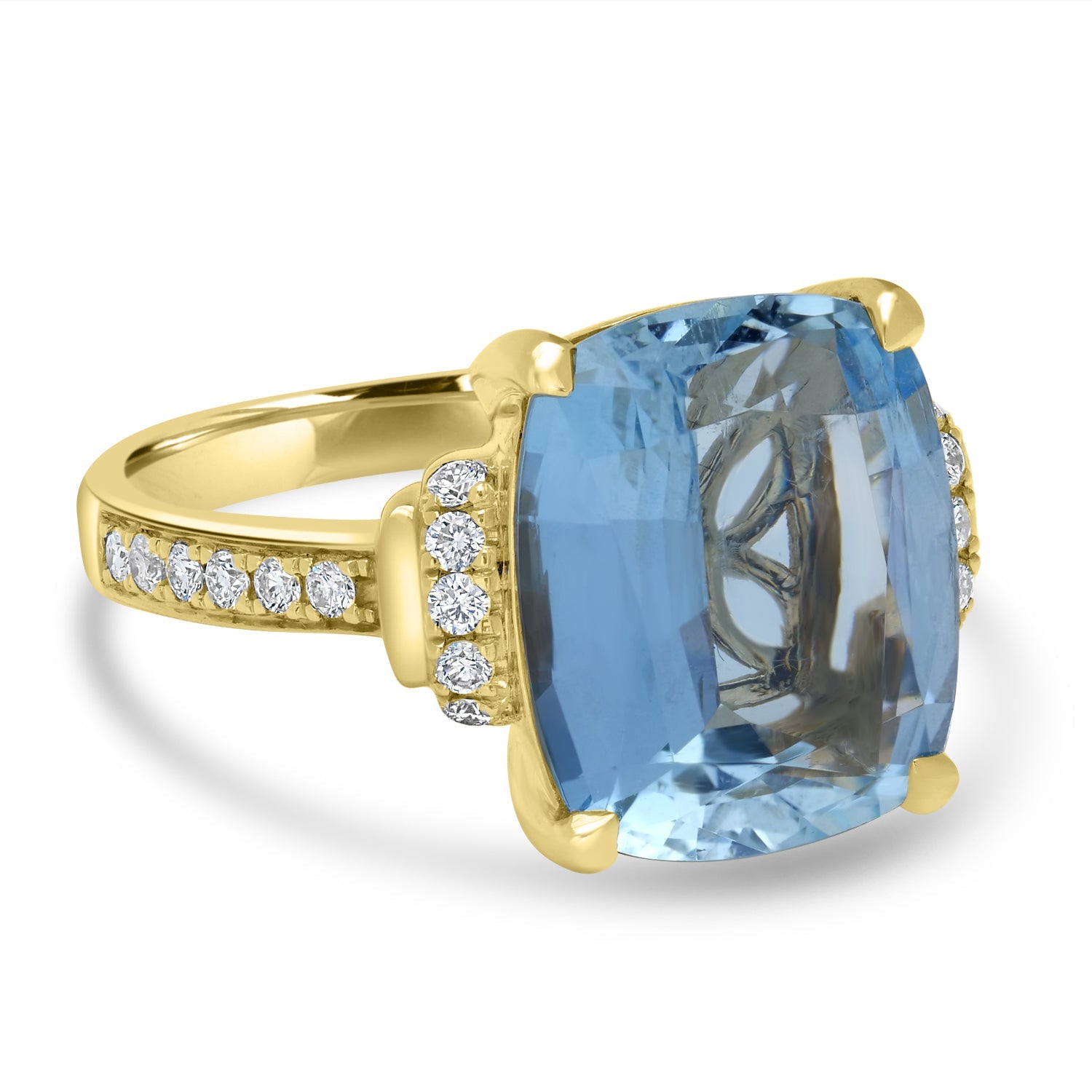 This eye-catching 14K yellow gold ring is set with a stunning cushion-cut Aquamarine and round Diamonds. Wear this enchanting ring and have everyone talking.