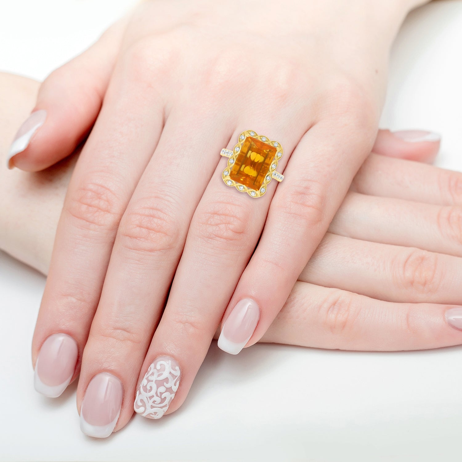 Designed of 14k yellow gold, wear this timeless ring for parties and special events to make a style statement. Adding to its radiance is the shimmering emerald-cut Fire Opal and round Diamonds that are set for added richness.