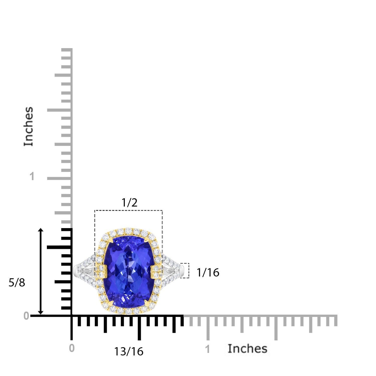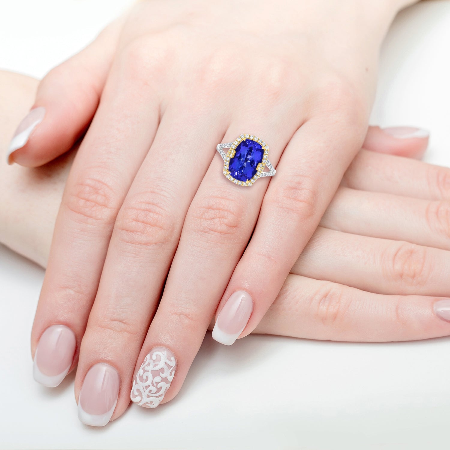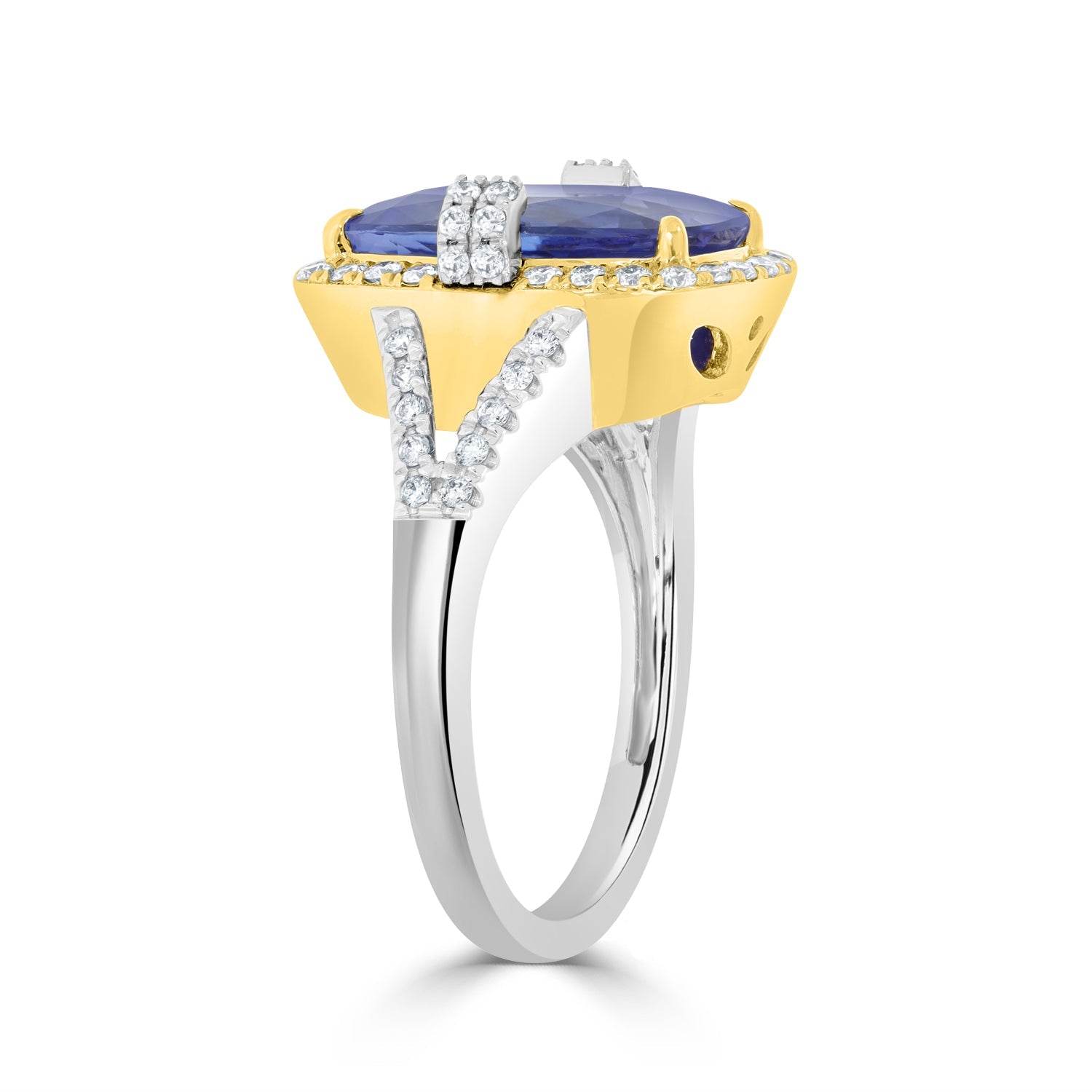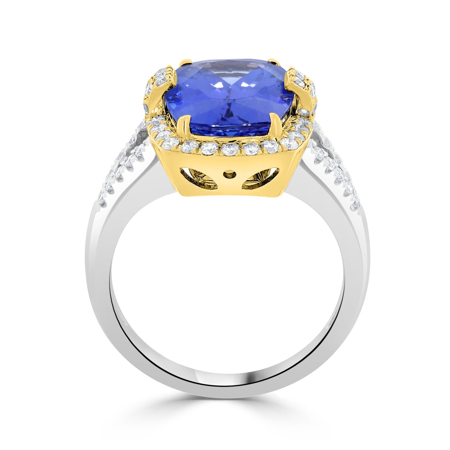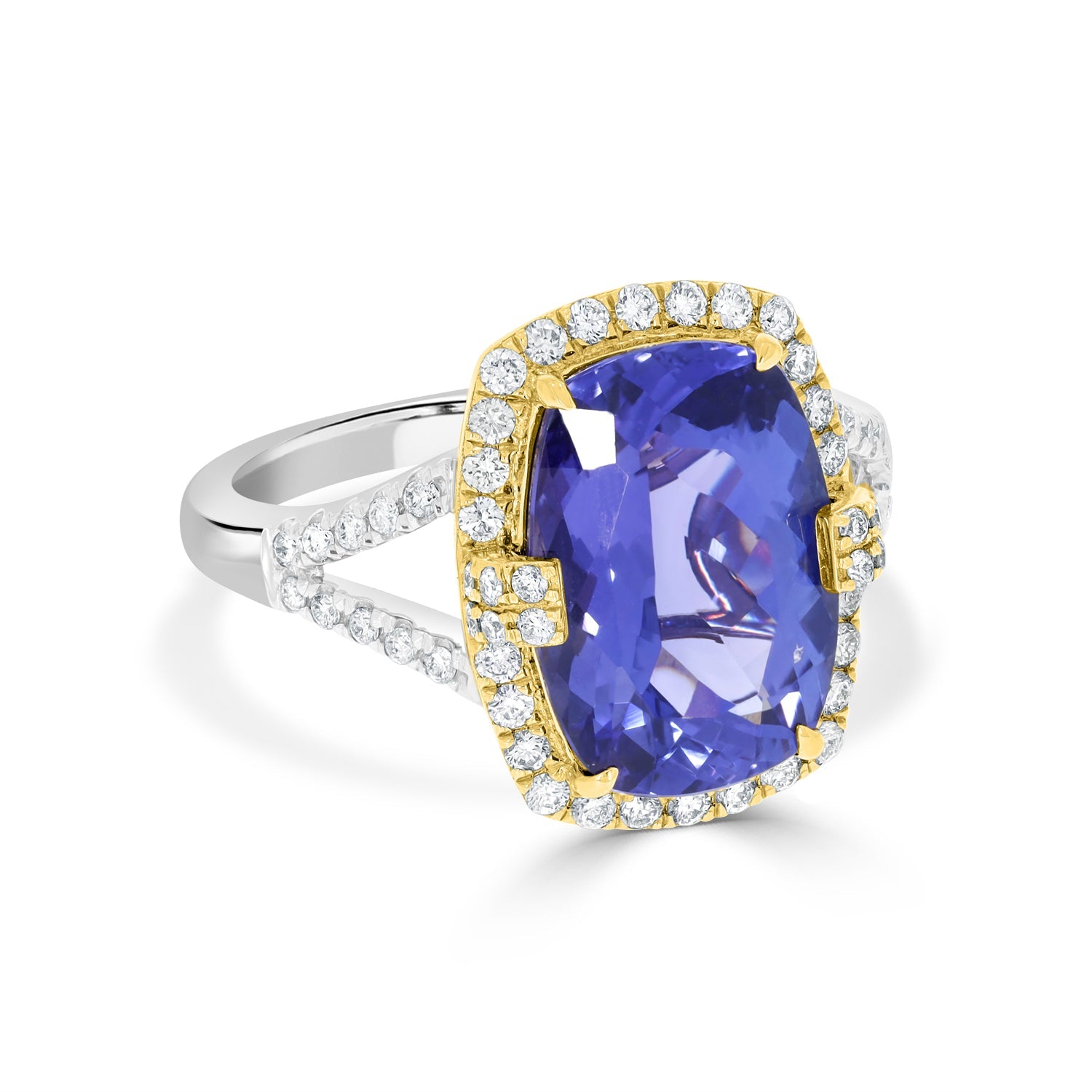 "Designed with 14K two-tone gold, this beautiful ring compliments every look. Set with a cushion-cut Tanzanite at the center, this eye-catching ring is surrounded by Diamonds."
