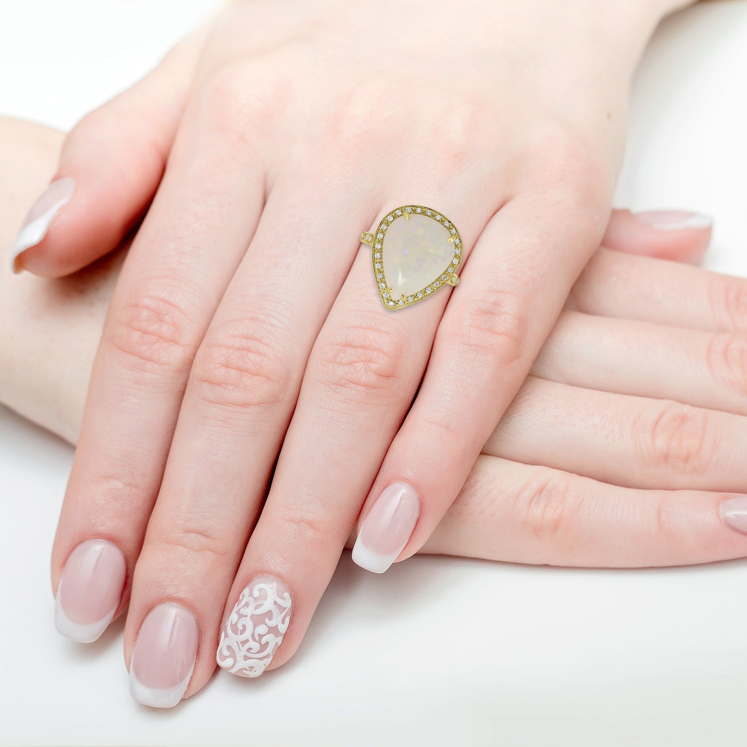 This splendid ring that will last forever is a symbol of timeless sophistication. This lovely ring is crafted of 18K yellow gold for a rich finish and embellished with pear-cut Opal and round Diamonds for added appeal.