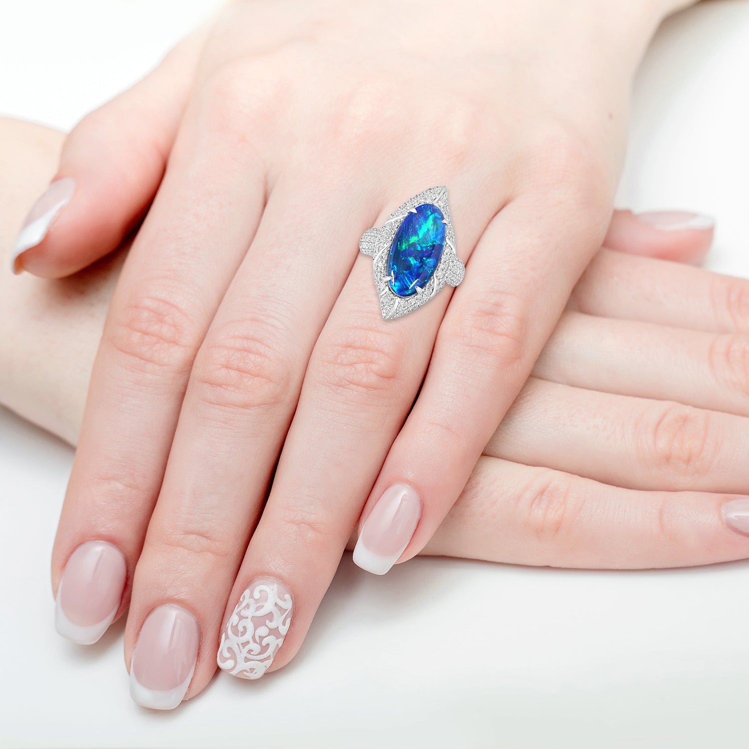 This charming ring is specially fashioned of 18k white gold and set with oval-cut Opal and sparkly Diamonds to give it a sophisticated look. Featuring an eye-catching design, this luxury style ring will lend effortless style to your look.