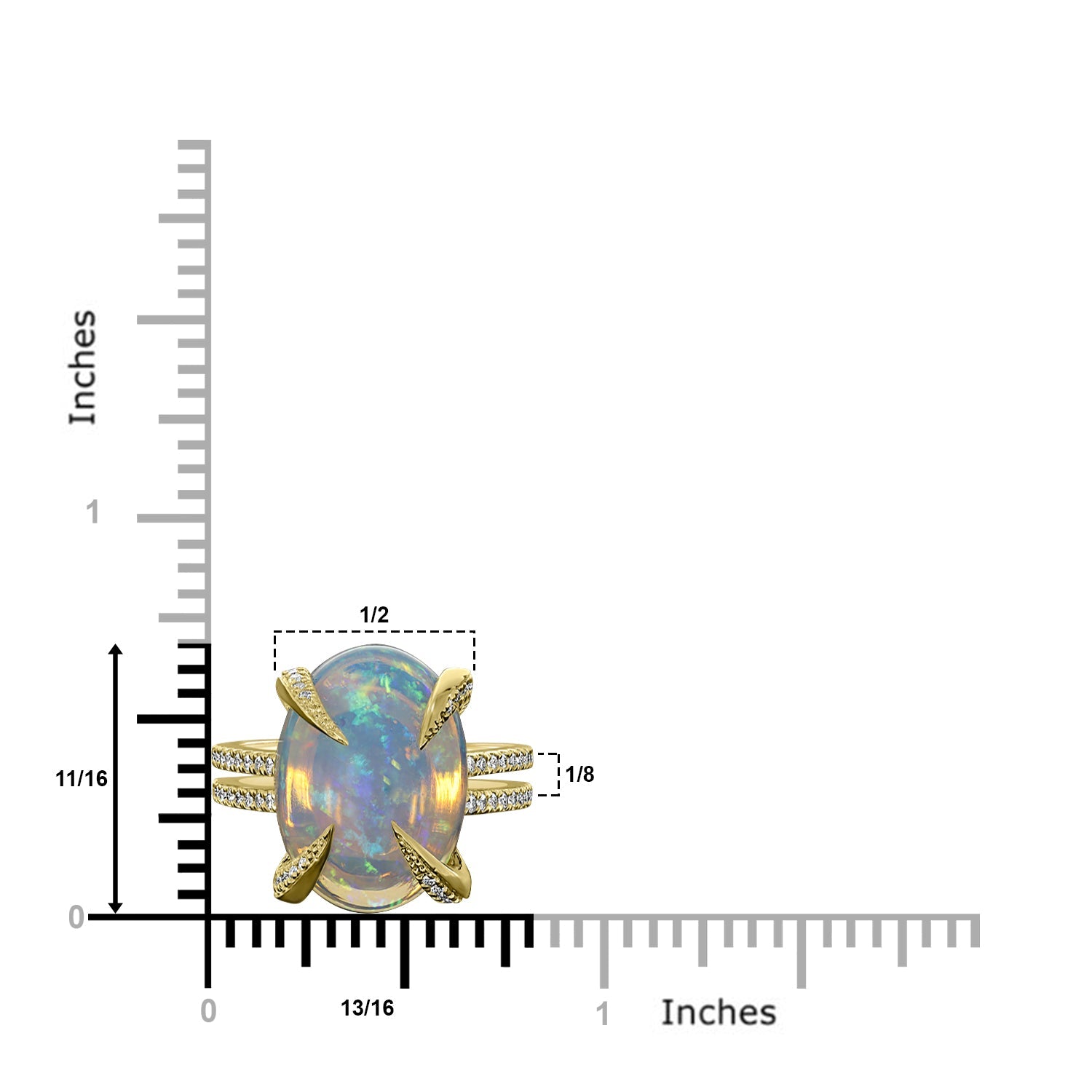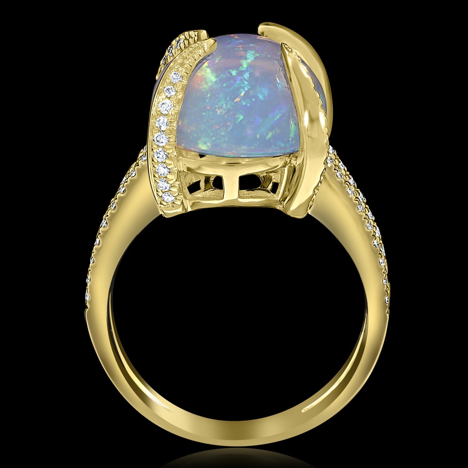 Set with an oval-cut Opal and round Diamonds, perfectly designed in 14k yellow gold, this ring is unforgettable.