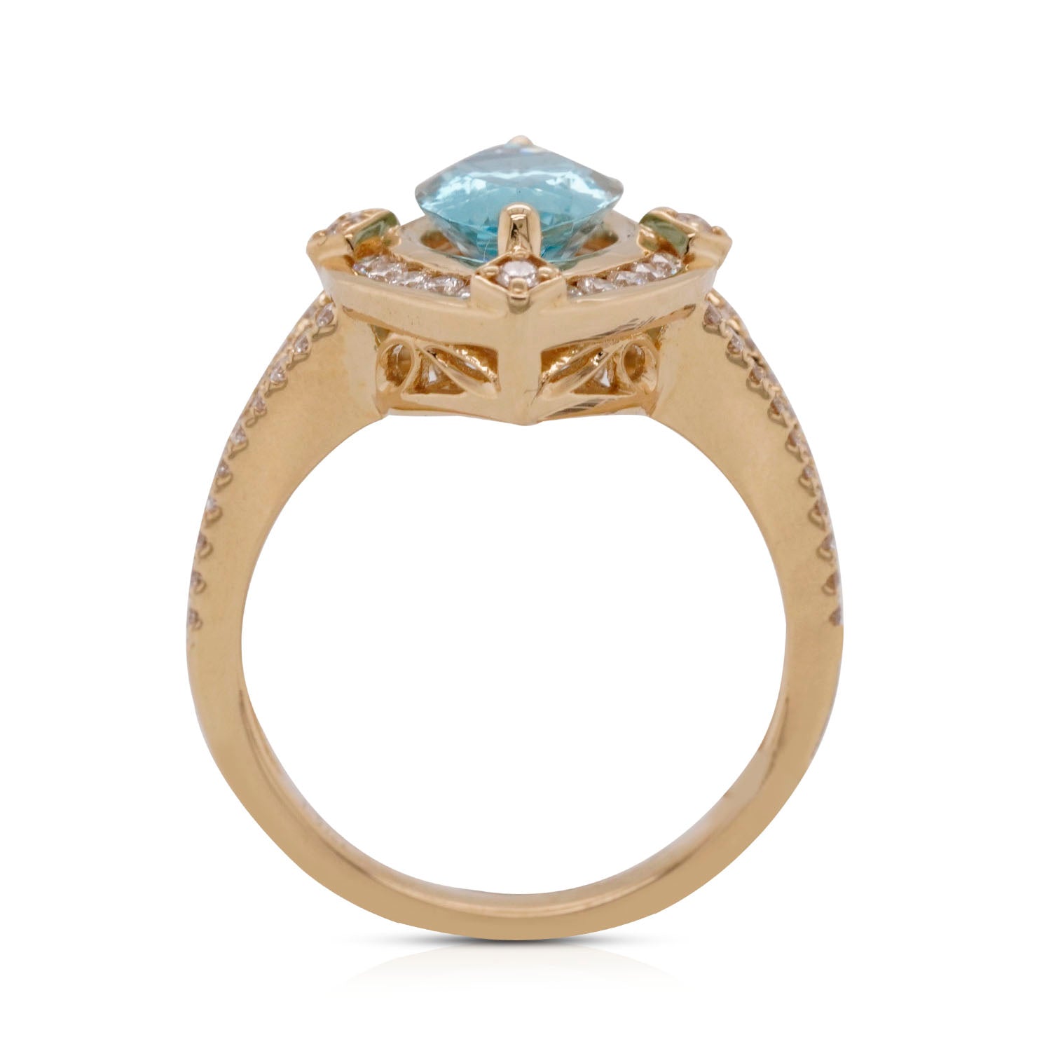 The slender marquise cut of this Aquamarine is a combination of elegance and simplicity that gives this delicate ring a gorgeous look. Crafted in glossy 14K yellow gold, it flaunts perfectly round diamonds that glisten in the light reflected by their numerous facets. Displaying a subtle shade that spreads a soothing vibe, this pretty ring adds a sparkle to your style that will never leave you!