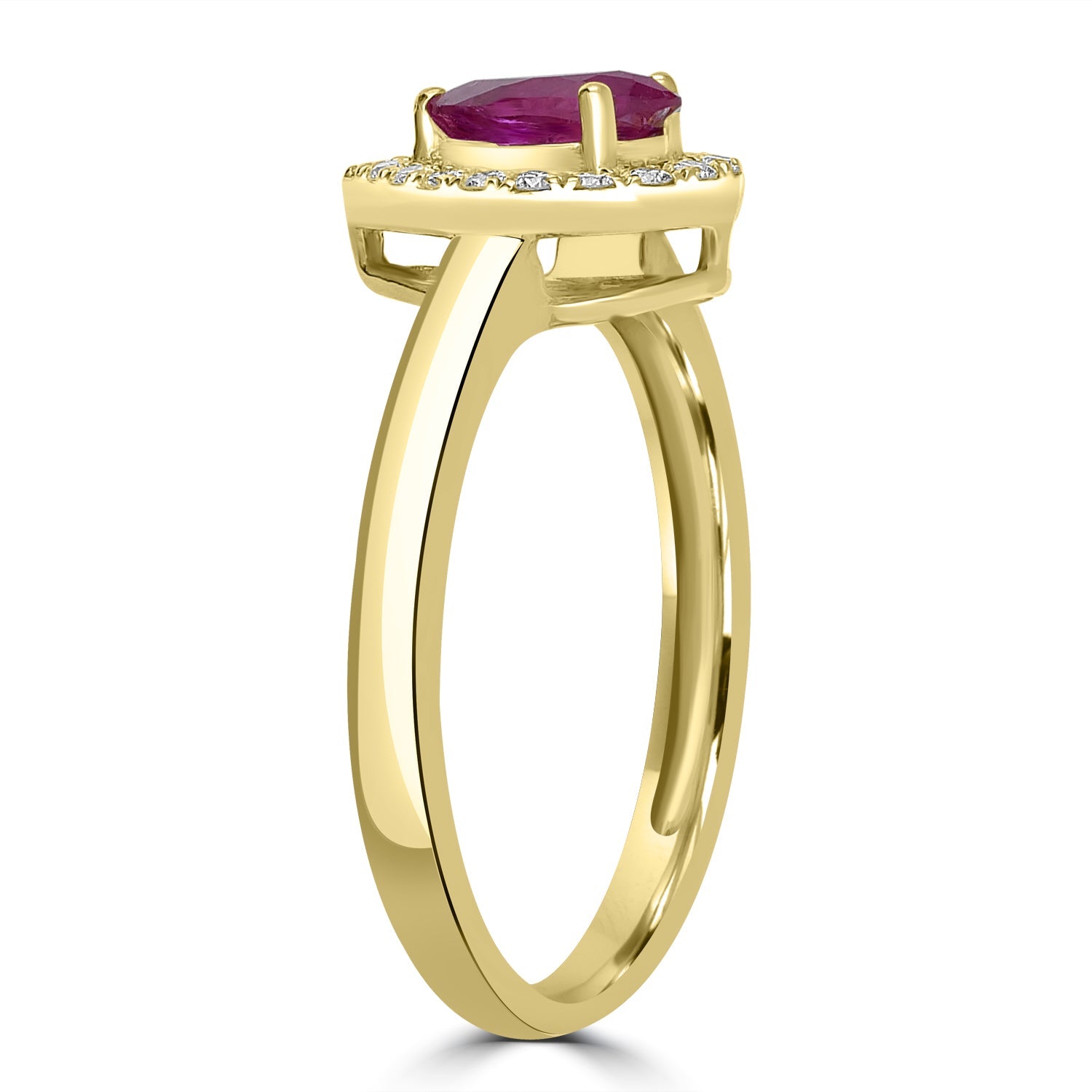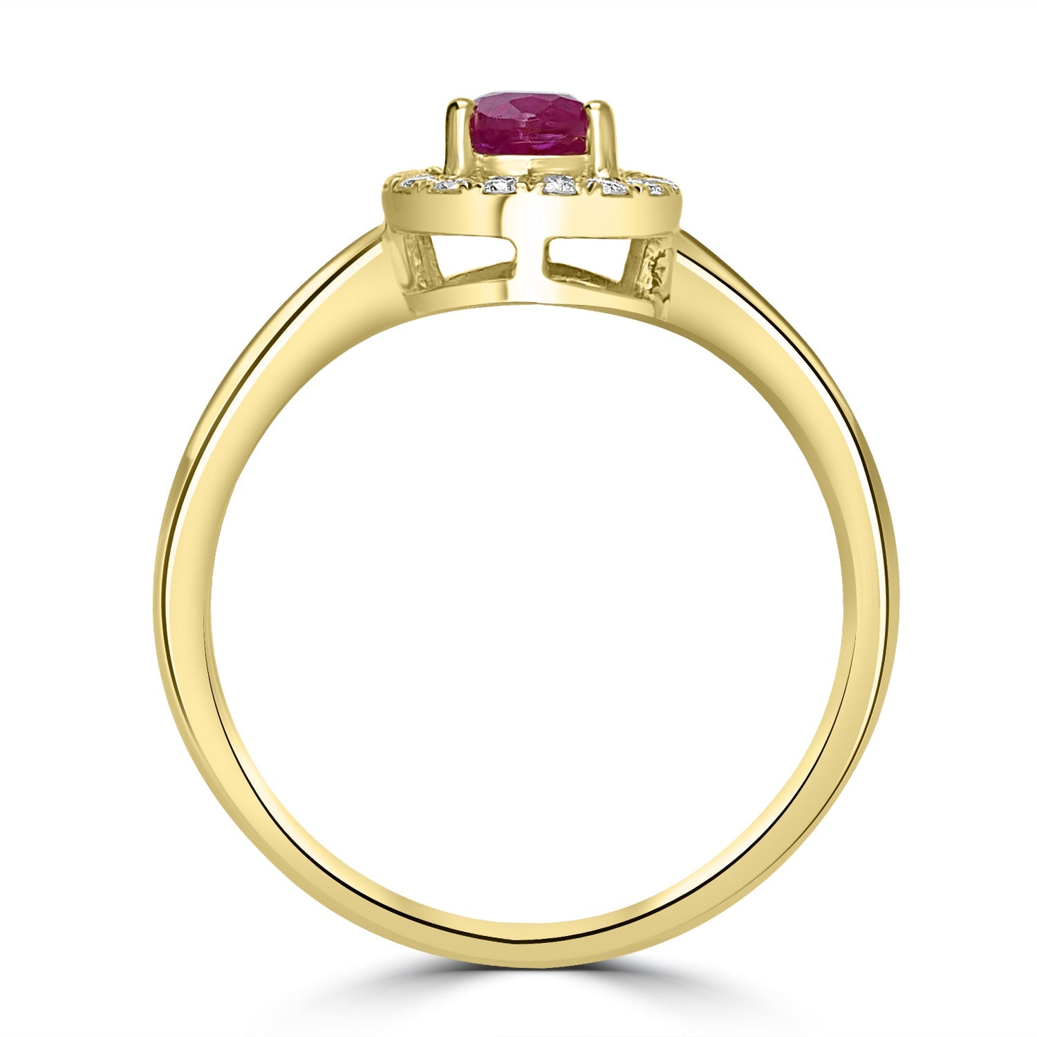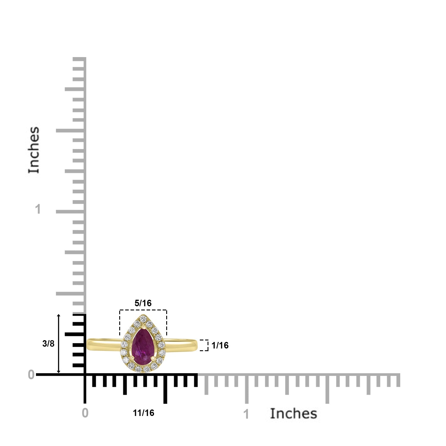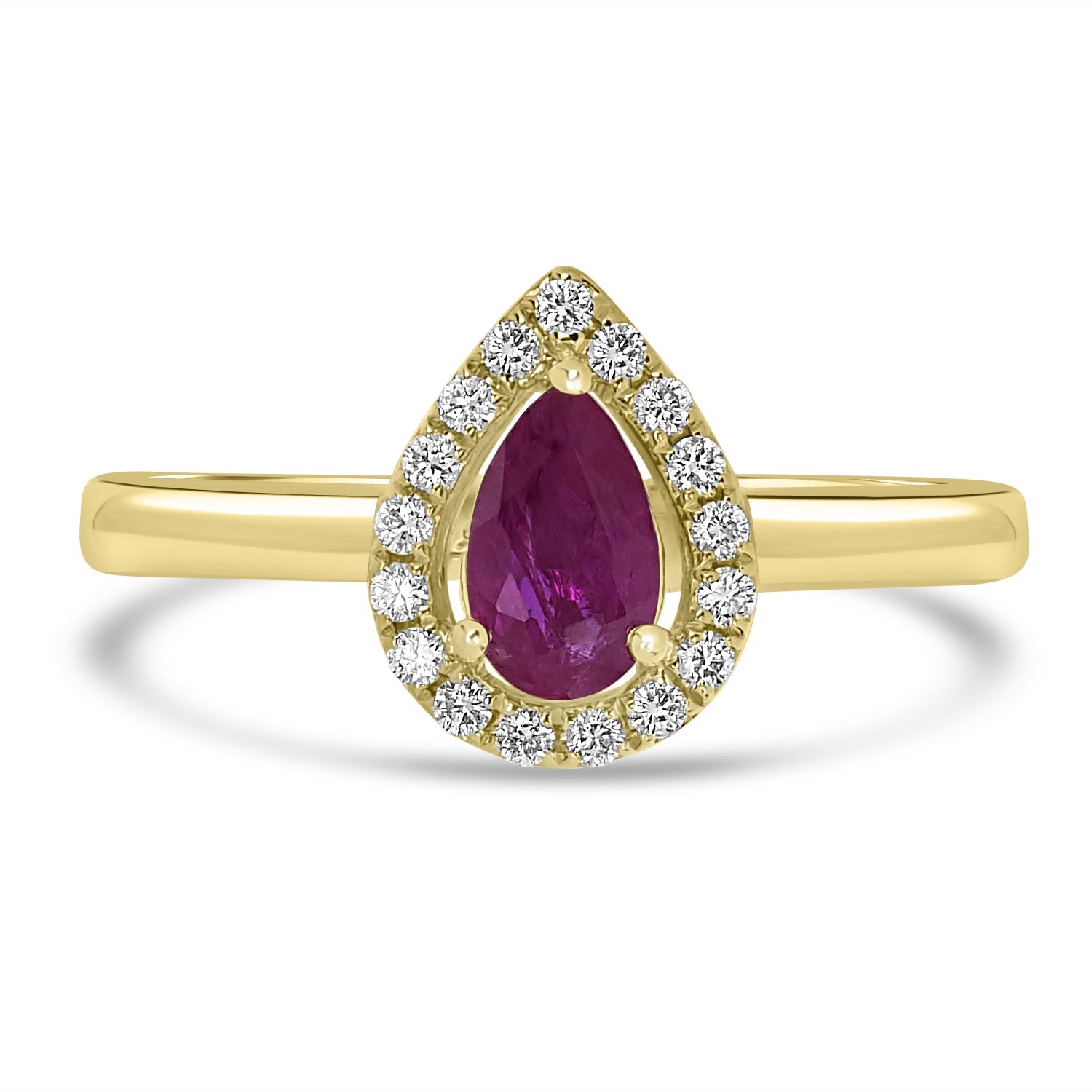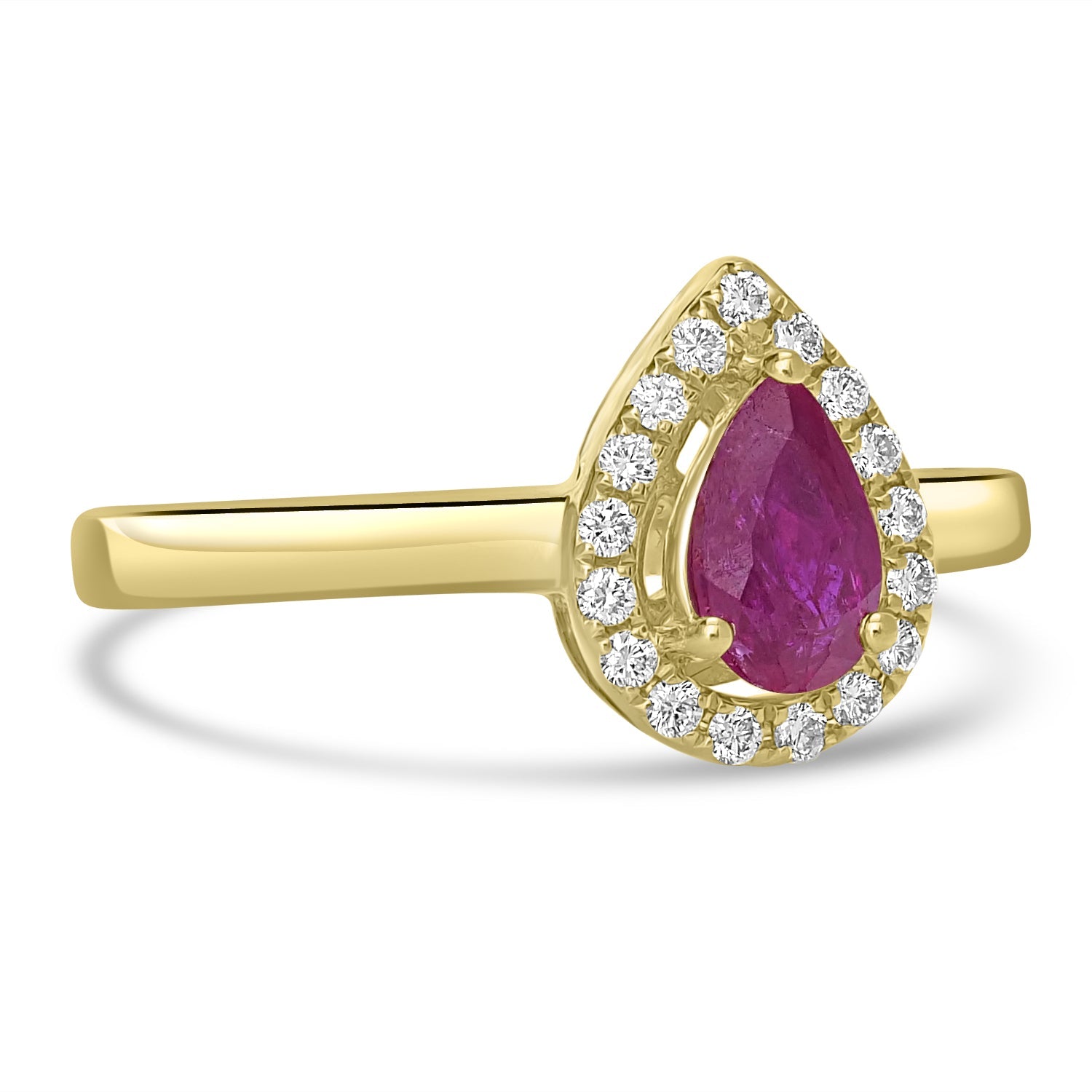 Ths enchanting 14K yellow gold ring is set with a pear-cut Ruby and round Diamonds that will get compliments.