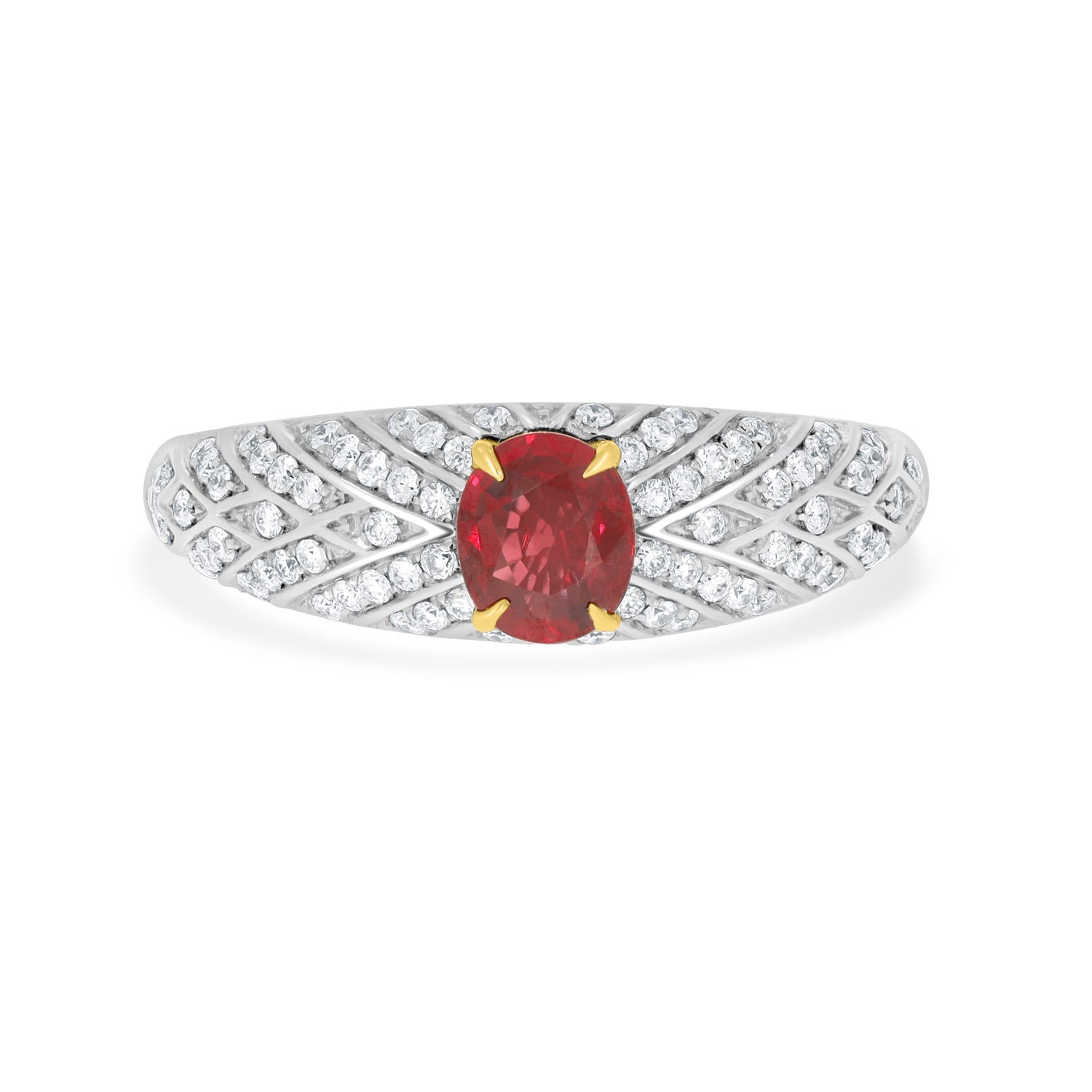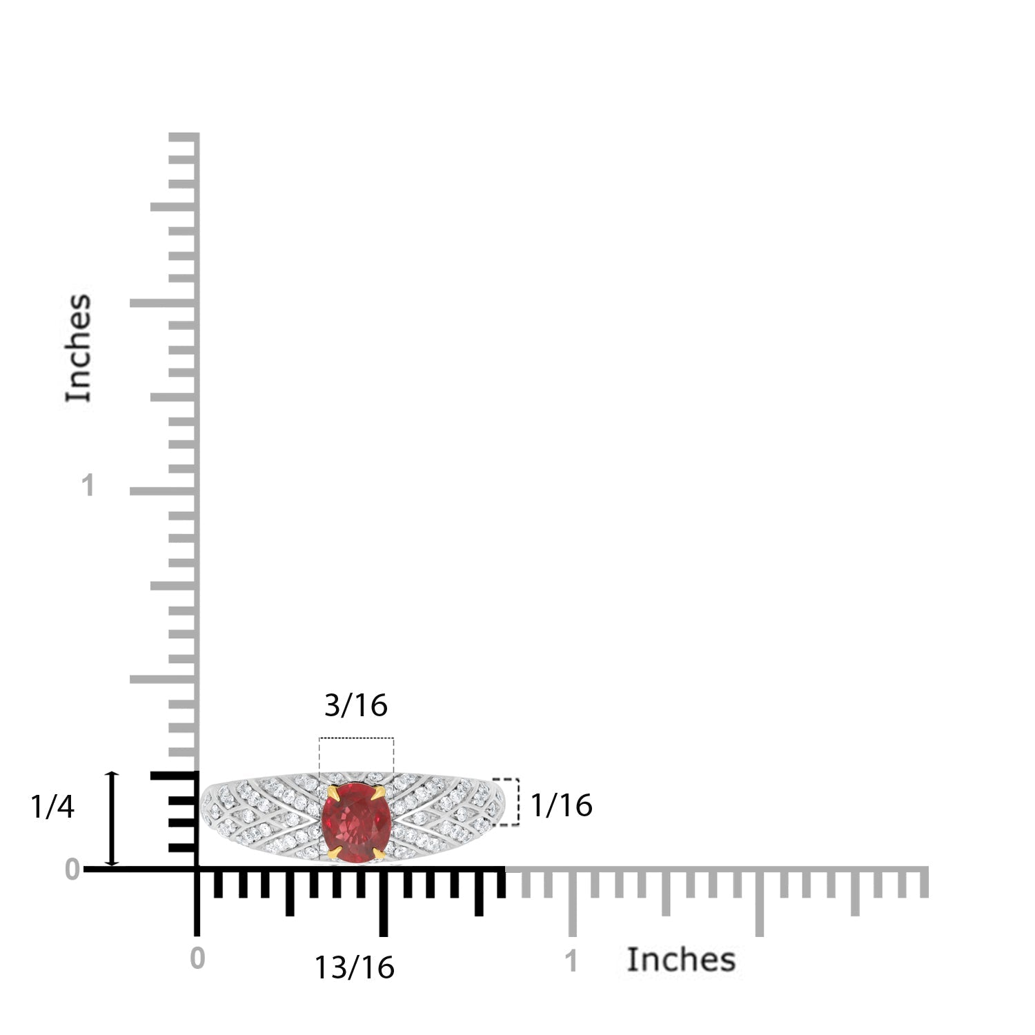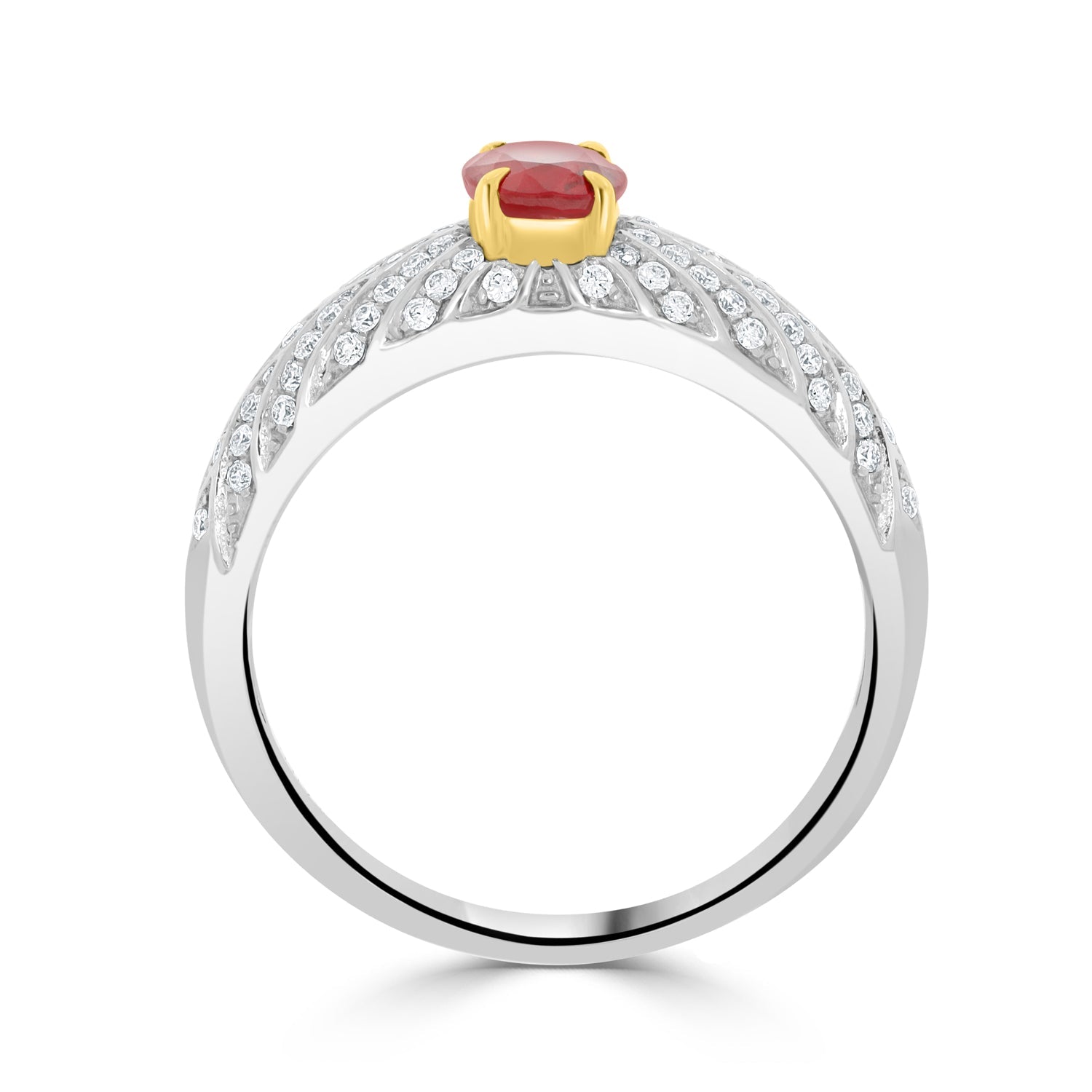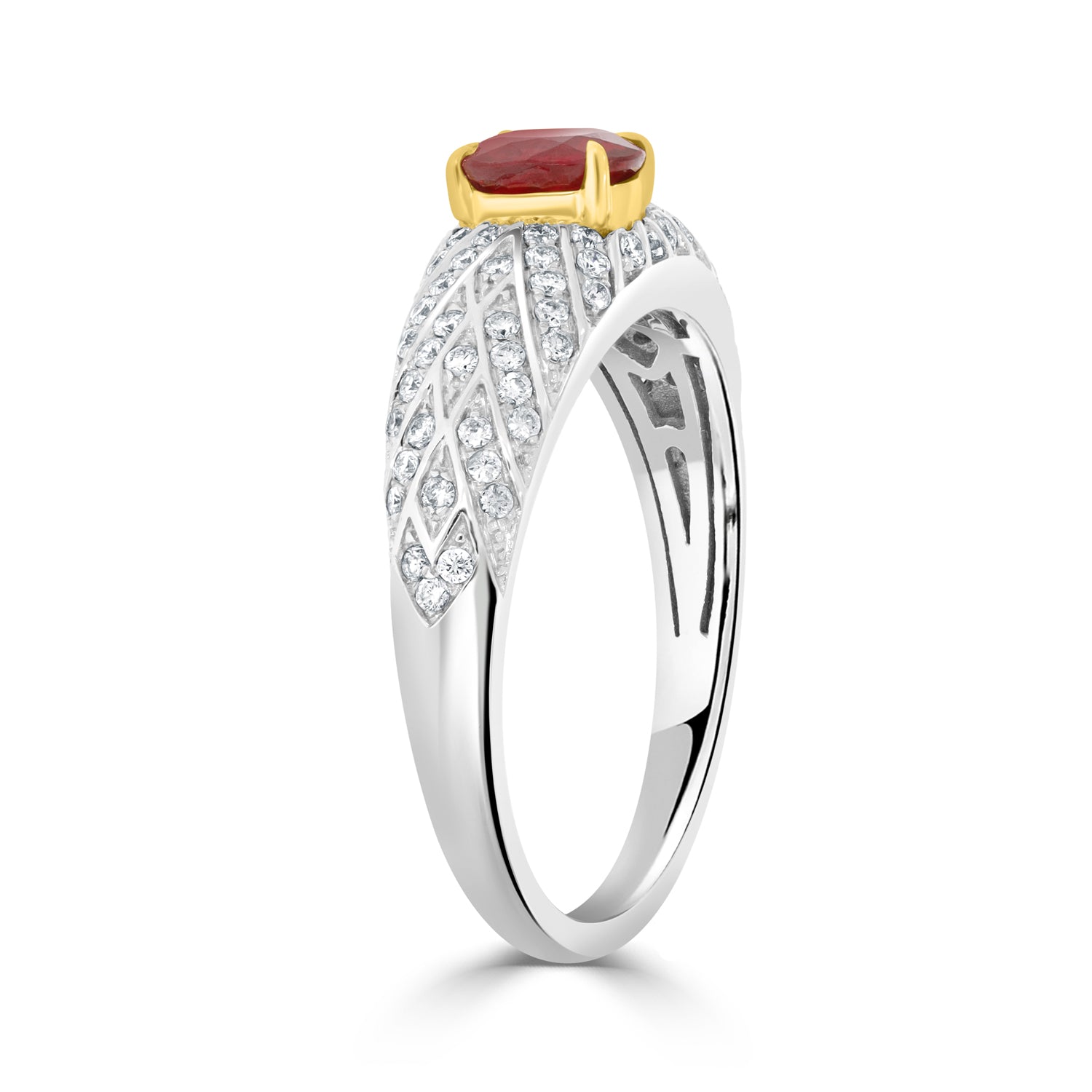 Crafted Of 18K Two Tone Gold, This Alluring Ring Is Perfect For Any Occasion. Designed With A Stunning Oval Cut Ruby, It Is Bordered By The Glitter And Shimmer Of Round Cut Diamonds Which Proffer A Mesmerizing Effect.