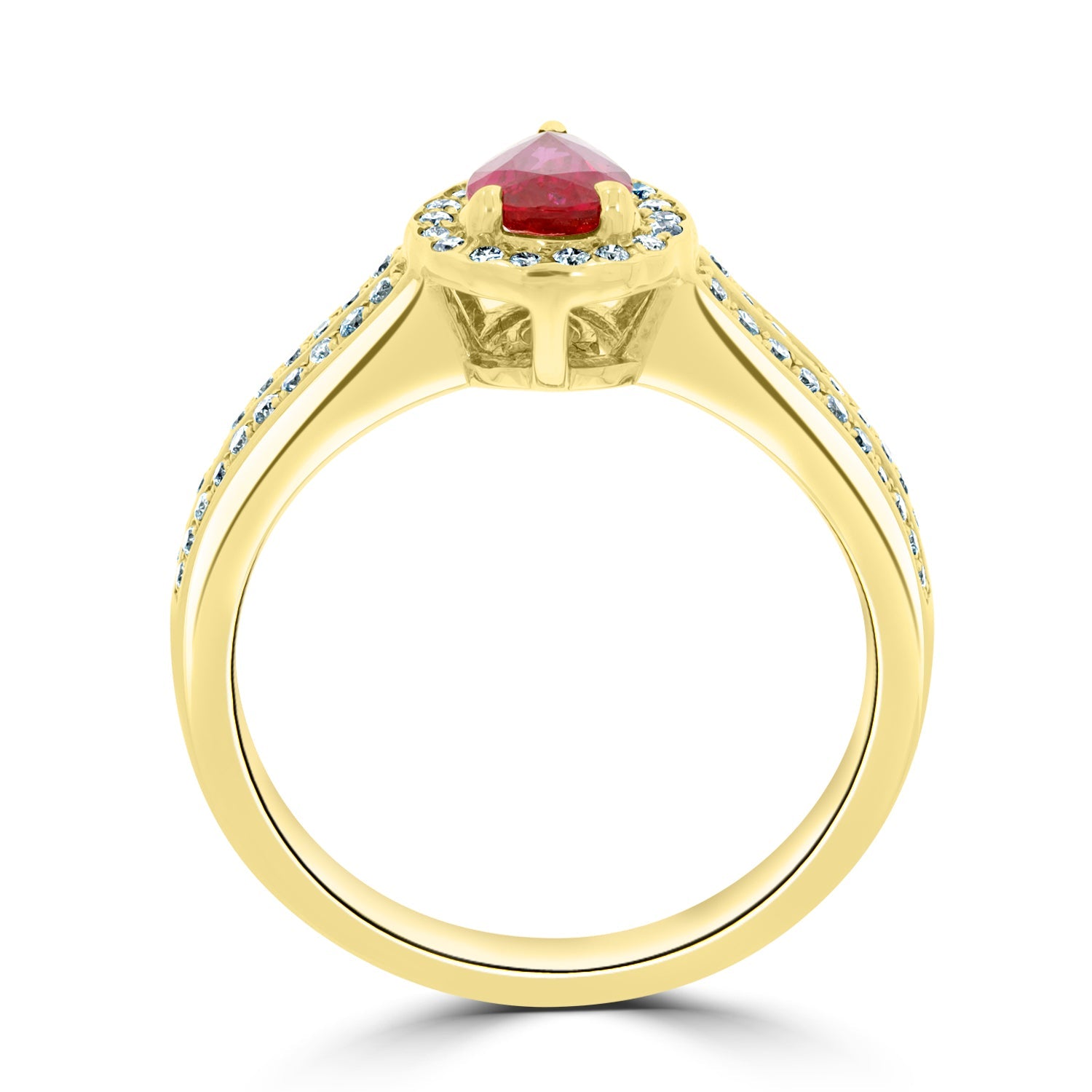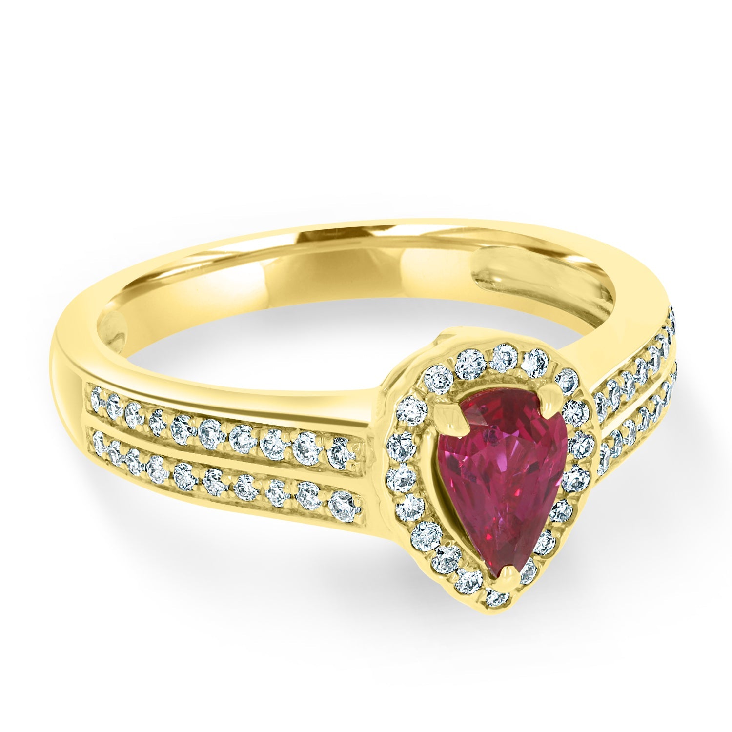 Crafted Of 14K Yellow Gold, This Exquisite Ring Is Set With A Spectacular Pear Cut Ruby At The Center And Surrounded By The Glitter And Brilliance Of Gorgeous Round Cut Diamonds That Spread A Marvelous Glow.