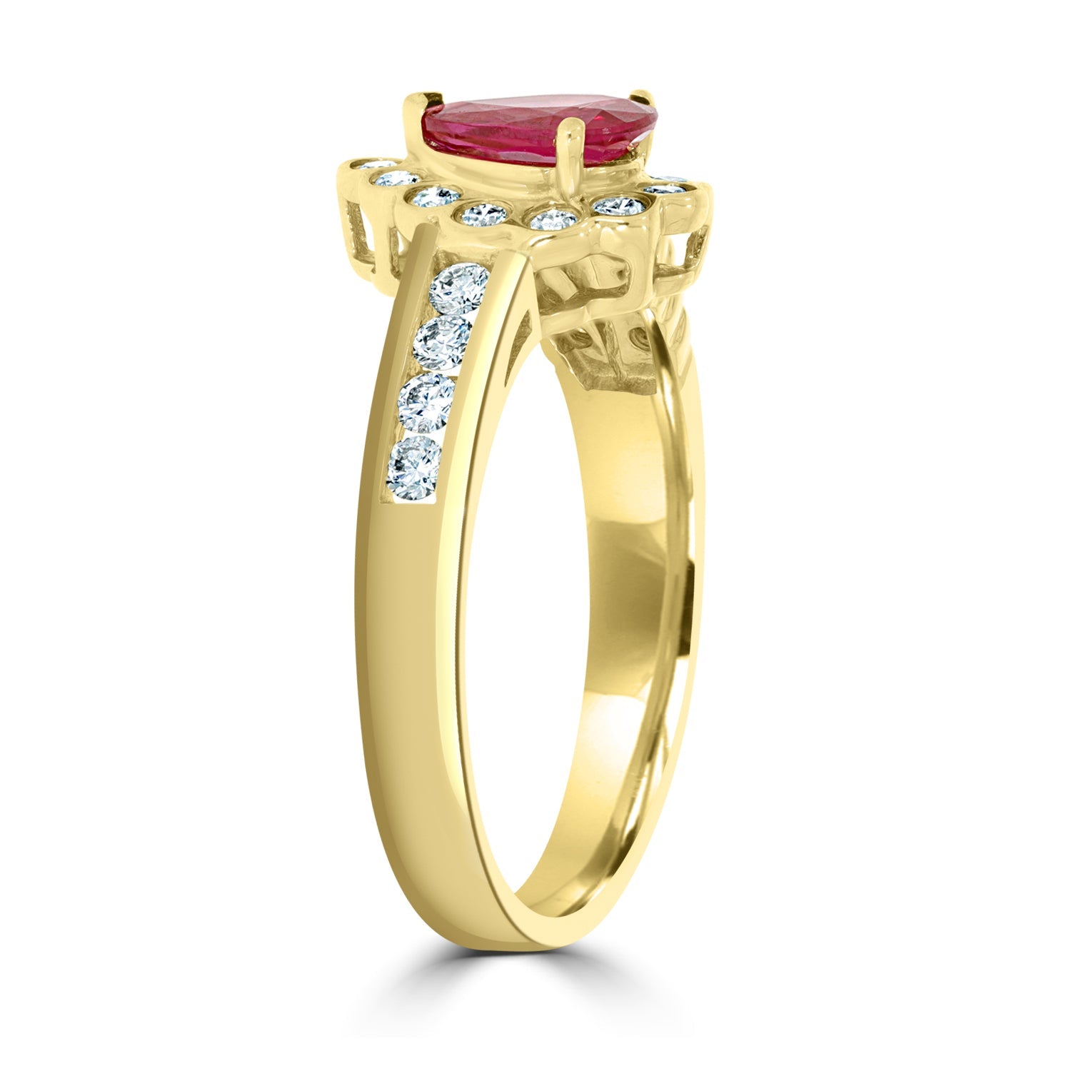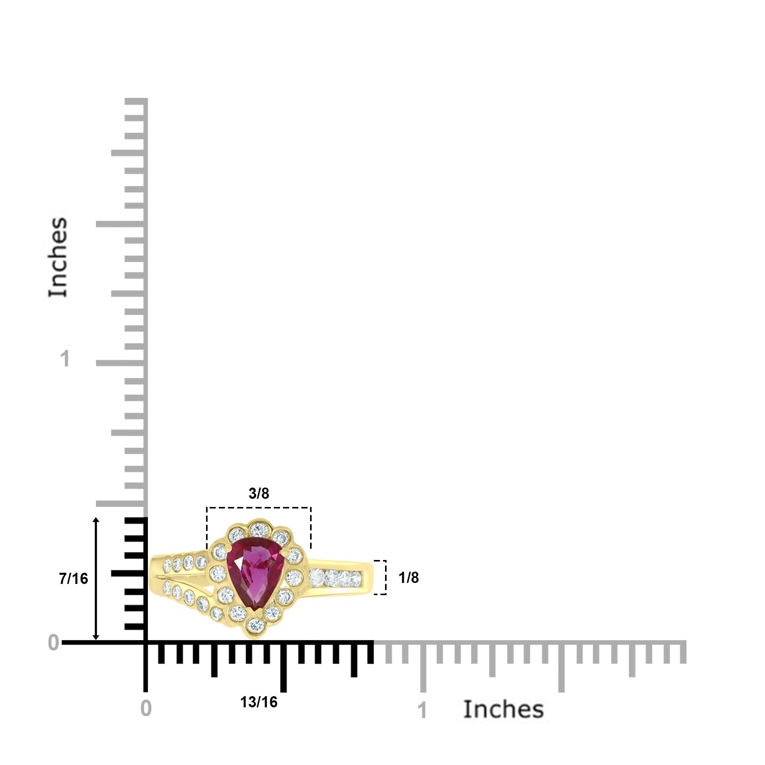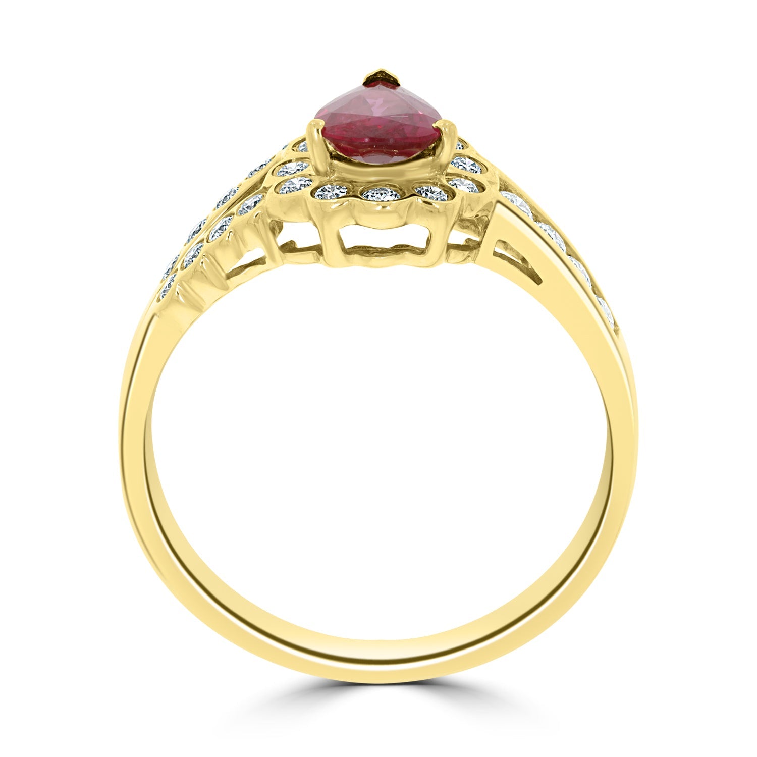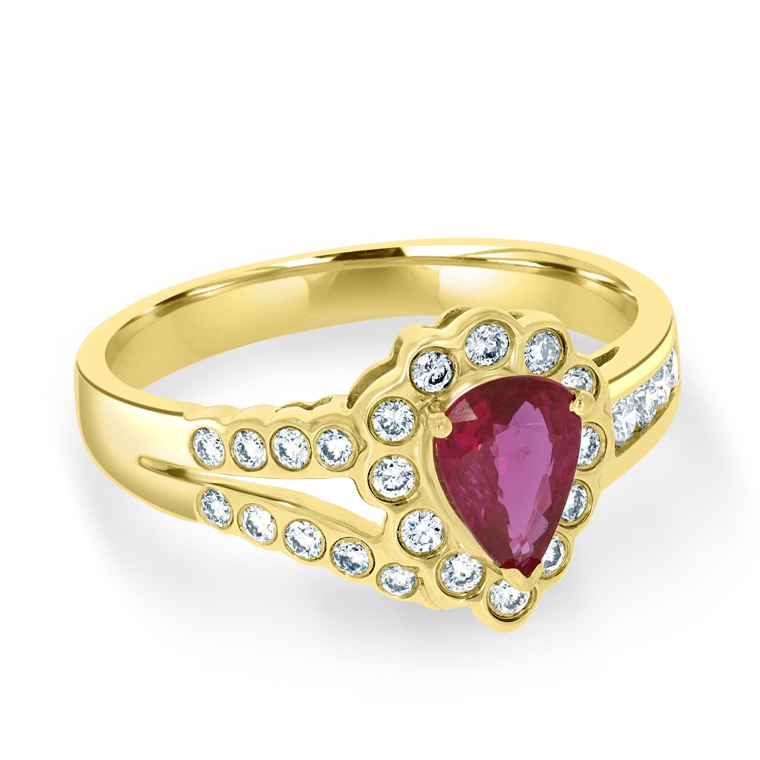 Set With A Gorgeous Pear Cut Ruby, This Spectacular Ring Is Designed With 14K Yellow Gold. Surrounded By Splendid Round Cut Diamonds, This Exquisite Jewelry Is All You Need To Make An Unforgettable Impression Everywhere You Go.