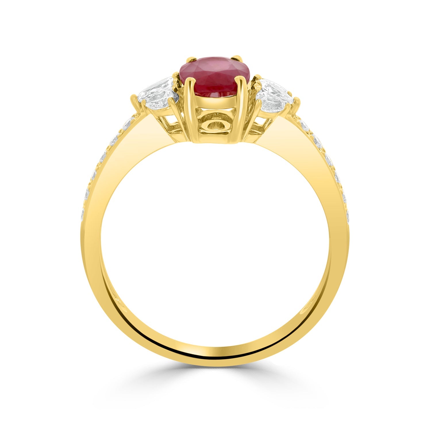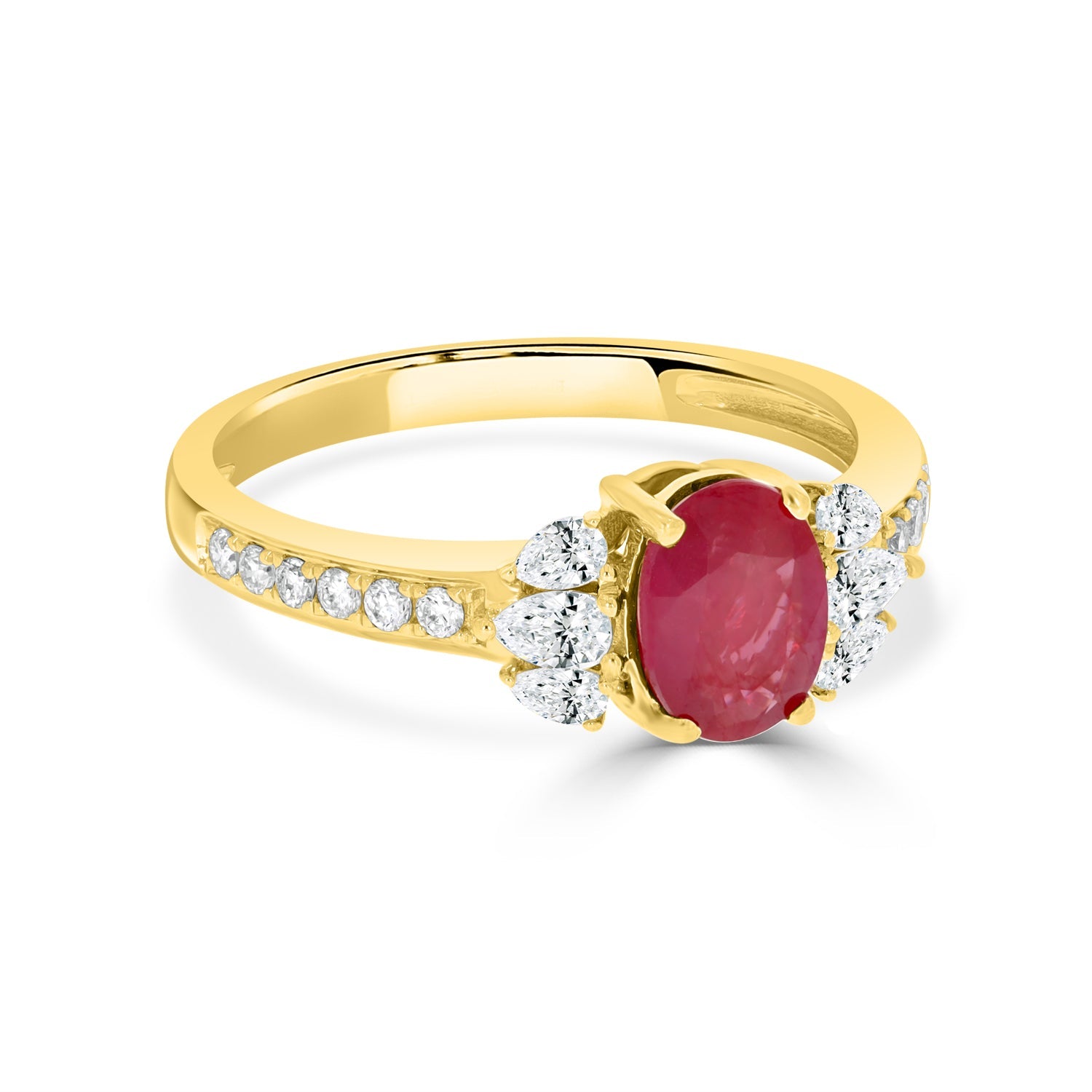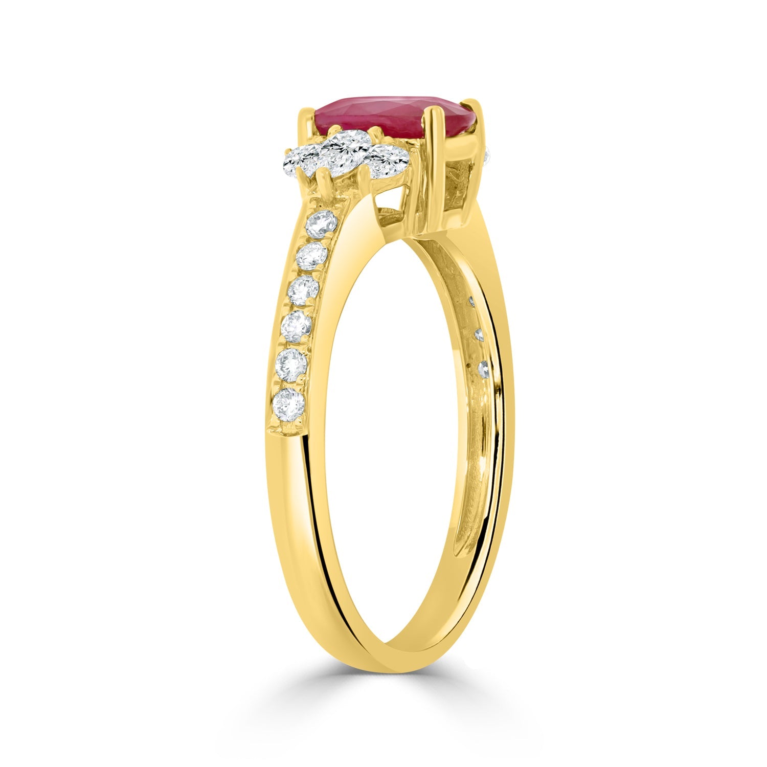 This Stylish Design Ring Offers An Incredible Luster And Sparkle To Your Classic As Well As Modern Outfits. The Oval Cut Ruby Is Perfectly Adorned Amidst Round Diamonds In 14K Yellow Gold With Perfect Harmony To Make It Appealing.