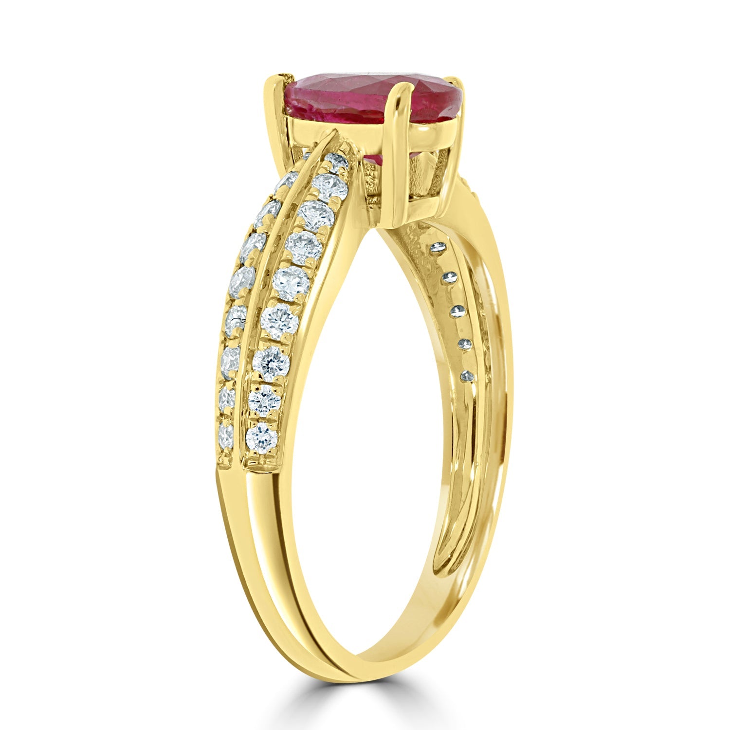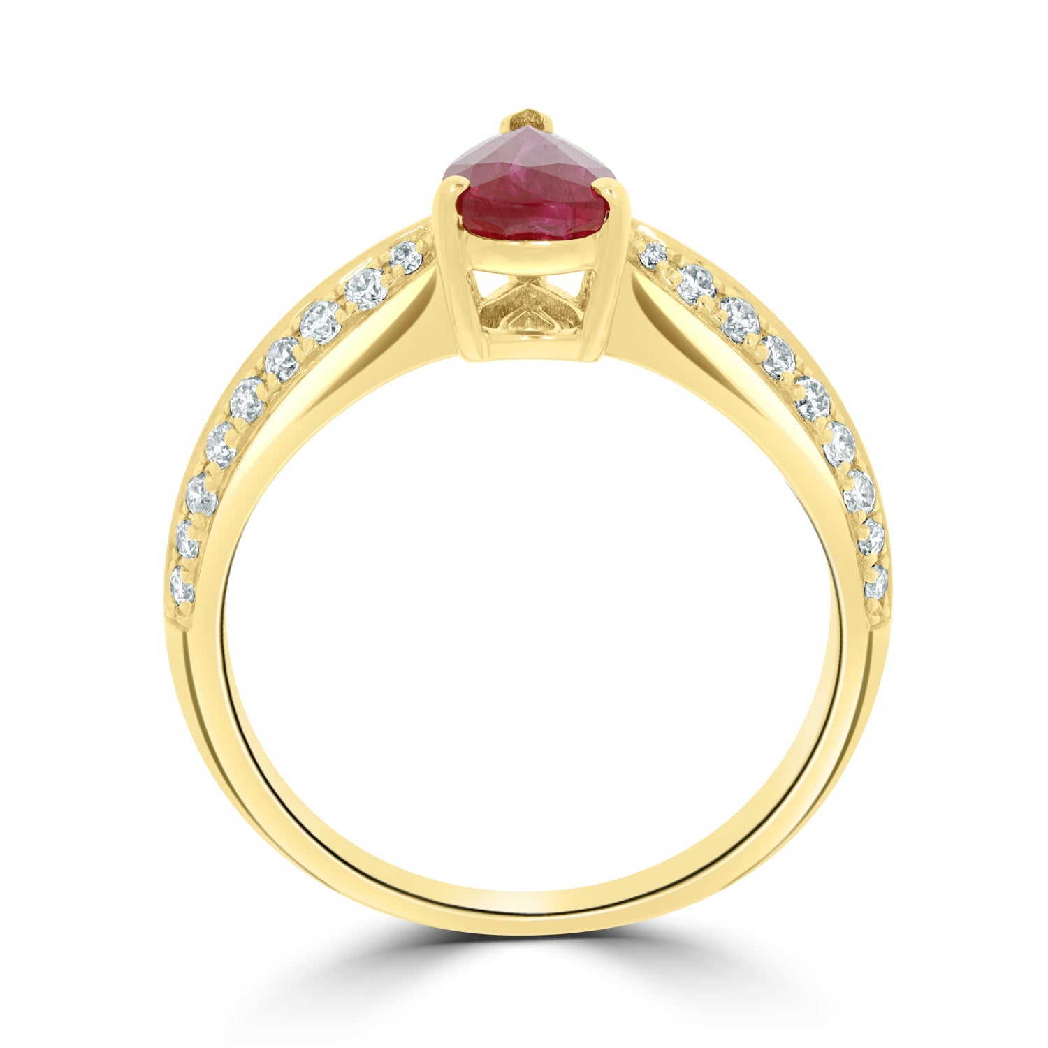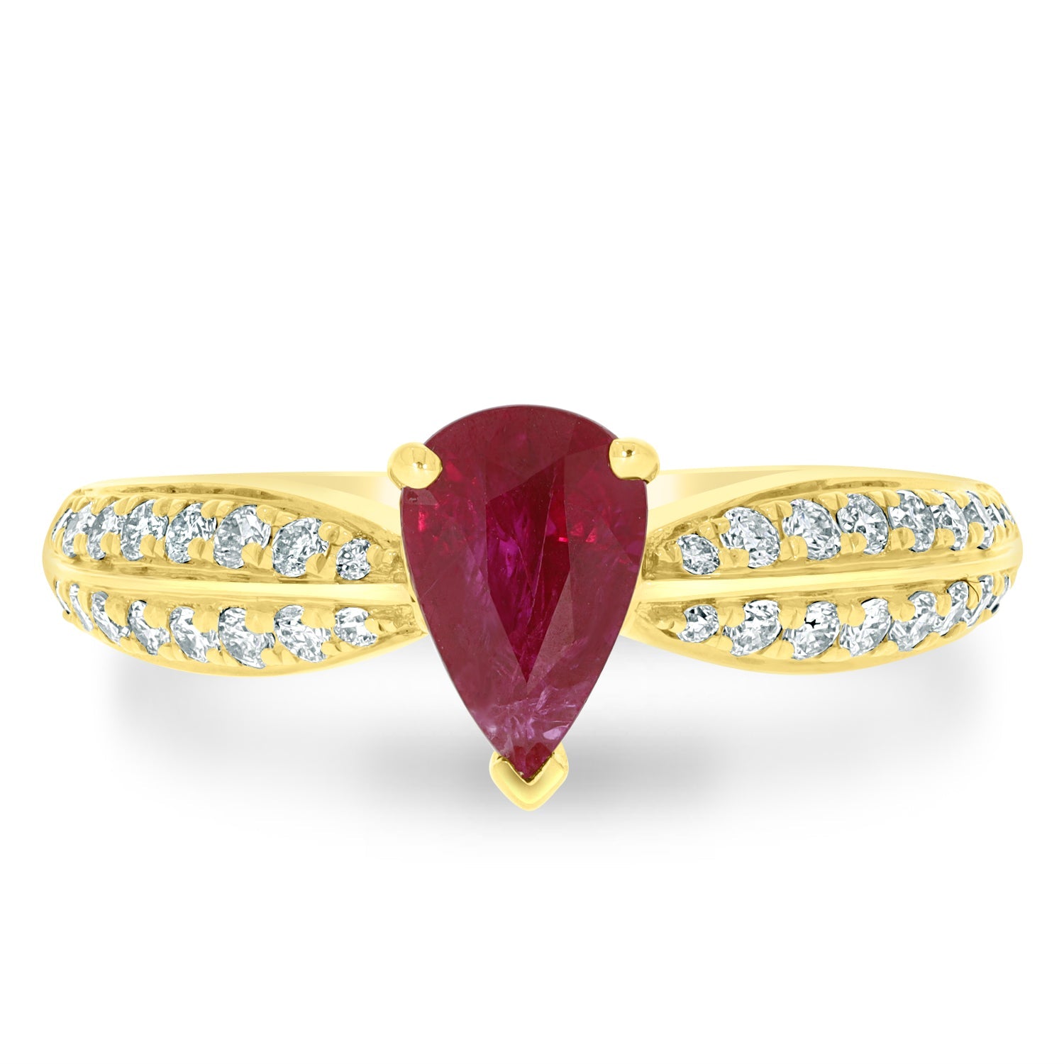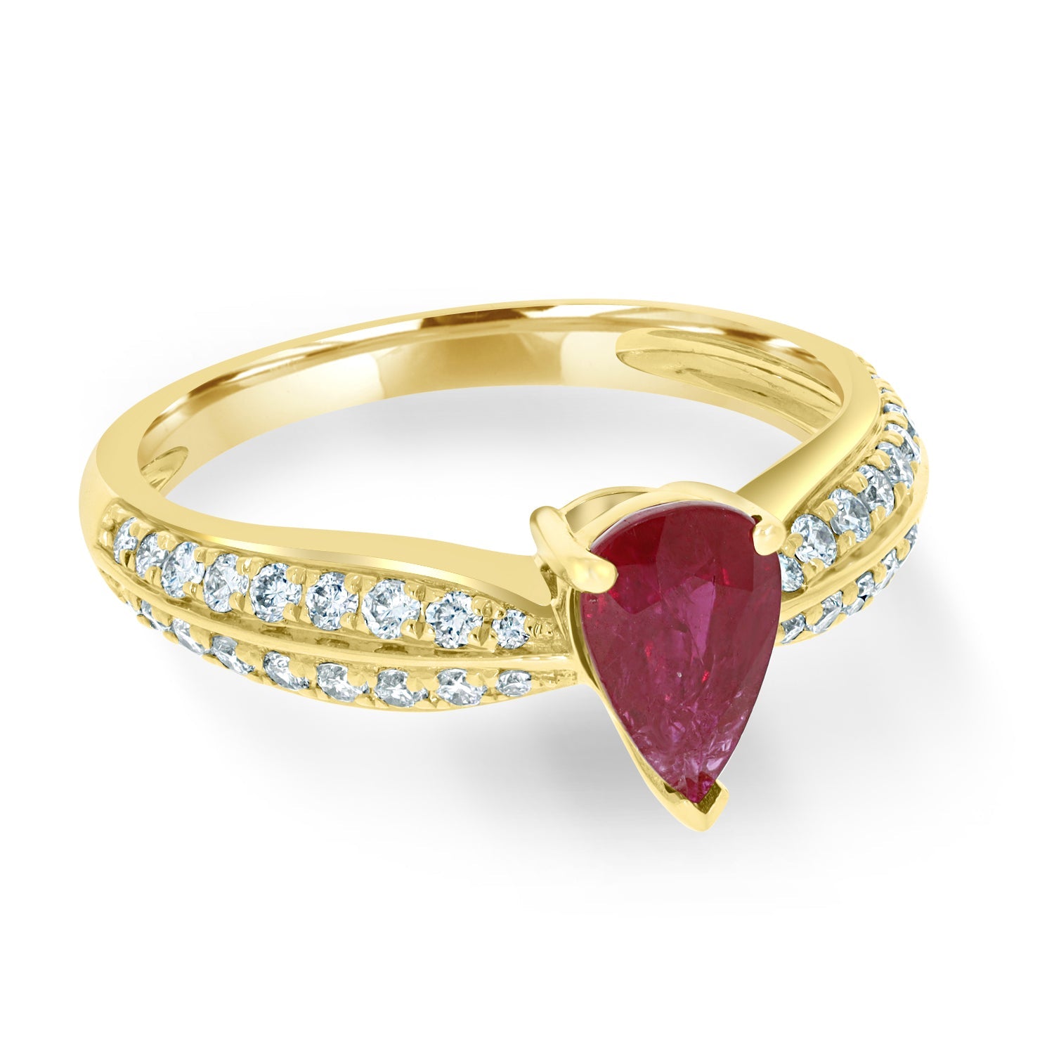 Set With An Exquisite Pear Cut Ruby, The Unmatched Brilliance Of This Ring Comes From The Glowing Round Cut Diamonds That Surround It. Crafted Of 14K Yellow Gold, This Stunning Ring Complements Your Natural Elegance With Flair.