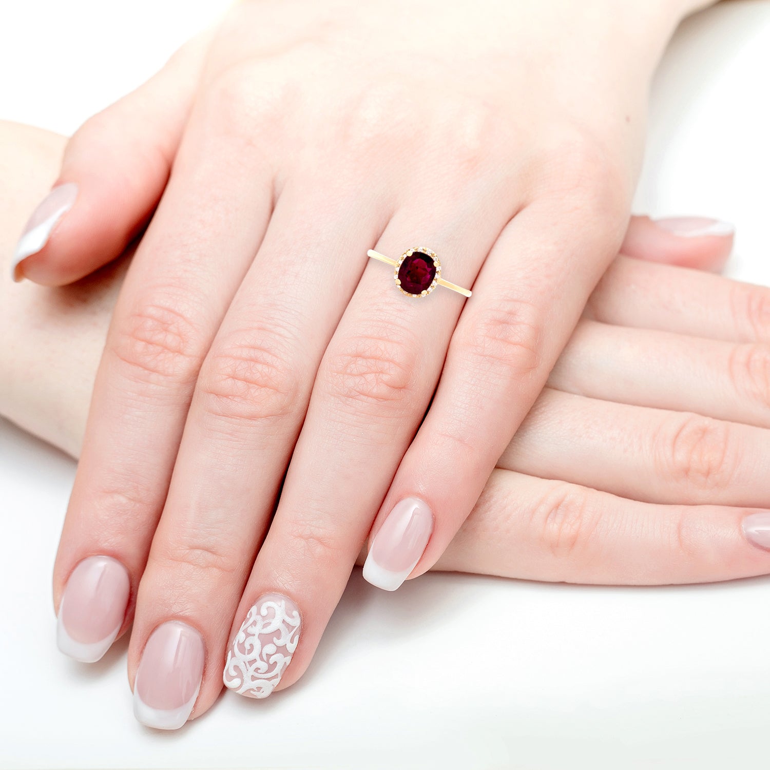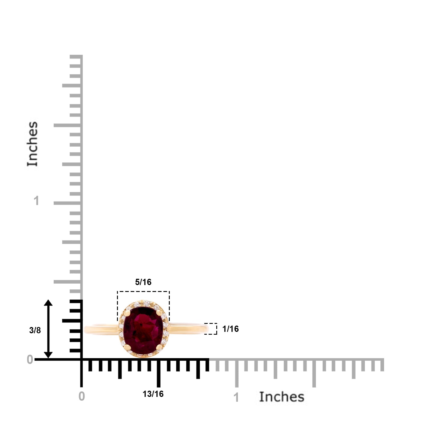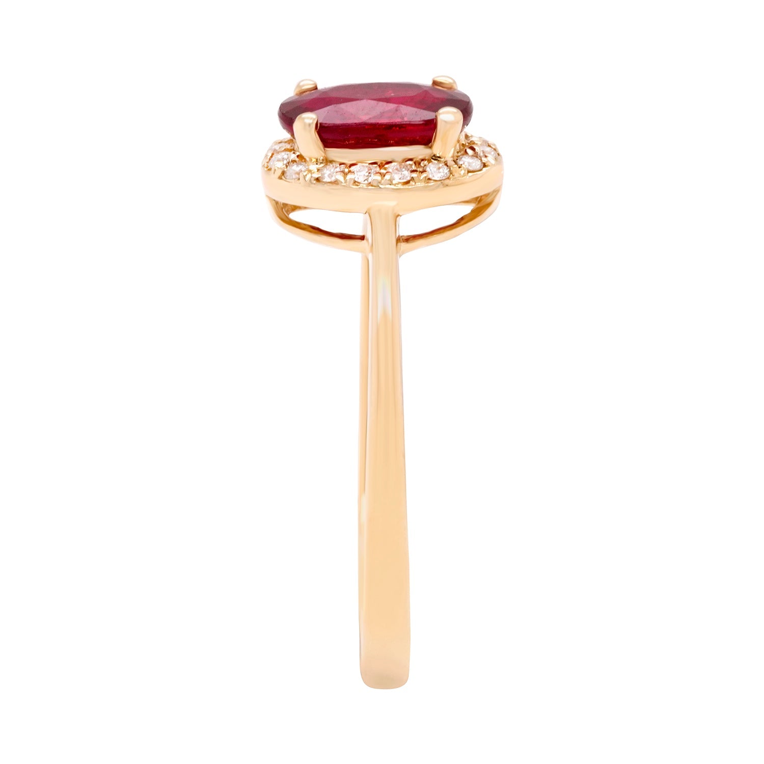 Add a fabulous accent to your wardrobe that accentuates grace. Crafted from 14k yellow gold, this ring gives you a luxury look. The oval cut Ruby and round Diamonds are a tribute to the ethereal charm. Wear it to be part of the latest styles without losing the traditional feel.