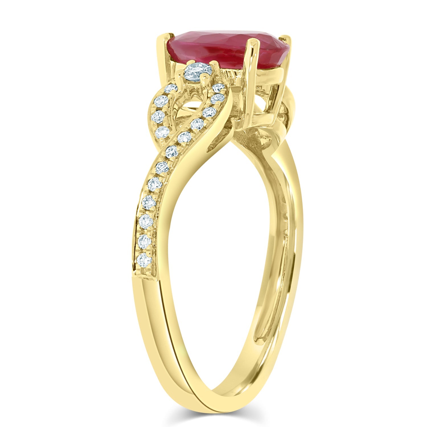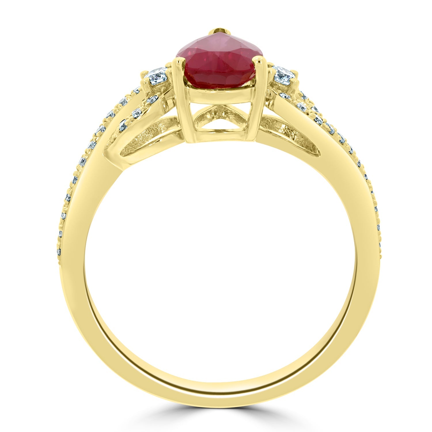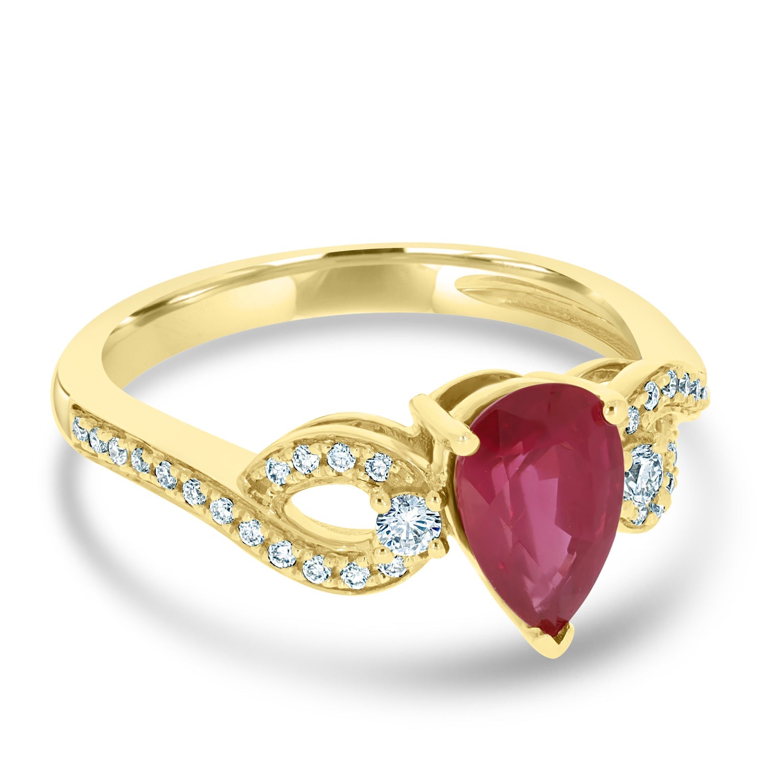 Crafted Of 14K Yellow Gold, The Rich Finish Of This Splendid Ring Is Accentuated By The Fabulous Pear Cut Ruby. Surrounded By Sparkling Round Cut Diamonds, The Endless Radiance Of This Fine Jewelry Is Truly Unmatched.