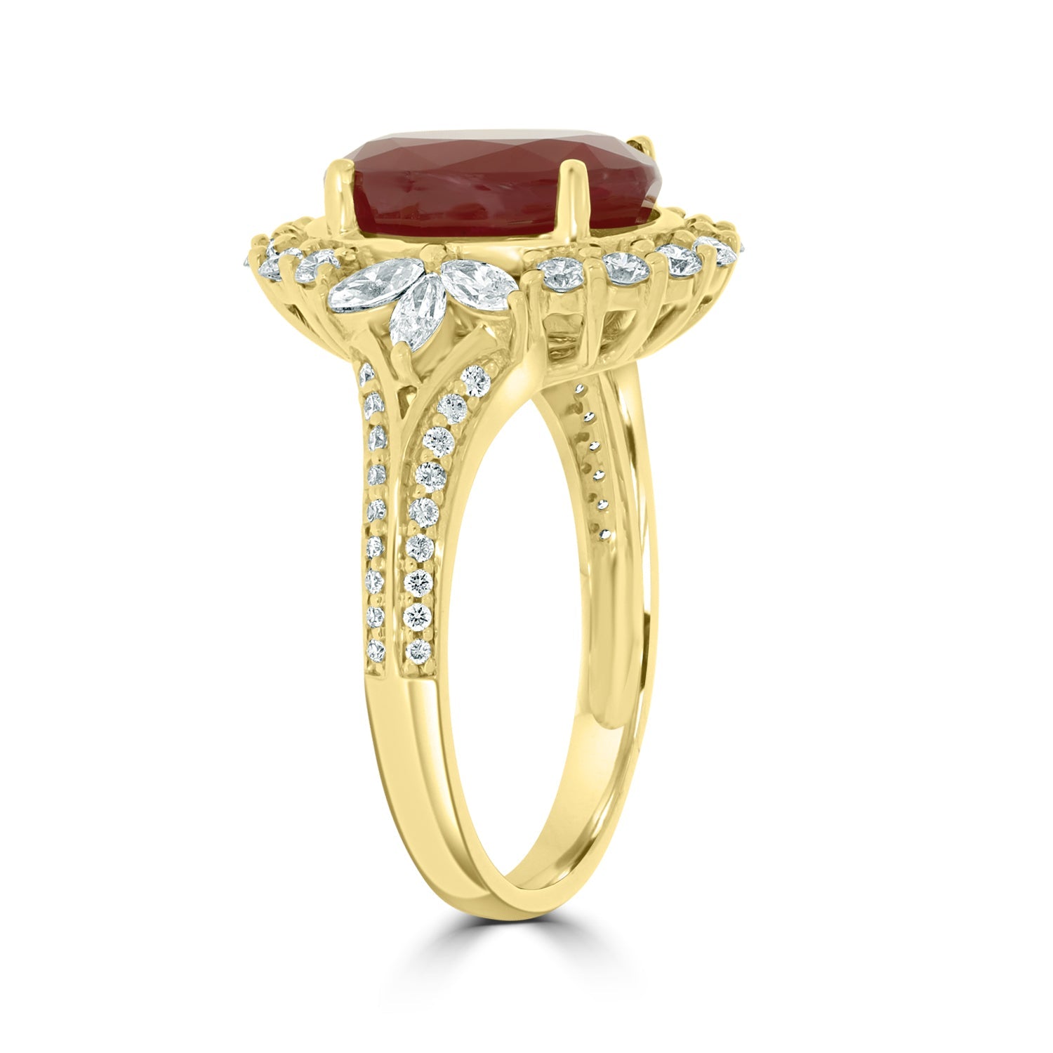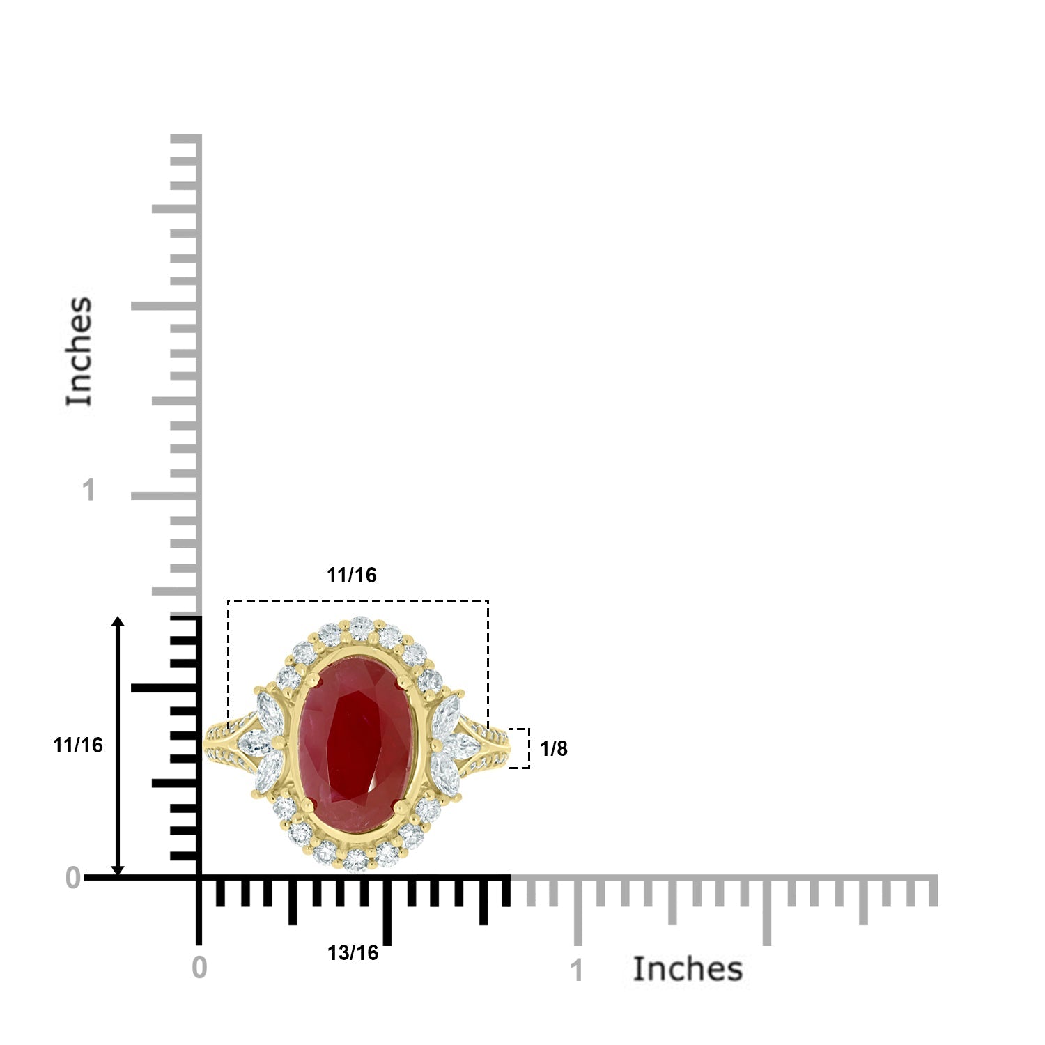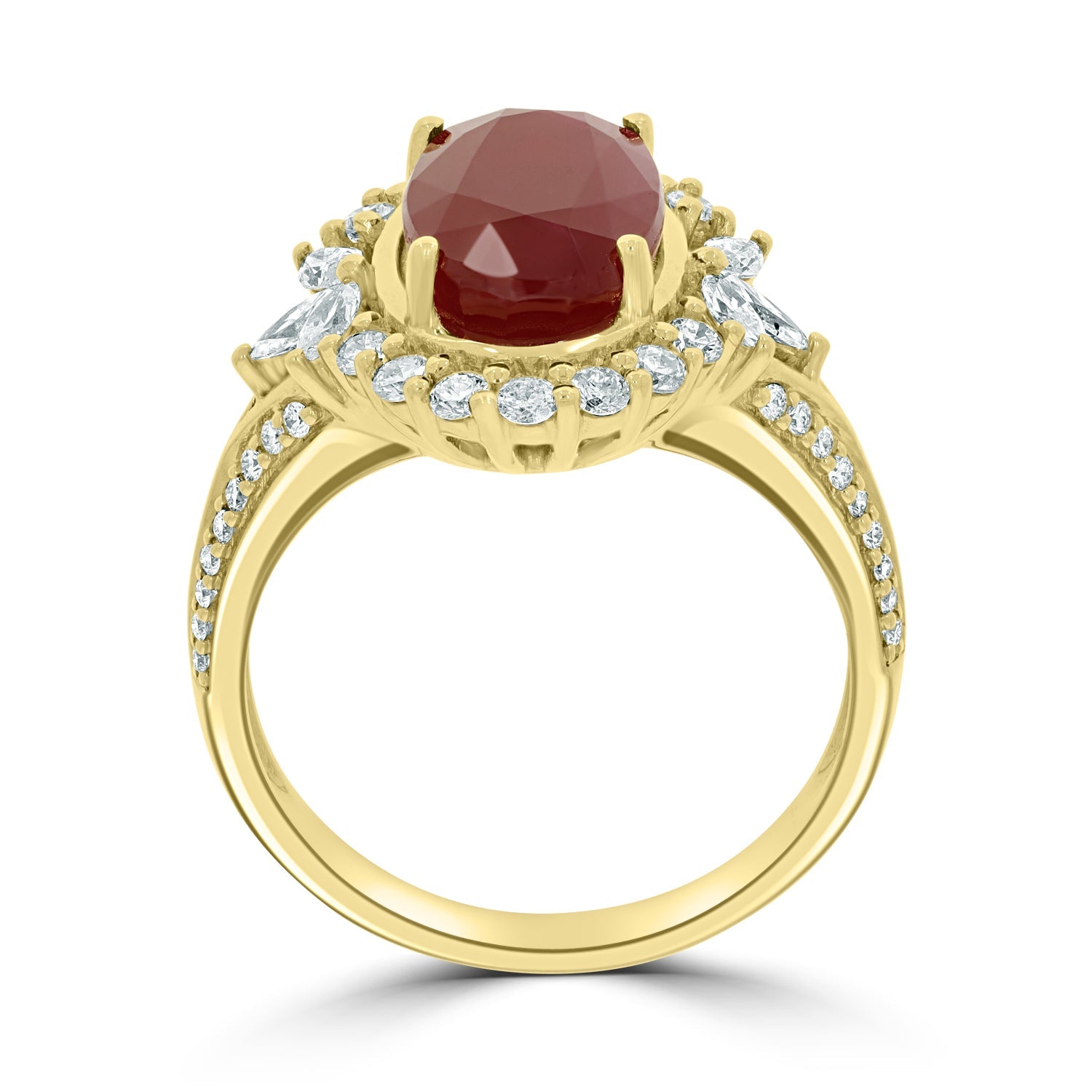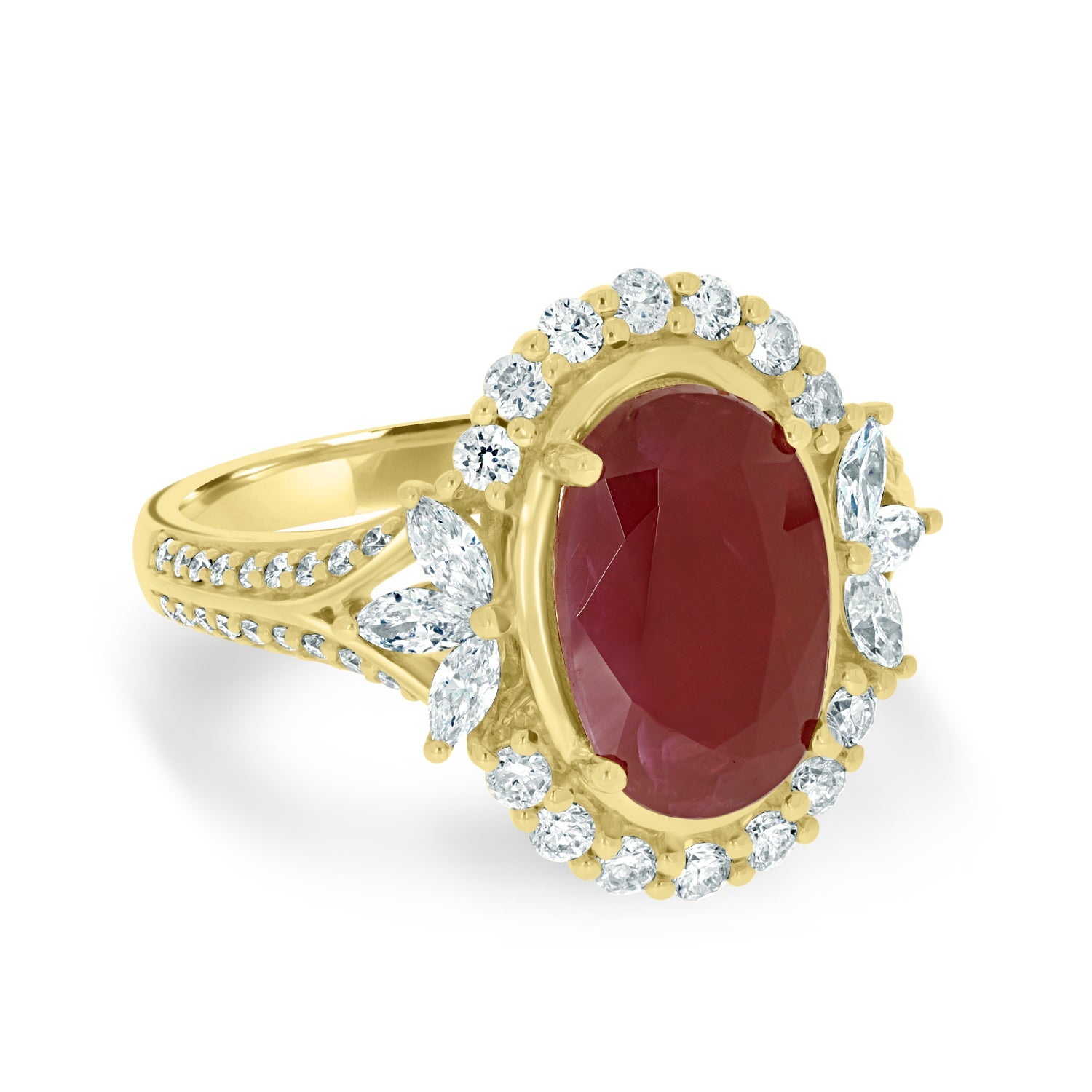 Set With A Stunning Oval Cut Ruby, This Exquisite Ring Is Bordered By Gorgeous Mix Cut Diamonds That Sparkle And Brilliance With Unparalleled Beauty. Crafted Of 14K Yellow Gold, This Enchanting Ring Highlights Your Elegance And Charm Perfectly.