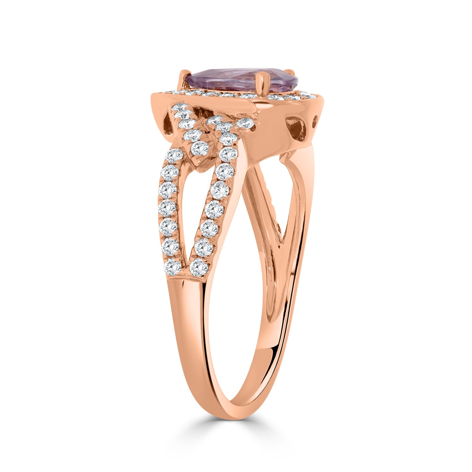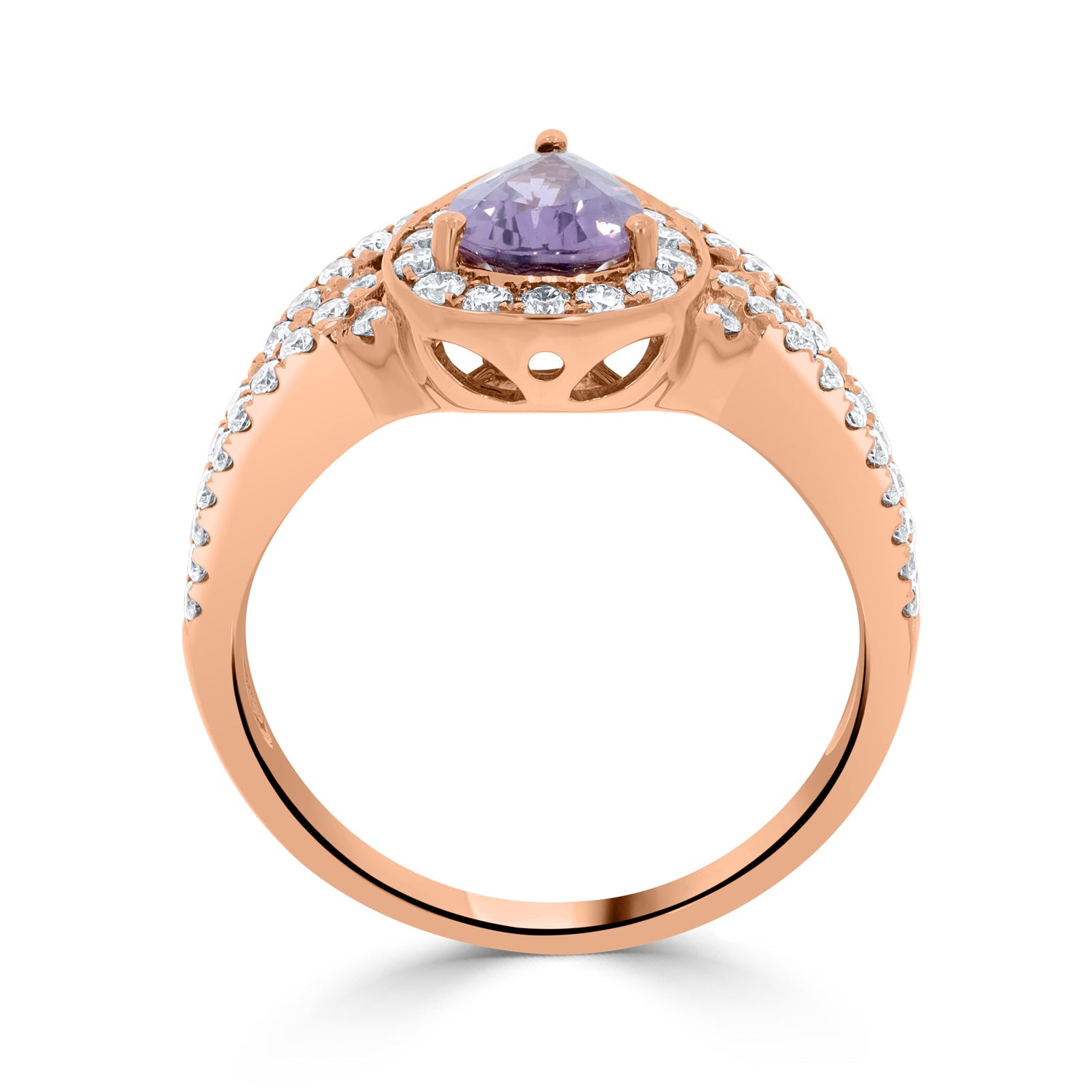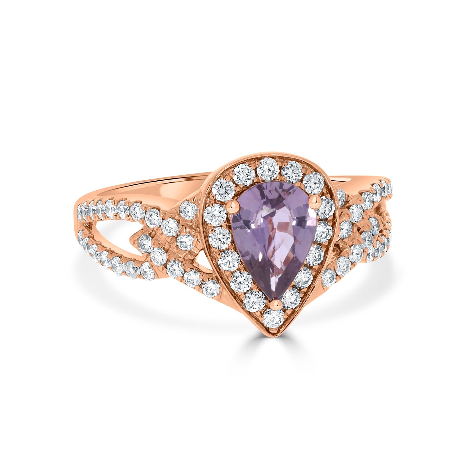 Crafted From 18k Rose Gold, This Luxurious Ring Is A Standout. The Lovely Hue Of The Pear-cut No Heat Certified Sapphire And The Sparkle Of The Round Diamonds Add Elegance To The Piece.
