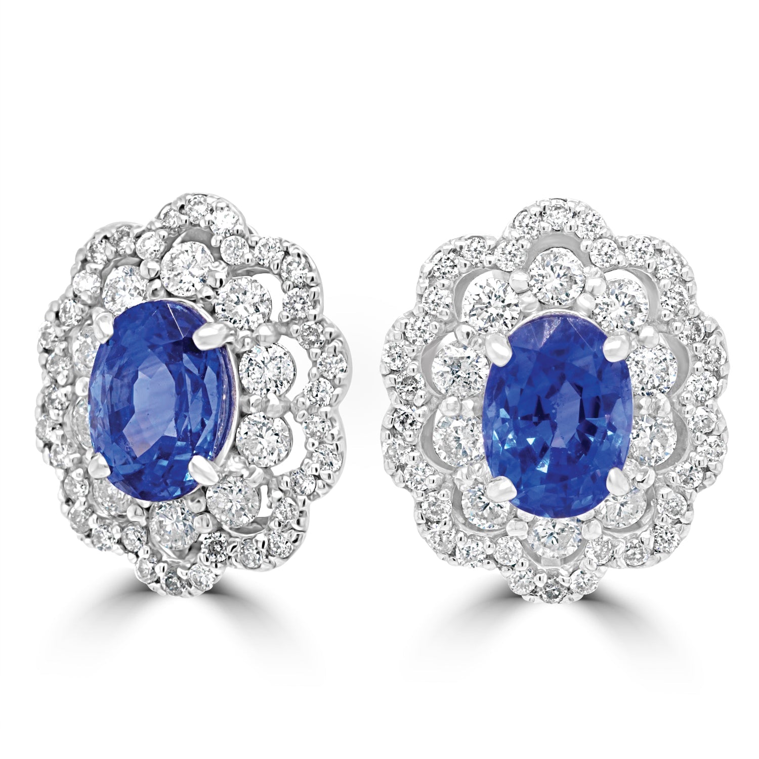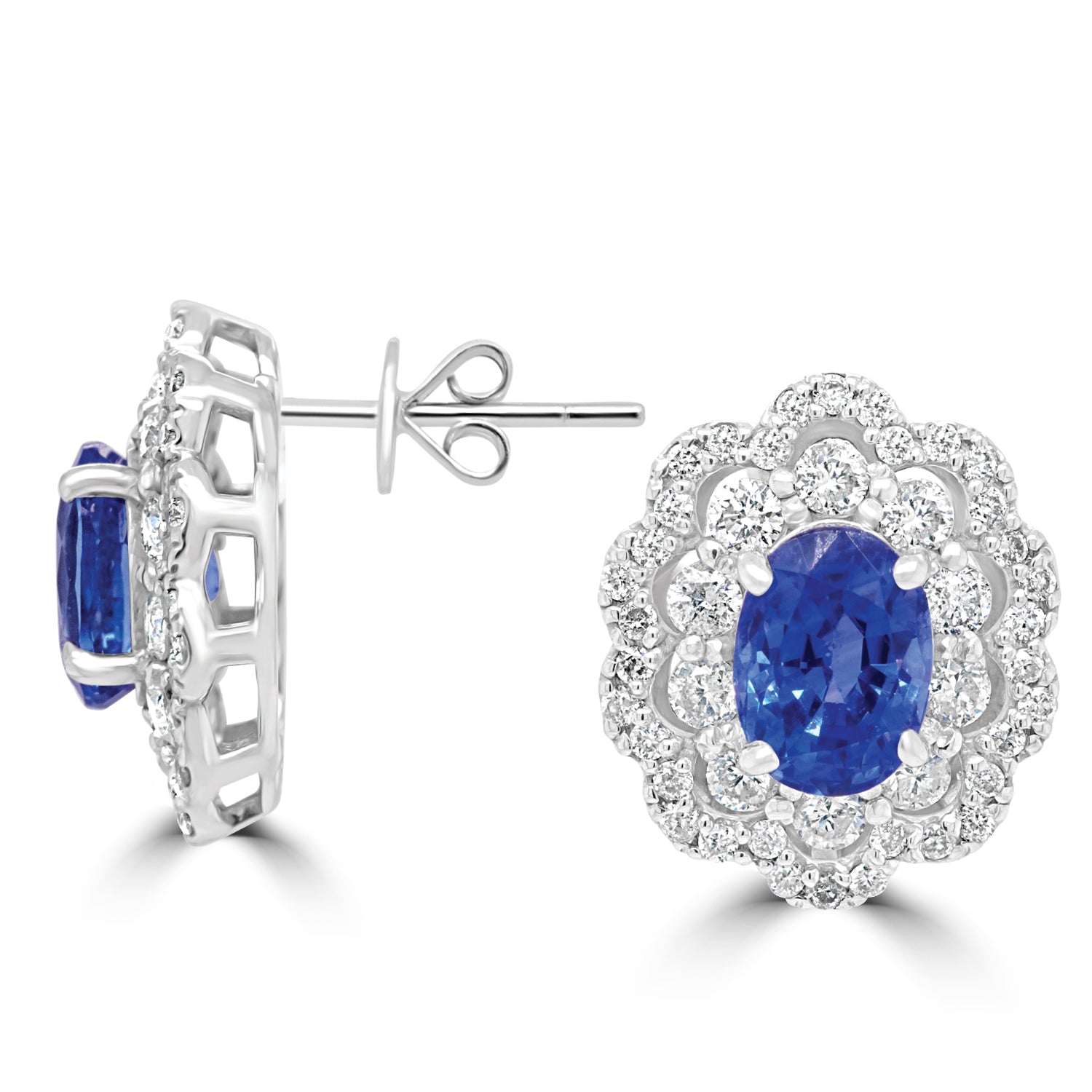 Crafted of 18K white gold for a dazzling finish, these enchanting earrings are studded with a sparkling oval-cut Sapphire at the center and further surrounded by majestic round-cut Diamonds that will add an exquisite addition to your outfit.