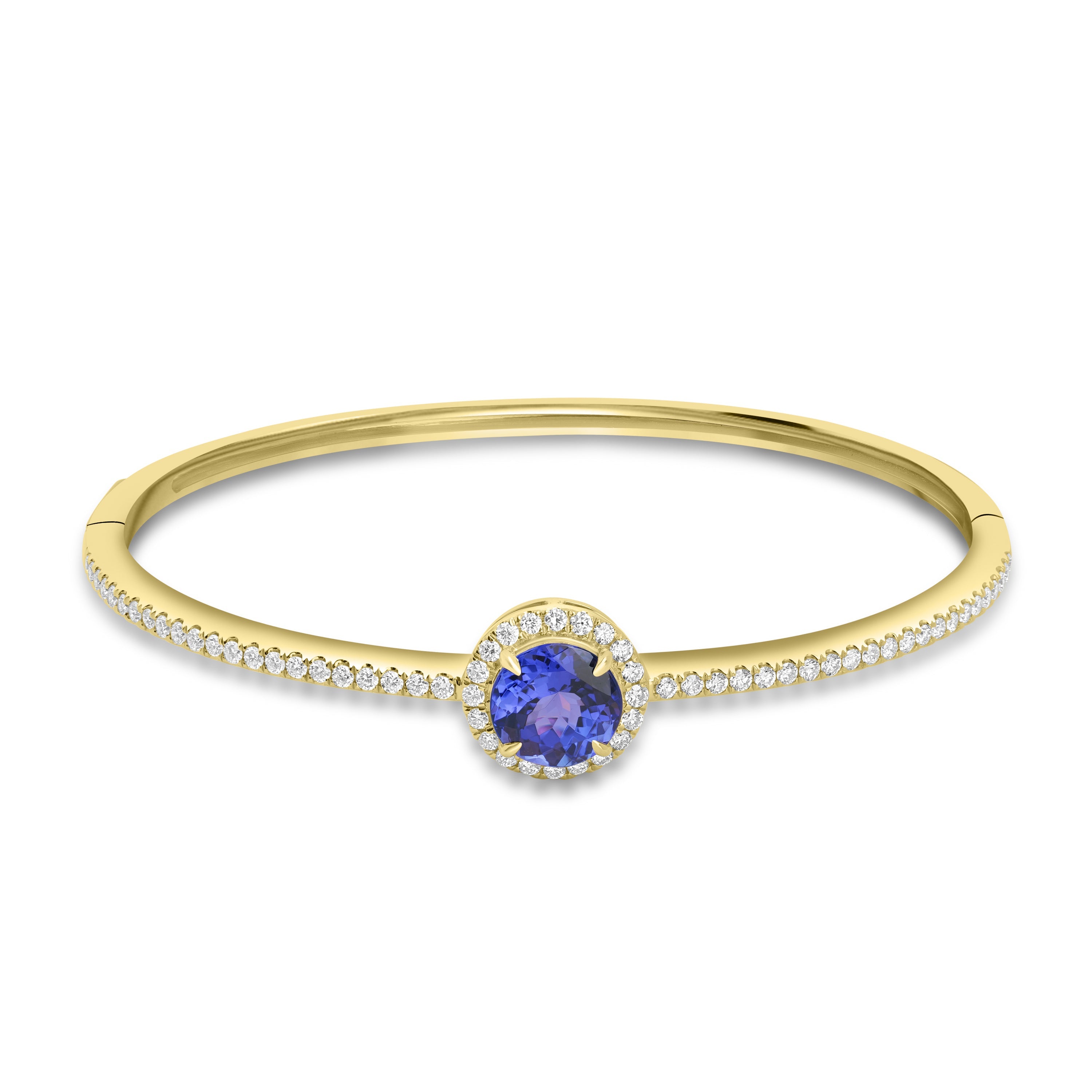 Fashioned to create a dynamic shimmer, this Bangle exudes royalty. The round-cut tanzanite is perfectly studded amidst round Diamonds in 18k Yellow gold to create this unique design. The timeless charm of Tanzanite manifests in this design.