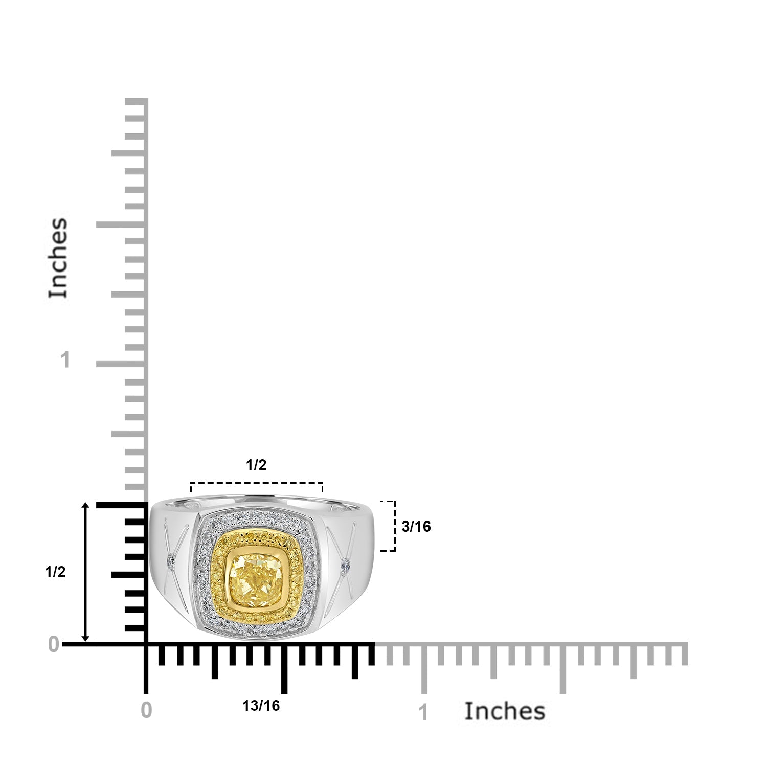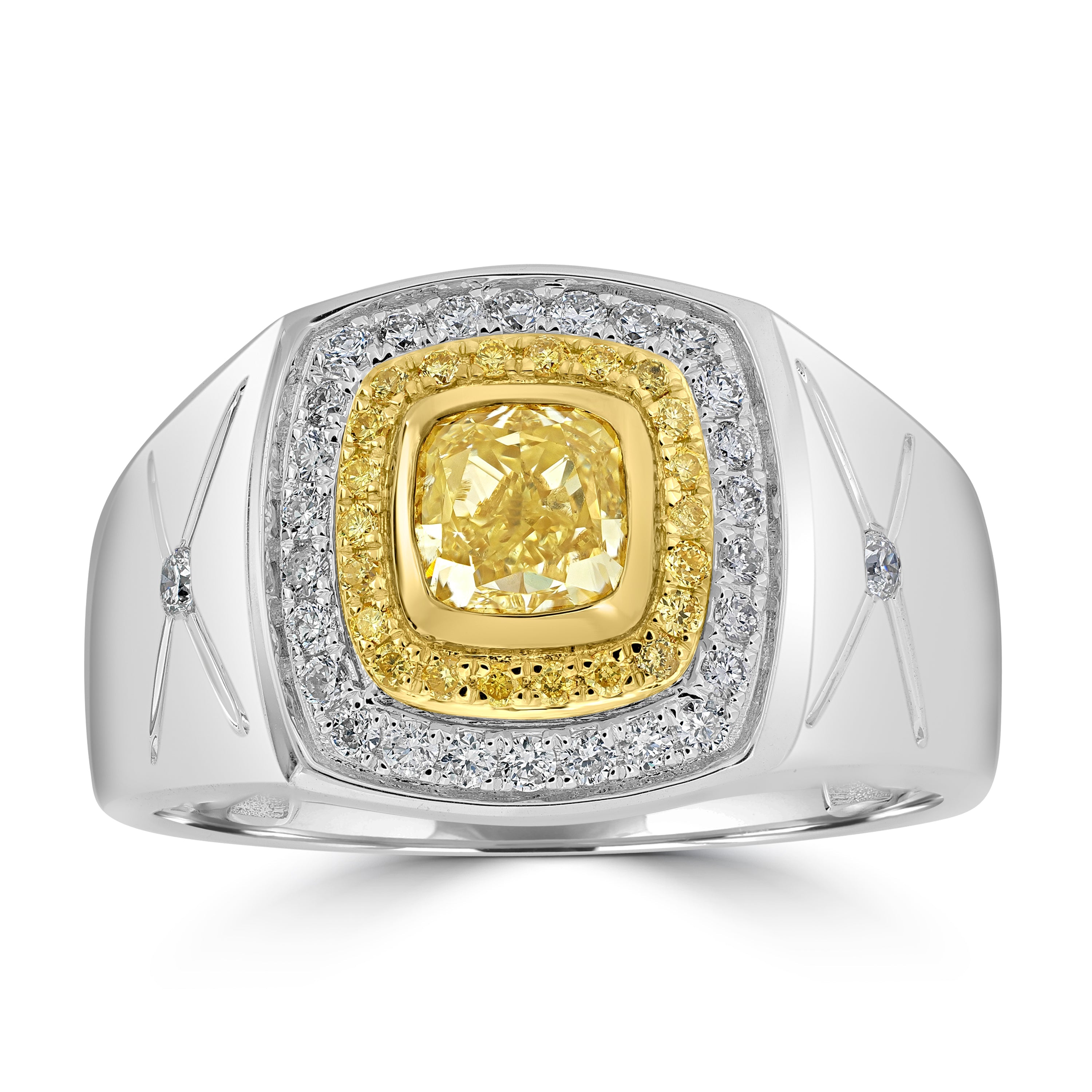 This ring is specially designed by experienced craftsmen and decorated with a cushion-cut yellow Diamond and round Diamonds for added shine and visual appeal. Fashioned with 18k two-tone gold, this ring is sure to give you a dazzling finish to your outfits on special occasions.