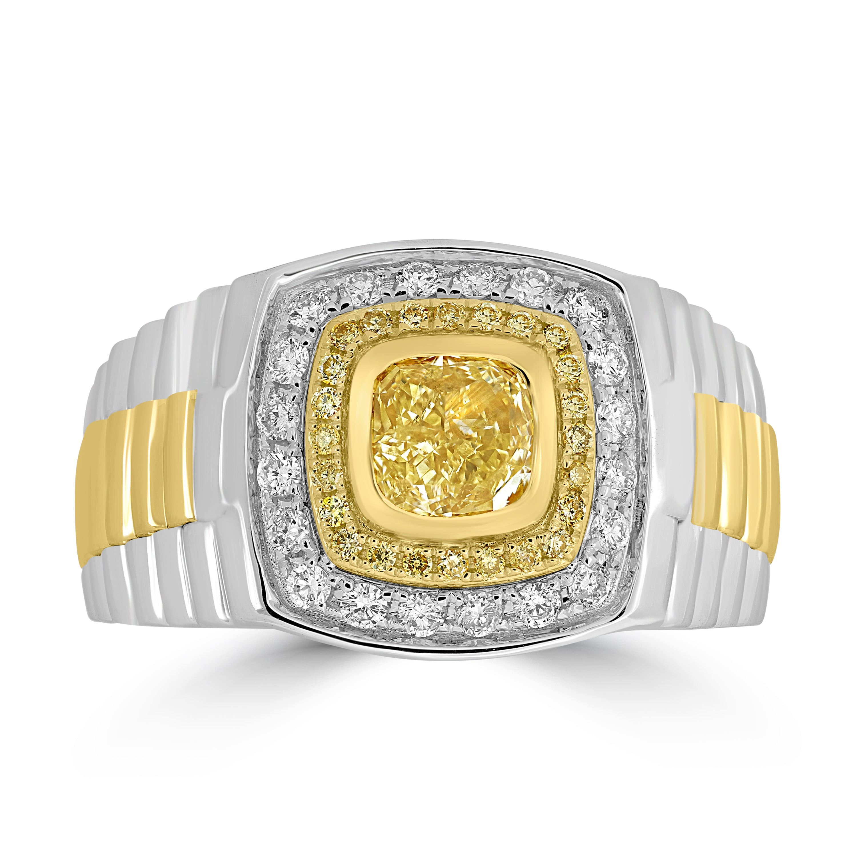 Fashioned of 18k two-tone gold with attention to fine detailing for added charm, this unique ring is the perfect jewelry for any occasion. The cushion-cut yellow Diamond and round Diamonds addens up the ring for a appealing style.