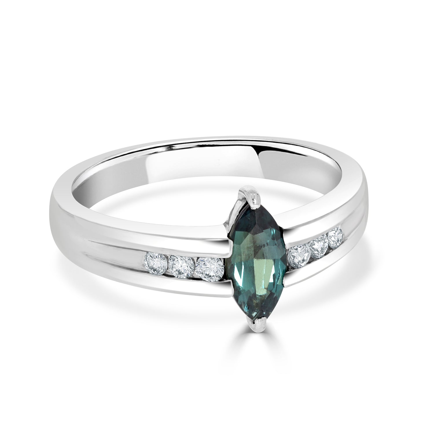 This Beautiful Ring Gives A Luxury Kick With Its Applaudable Design That Is Set With A Marquise Cut Alexandrite And 6 Round Diamonds. Designed Expertly, The Beauty And Grace Of The Pt900 Platinum Will Give You An Exquisite Glow.