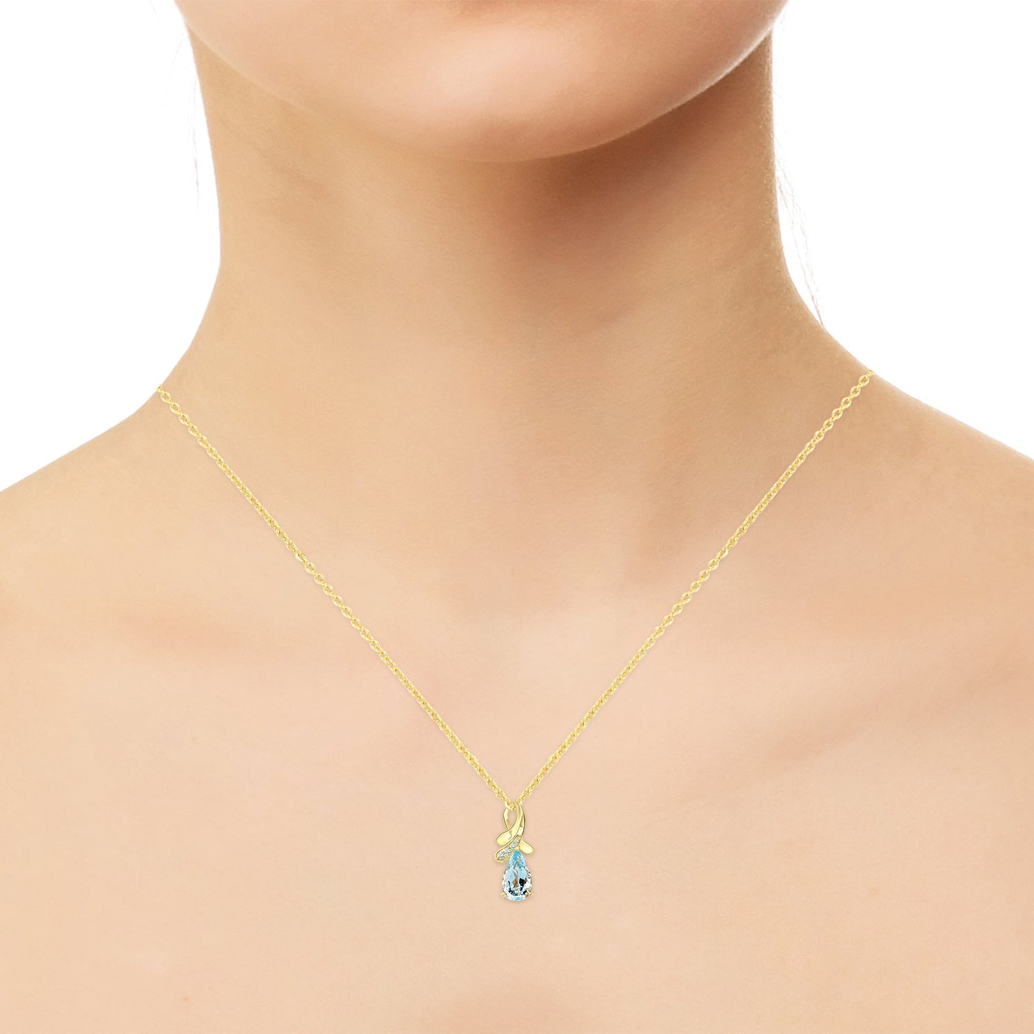 Crafted of 14K yellow gold for added shine, this pendant is set with pear-cut Aquamarine at the center. Surrounded by round-cut Diamonds adds a finishing sparkle that will offer an eye-catchy appeal. This pendant is perfect for giving your attire a sparkling flourish.