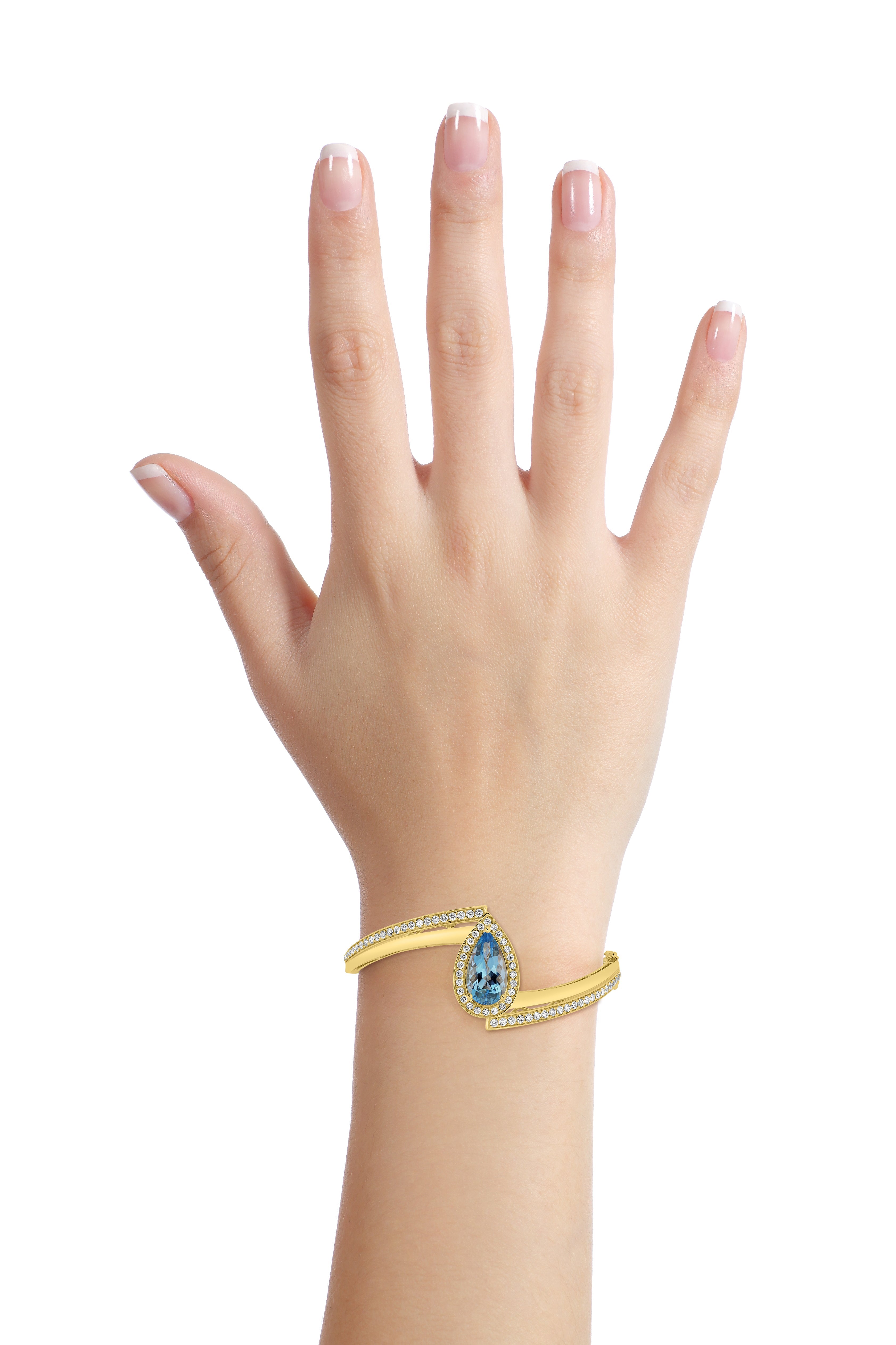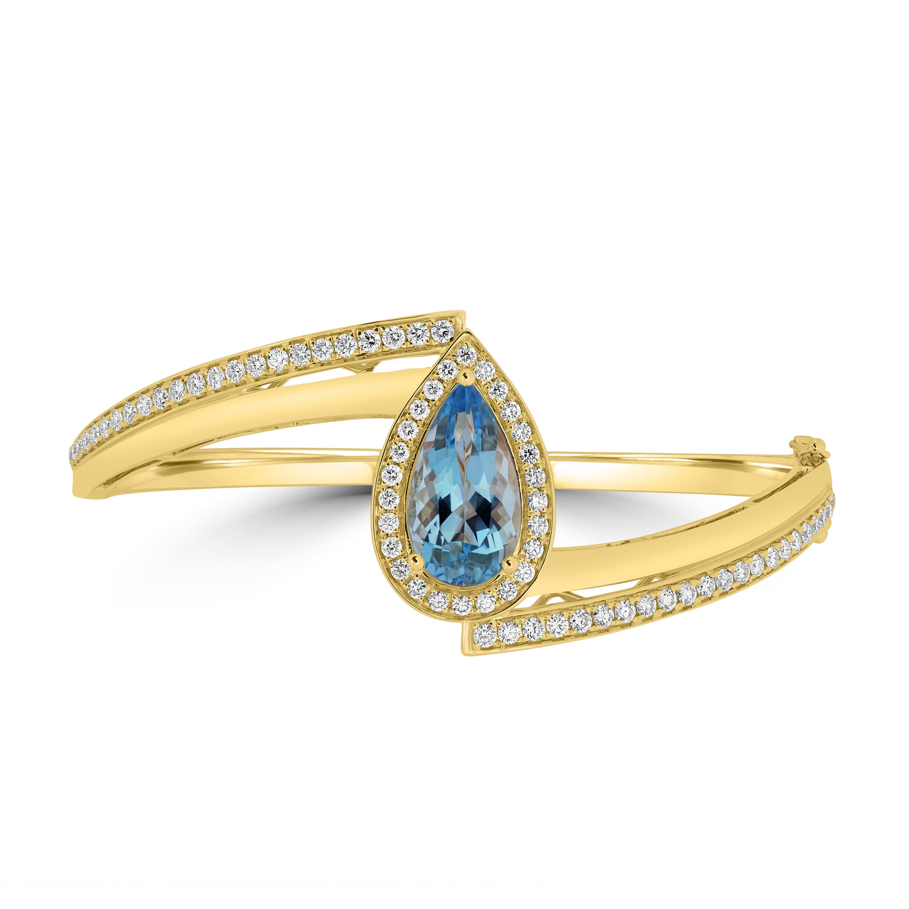 Exuding a modern delight, this attractive bangle that is specially crafted is a contemporary marvel. Designed from 18k yellow gold in an amazing design that is embellished with pear-cut Aquamarine and round diamonds, this magnificent bangle gives a luxury style to your look.