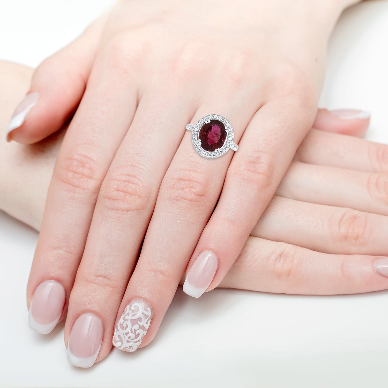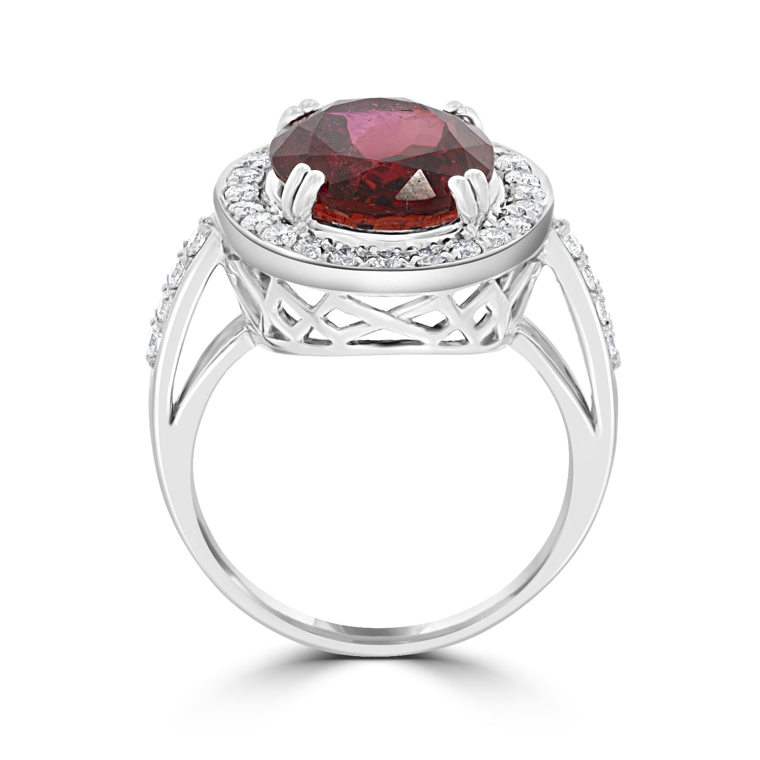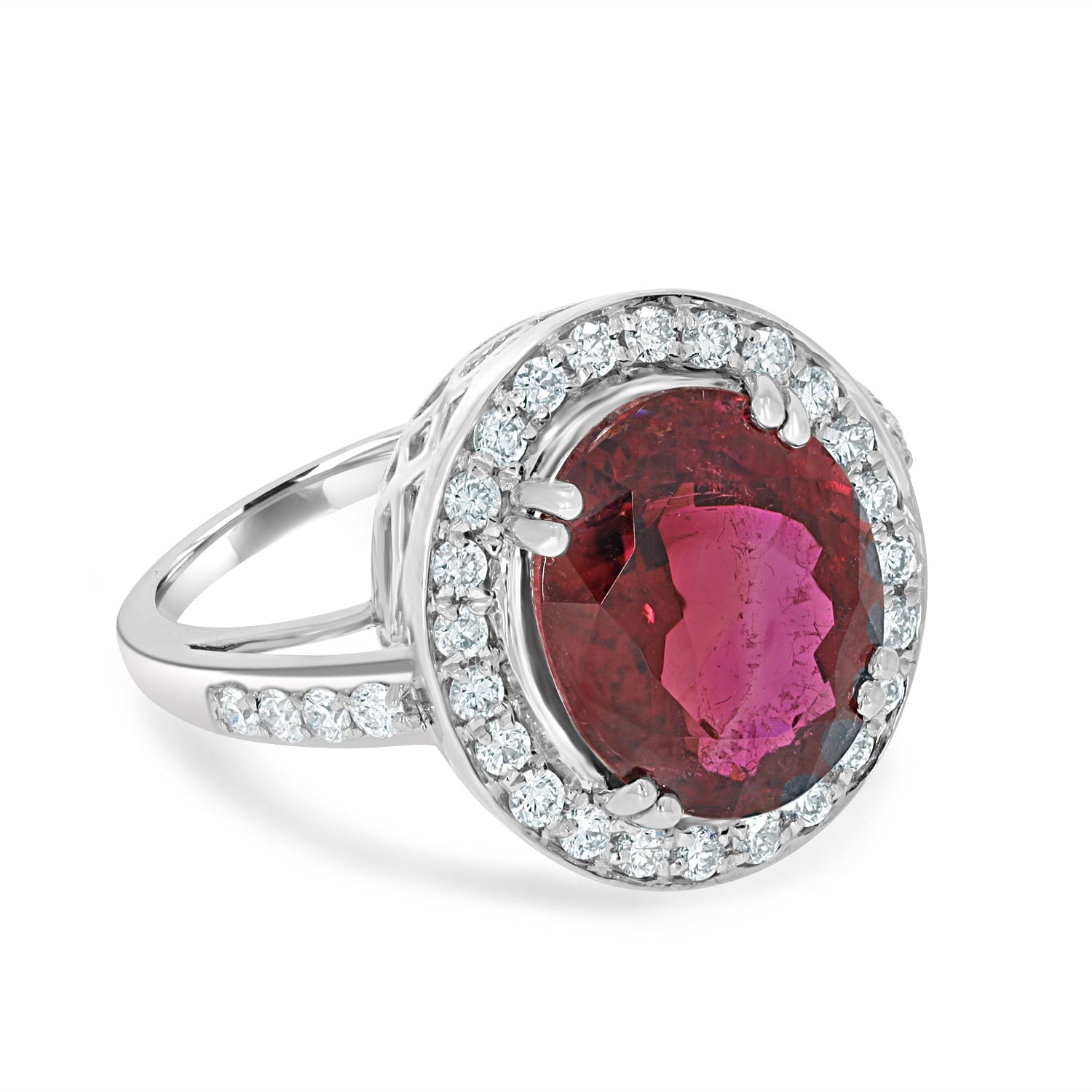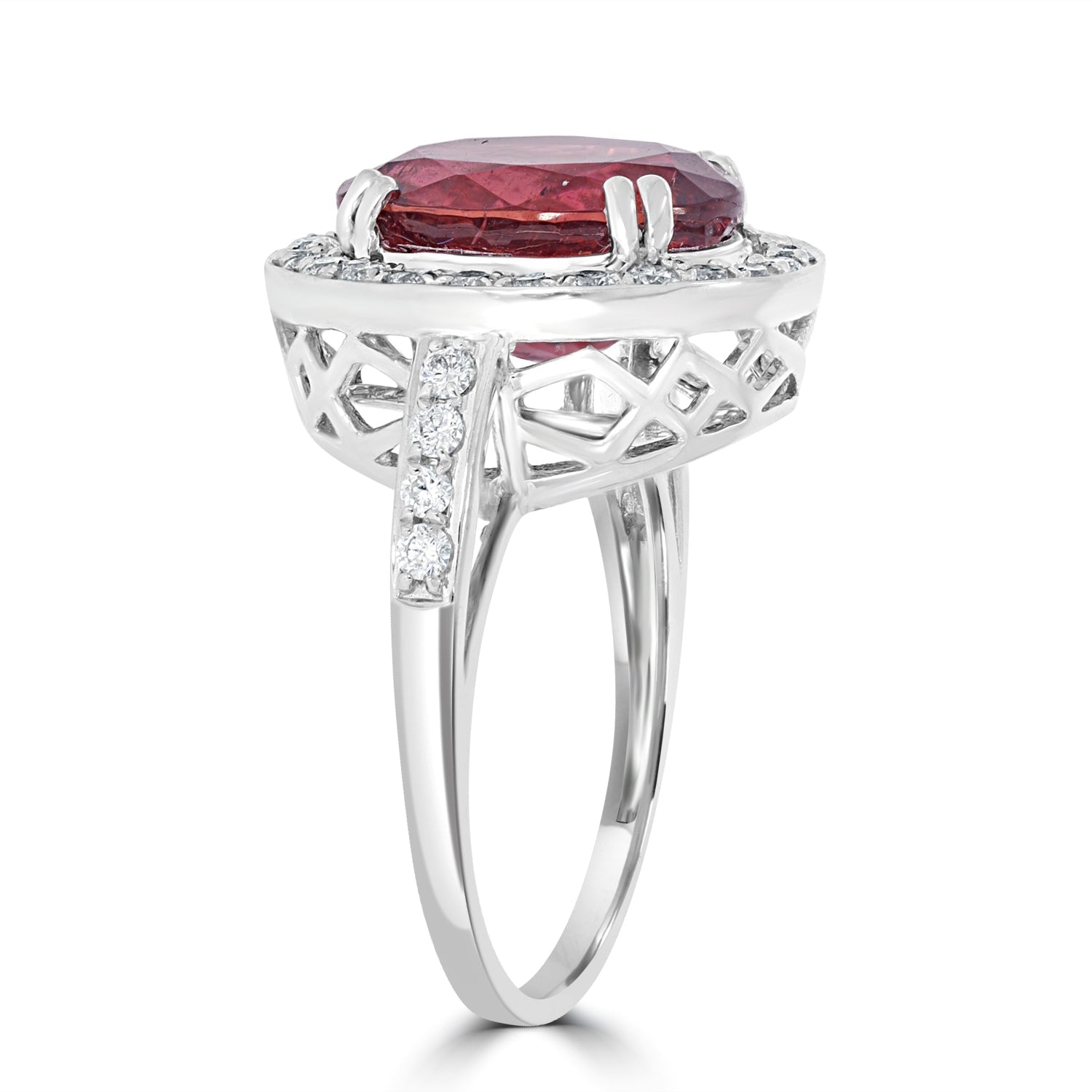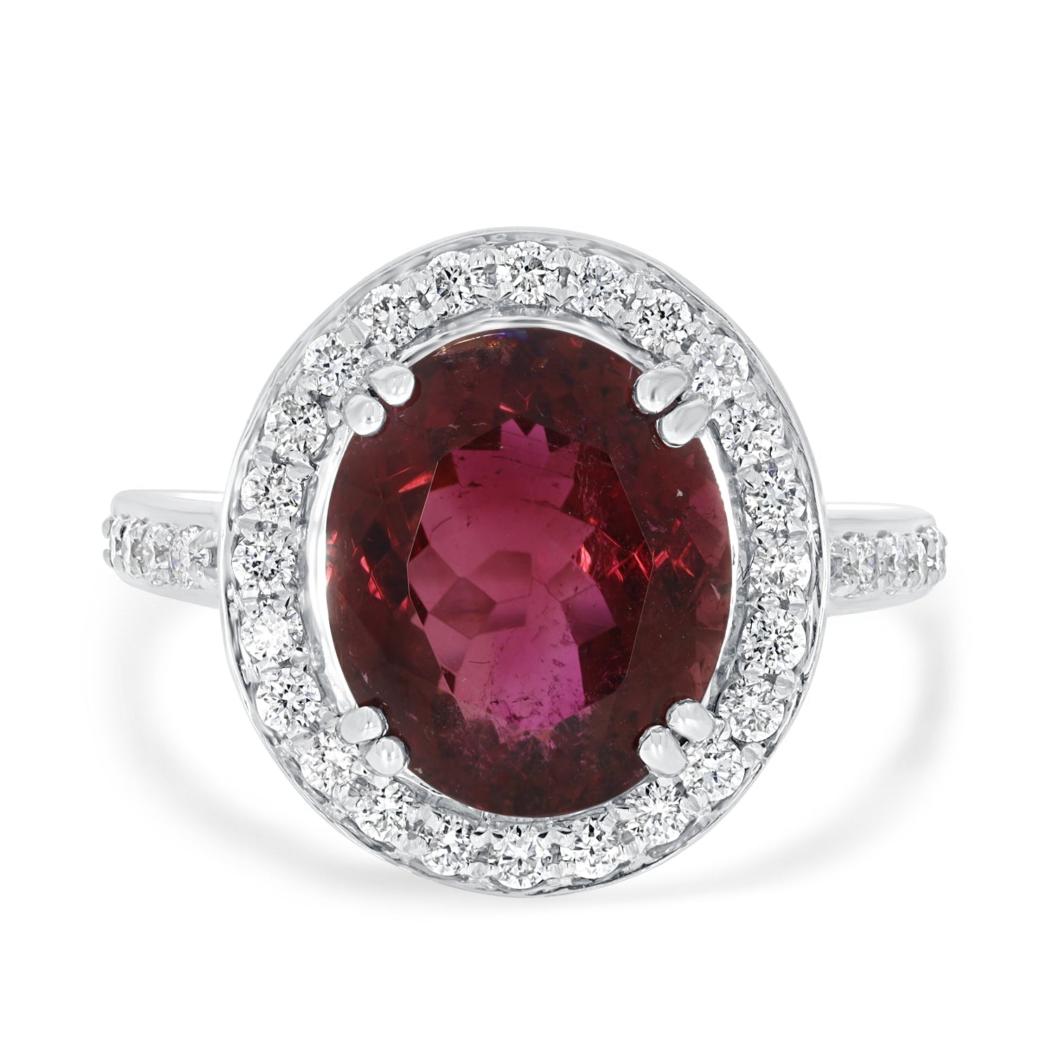 Crafted of 14K white gold, this captivating ring is perfect for any occasion. set with an eye-catching oval cut Tourmaline at the center, this flattering ring is enhanced by dazzling round cut Diamonds that encircle it.